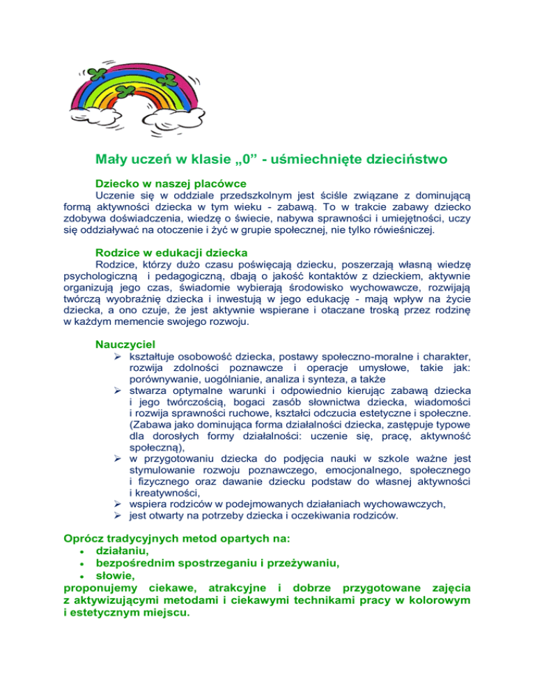 Mały uczeń w klasie „0” - uśmiechnięte dzieciństwo Dziecko w naszej placówce Uczenie się w oddziale przedszkolnym jest ściśle związane z dominującą formą aktywności dziecka w tym wieku - zabawą. To w trakcie zabawy dziecko zdobywa doświadczenia, wiedzę o świecie, nabywa sprawności i umiejętności, uczy się oddziaływać na otoczenie i żyć w grupie społecznej, nie tylko rówieśniczej. Rodzice w edukacji dziecka Rodzice, którzy dużo czasu poświęcają dziecku, poszerzają własną wiedzę psychologiczną i pedagogiczną, dbają o jakość kontaktów z dzieckiem, aktywnie organizują jego czas, świadomie wybierają środowisko wychowawcze, rozwijają twórczą wyobraźnię dziecka i inwestują w jego edukację - mają wpływ na życie dziecka, a ono czuje, że jest aktywnie wspierane i otaczane troską przez rodzinę w każdym memencie swojego rozwoju. Nauczyciel kształtuje osobowość dziecka, postawy społeczno-moralne i charakter, rozwija zdolności poznawcze i operacje umysłowe, takie jak: porównywanie, uogólnianie, analiza i synteza, a także stwarza optymalne warunki i odpowiednio kierując zabawą dziecka i jego twórczością, bogaci zasób słownictwa dziecka, wiadomości i rozwija sprawności ruchowe, kształci odczucia estetyczne i społeczne. (Zabawa jako dominująca forma działalności dziecka, zastępuje typowe dla dorosłych formy działalności: uczenie się, pracę, aktywność społeczną), w przygotowaniu dziecka do podjęcia nauki w szkole ważne jest stymulowanie rozwoju poznawczego, emocjonalnego, społecznego i fizycznego oraz dawanie dziecku podstaw do własnej aktywności i kreatywności, wspiera rodziców w podejmowanych działaniach wychowawczych, jest otwarty na potrzeby dziecka i oczekiwania rodziców. Oprócz tradycyjnych metod opartych na: działaniu, bezpośrednim spostrzeganiu i przeżywaniu, słowie, proponujemy ciekawe, atrakcyjne i dobrze przygotowane zajęcia z aktywizującymi metodami i ciekawymi technikami pracy w kolorowym i estetycznym miejscu.