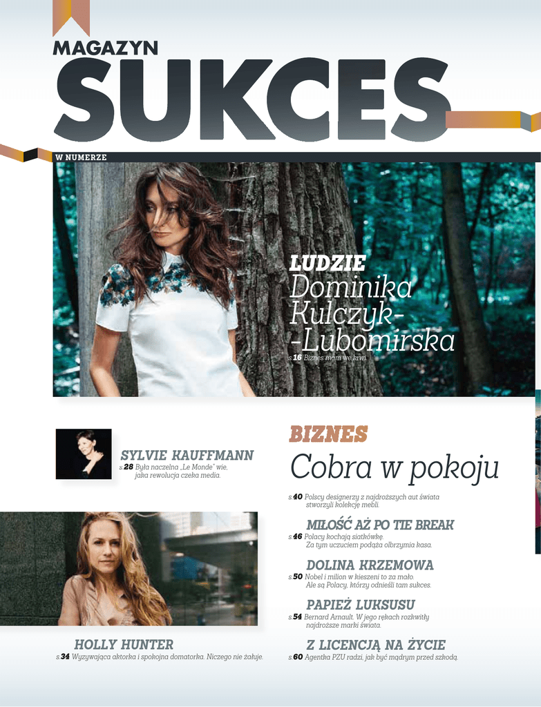 W NUMERZE LUDZIE Dominika Kulczyk-Lubomirska s.16 Biznes mam we krwi. SYLVIE KAUFFMANN S ss.28 Była naczelna „Le Monde" wie, jaka rewolucja czeka media. Cobra w pokoju s.40 Polscy designerzy z najdroższych aut świata stworzyli kolekcję mebli. MIŁOŚĆ AŻ PO TIE BREAK s.46 Polacy kochają siatkówkę. Za tym uczuciem podąża olbrzymia kasa. DOLINA KRZEMOWA s.50 Nobel i milion w kieszeni to za mało. Ale są Polacy, którzy odnieśli tam sukces. PAPIEŻ LUKSUSU s.54 Bernard Arnault. W jego rękach rozkwitły najdroższe marki świata. HOLLY HUNTER s.34 Wyzywająca aktorka i spokojna domatorka. Niczego nie żałuje. Z LICENCJĄ NA ŻYCIE s.60 Agentka PZU radzi, jak być mądrym przed szkodą. Prof. Pio tr SIERP IEŃ 20 13 S I E R P I EŃ 20 1 3 Monca rz nr SIERPIE8/274 2013 cena (w tym 7,90 zł 8% VAT) Nasz cz w Dolin łowiek ie Krze mowej Polski sport ni e polo dla elite tylko NA OKŁADCE: DOMINIKA KULCZYK-LUBOMIRSKA FOT. KRZYSZTOF OPALIŃSKI Dominik a Kulc -Lub zykBizneosmirska w k mam 19-07-SU -1-W-001 -KO.indd 1 Polo polonais s.66 Zawodowcem może być każdy. Wystarczy, że kupi drużynę. LONDYN À LA CARTE s.72 Brytyjska stolica kusi dziś smakoszy z całego świata. NA KAWĘ DO MRUCZKA s.78 Cat cafes. Idealne rozwiązanie dla zapracowanych miłośników zwierząt. TAJEMNICE KABAŁY s.82 Karen Berg. Dzięki niej czerwone nitki na nadgarstkach nosi pół świata. KINO KONESERÓW s.102 Domek z kart. 13-07-12 16:22 MUZYKA s.104 Impreza musi trwać dalej. KSIĄŻKI s.106 Jesteśmy na wczasach. TEATR I SZTUKA s.108 Bruno Schulz patrzy. MODA s.110 Kimono, kapelusz i bralet. TRENDY. ONA I ON s.116 Zwolnij, szkoda lata. URODA DAMSKA s.118 Uwaga: nadchodzą lata 80. URODA MĘSKA s.120 Prawdziwy mężczyzna jest unisex. AUTO AFRYKA KYDRYŃSKIEGO s.122 Sport made in Japan. s.86 Okrucieństwo spotyka tu dobroć, a starcie wciąż jest nierozegrane. . PODRÓŻE s.96 Na szlaku szaleństwa. s.10 HATALSKA s.64 SIKORSKI s.12 BOROWIK s.124 SZCZELINA s.14 NIEZGODA s.128 NA KONIEC...