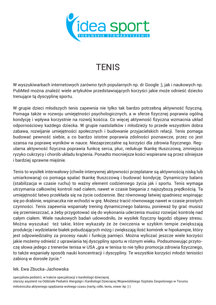 TENIS W wyszukiwarkach internetowych zarówno tych popularnych np. dr Google :), jak i naukowych np. PubMed można znaleźć wiele artykułów przedstawiających korzyści jakie może odnieść dziecko trenujące tą dyscyplinę sportu. W grupie dzieci młodszych tenis zapewnia nie tylko tak bardzo potrzebną aktywność fizyczną. Pomaga także w rozwoju umiejętności psychologicznych, a w sferze fizycznej poprawia ogólną kondycję i wpływa korzystnie na rozwój kośćca. Co więcej aktywność fizyczna wzmacnia układ odpornościowy każdego dziecka. W grupie nastolatków i młodzieży to przede wszystkim dobra zabawa, rozwijanie umiejętności społecznych i budowanie przyjacielskich relacji. Tenis pomaga budować pewność siebie, a co bardzo istotne poprawia zdolności poznawcze, przez co jest szansa na poprawę wyników w nauce. Niezaprzeczalne są korzyści dla zdrowia fizycznego. Regularna aktywność fizyczna poprawia funkcę serca, płuc, redukuje tkankę tłuszczową, zmniejsza ryzyko cukrzycy i chorób układu krążenia. Ponadto mocniejsze kości wspierane są przez silniejsze i bardziej sprawne mięśnie. Tenis to wysiłek interwałowy (chwile intenywnej aktywności przeplatane są aktywnością niską lub umiarkowaną) co pomaga spalać tkankę tłuszczową i budować kondycję. Dynamiczny balans (stabilizacja w czasie ruchu) to ważny element codziennego życia jak i sportu. Tenis wymaga utrzymania całkowitej kontroli nad ciałem, nawet w czasie biegania z najszybszą prędkością. Ta umiejętność łatwo przekłada się na życie codziennie. Bez równowagi łatwiej spadniesz wspinając się po drabinie, wspinaczka nie wchodzi w grę. Możesz tracić równowagę nawet w czasie prostych czynności. Tenis zapewnia wspaniały trening dynamicznego balansu, ponieważ by grać musisz się przemieszczać, a żeby przygotować się do wykonania uderzenia musisz rozwijać kontrolę nad całym ciałem. Wiele naukowych badań udowodniło, że wysiłek fizyczny łagodzi objawy stresu. Można wyszukać też takie, które wykazały że że ćwiczenia w szybkm tempie zwiększają produkcję i wydzielanie białek pobudzających mózg i zwiększają ilość komórek w hipokampie, który jest odpowiedzialny za procesy nauki i funkcję pamięci. Można wyliczać jeszcze wiele korzyści jakie możemy odnieść z uprawiania tej dyscypliny sportu w róznym wieku. Podsumowując przytoczę słowa jedego z trenerów tenisa w USA „gra w tenisa to nie tylko promocja zdrowia fizycznego, to także wspaniały sposób nauki koncentracji i dyscypliny. Te wszystkie korzyści młodzi tenisiści zabiorą w dorosłe życie.” lek. Ewa Zbucka-Jachowska specjalista pediatrii, w trakcie specjalizacji z kardiologii dziecięcej starszy asystent na Oddziale Pediatrii Alergolgii i Kardiologii Dziecięcej Wojewódzkiego Szpitala Zespolonego w Toruniu miłośniczka aktywnego spędzania wolnego czasu (narty, rolki, tenis, rower itp :) )