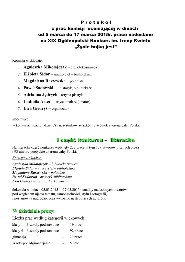 Protokół z prac komisji oceniającej w dniach od 5 marca do 17 marca 2015r. prace nadesłane na XIX Ogólnopolski Konkurs im. Ireny Kwinto „Życie bajką jest” Komisja w składzie: 1. Agnieszka Mikołajczak – bibliotekoznawca 2. Elżbieta Sidor – nauczyciel – bibliotekarz 3. Magdalena Raszewska – polonista 4. Paweł Sadowski – historyk, bibliotekarz 5. Adrianna Jędrych – artysta plastyk 6. Ludmiła Arter – artysta malarz (amator) 7. Ewa Giedryś – organizator informuje: w konkursie wzięło udział 681 uczestników ze szkół i placówek z terenu całej Polski. I część konkursu – literacka Na literacką część konkursu wpłynęły 232 prace w tym 139 utworów pisanych prozą i 93 utwory poetyckie z terenu całej Polski. Komisja w składzie: Agnieszka Mikołajczak – bibliotekoznawca Elżbieta Sidor – nauczyciel – bibliotekarz Magdalena Raszewska – polonista Paweł Sadowski - historyk, bibliotekarz Ewa Giedryś – organizator konkursu dokonała w dniach 05.03.2015 – 17.03.2015r. analizy nadesłanych utworów pod względem ujęcia tematu, samodzielności, stylu i ortografii, i postanowiła nagrodzić oraz wyróżnić następujących autorów: W dziedzinie prozy: Liczba prac według kategorii wiekowych: klasy 1 – 3 szkoły podstawowe – 19 prac klasy 4 – 6 szkoły podstawowe – 92 prace gimnazja – 23 prace szkoły ponadgimnazjalne – 5 prac szkoła podstawowa klasy 1 – 3 NAGRODY: 1. Aneta Kozłowska – SP 9 – Olsztyn za utwór „Eliza i sarny” 2. Kacper Mazur – SP 9 – Olsztyn za utwór „Zaczarowany garnek” 3. Julia Przybyszewska – SP Lubomino za utwór „Żabusia i Żabolinek” WYRÓŻNIENIE: 1. Jakub Michałowski – SP 1 – Lidzbark Warmiński za utwór Bajka o„Wujku Dobra Rada” szkoła podstawowa klasy 4 – 6 LAUREAT: 1. Paweł Nowak – SP – Mikołajki Pomorskie za utwór „Dziki bratek” NAGRODA: 1. Gabriela Woltman – SP 34 – Olsztyn za utwór „Tajemnica Feniksa” WYRÓŻNIENIA: 1. Maja Dudek – SP 30 – Olsztyn za utwór „Księżniczka Peonia” 2. Wiktor Prado – ZSP SP 4 – Lidzbark Warmiński za utwór „Strażnik lasu” 3. Karolina Prostko – SP 34 – Olsztyn za utwór „Studnia przy źródłach Łyny” 4. Sylwia Lipczak PSP – Kłębowo za utwór „Złoty buk” gimnazja: LAUREAT: 1. Urszula Kowalczyk – Gimnazjum – Lubomino za utwór „Historia Wolnicy” NAGRODY: 1. Piotr Zochniak – Gimnazjum – Rasy za utwór „Baśń o dzielnym księciu Eryku” 2. Marzena Kruszyńska – Gimnazjum – Mikołajki Pomorskie za utwór „Dobre serce, magiczny czas” WYRÓŻNIENIA: 1. Kamila Sadurska – SP– Gimnazjum – Rasy za utwór „O nauczce, którą duży zdobył od małego” 2. Aleksandra Kociołek – SP – Gimnazjum – Rasy za utwór„Złoty sierociniec” szkoły ponadgimnazjalne: NAGRODA: 1. Edyta Aleksandrowicz – ZSiPO – Lidzbark Warmiński za utwór „Tajemnica Mrocznego Lasu” WYRÓŻNIENIE: 1. Patrycja Dobiesz – ZSZ TE – Lidzbark Warmiński za utwór „ Warmianka Miłości” W dziedzinie poezji: Liczba prac zgodnie z kategoriami wiekowymi przedstawia się następująco: klasy 1 – 3 szkoły podstawowe klasy 4 – 6 szkoły podstawowe gimnazja szkoły ponadgimnazjalne – – – – 64 prace 27 prac 2 prace nie wpłynęła żadna praca W dziedzinie poezji nagrodzono i wyróżniono następujących autorów: w kategorii szkoły podstawowe klasy 1 – 3 LAUREAT: 1. Lidia Paleń – SP 9 – Olsztyn za wiersz „Marzenia” NAGRODY: 1. Anastazja Zajchowska – SP1 – Lidzbark Warmiński za wiersz „Las” 2. Maciej Markowski – SP 9 – Olsztyn za wiersz „Liść” 3. Hubert Niedźwiedzki – SP1 – Lidzbark Warmiński za wiersz „Urodziny” 4. Kacper Kozik – SP – Szymonowo za wiersz „***” w kategorii szkoły podstawowe klasy 4 – 6 LAUREAT: 1. Sandra Mickiewicz – SP1 – Lidzbark Warmiński za wiersz „Konie z chmurek” NAGRODA: 1. Hubert Łużpiński – SP 30 – Olsztyn za wiersz „Myśli” WYRÓŻNIENIA: 1. Adela Joanna Górecka – SP1 – Lidzbark Warmiński za wiersz „Chwalimy często...” 2. Zuzanna Skrzypińska – SP 9 – Olsztyn za wiersz „Sowa kolorowa” w kategorii gimnazja LAUREAT: 1. Angelika Małecka – Gimnazjum – Rasy za wiersz „List do gwiazd” NAGRODA: 1. Paweł Czerwiński – Gimnazjum nr 1 – Lidzbark Warmiński za wiersz „Warmińskie baśnie” NAGRODĘ SPECJALNĄ w literackiej części konkursu otrzymuje JULIA GRĘBOWSKA z Gimnazjum w Mikołajkach Pomorskich za balladę „O Janku i jego miłości do matki” Wszystkim autorom wspaniałych utworów serdecznie gratulujemy i życzymy wielu twórczych działań w tak trudnej dziedzinie jaką jest przenoszenie swoich myśli na papier. Komisja w składzie: II część konkursu – plastyka Adrianna Jędrych – plastyk Ludmiła Arter – artysta malarz (amator) Ewa Giedryś – organizator konkursu informuje: na część plastyczną konkursu wpłynęło 449 prac plastycznych i grafik komputerowych ze szkół i placówek z terenu kraju. W podziale na kategorie wiekowe przedstawia się następująco: przedszkola klasy 1 – 3 (szkoły podstawowe) klasy 4 – 6 (szkoły podstawowe) gimnazja szkoły ponadgimnazjalne szkoły specjalne grafika komputerowa – – – – – – – 163 prace 183 prace 80 prac 12 prac 2 prace 3 prace 6 prac Komisja w dniu 13.03.2015r. dokonała wyboru najciekawszych ilustracji do jednej z najstarszych bajek pani Ireny Kwinto „O synku Jasinku i złotym ziarenku” i przyznała nagrody następującym młodym artystom: Przedszkola NAGRODY: 1. 2. 3. 4. 5. Natalia Wróblewska lat 6 – Przedszkole „Puchatek” Lidzbark Warmiński Nikola Wasilonok lat 5 – Przedszkole „Puchatek” Lidzbark Warmiński Zuzia Szafałowicz lat 5 – MDK Lidzbark Warmiński Jaś Gawliński lat 6– MDK Płock Julia Kuna lat 6 – MDK Płock WYRÓŻNIENIA: 1. 2. 3. 4. 5. 6. Zuzia Andrukajtis lat 5 – Przedszkole „Puchatek” Lidzbark Warm