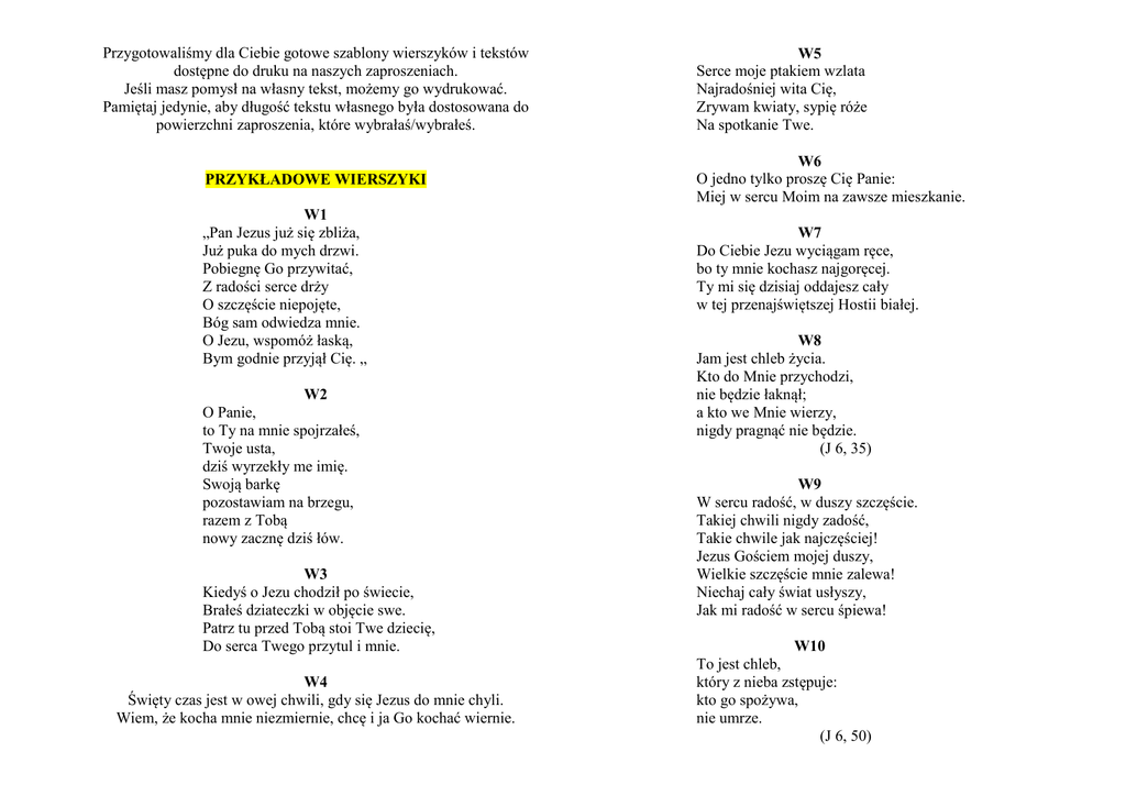 Przygotowaliśmy dla Ciebie gotowe szablony wierszyków i tekstów dostępne do druku na naszych zaproszeniach. Jeśli masz pomysł na własny tekst, możemy go wydrukować. Pamiętaj jedynie, aby długość tekstu własnego była dostosowana do powierzchni zaproszenia, które wybrałaś/wybrałeś. PRZYKŁADOWE WIERSZYKI W1 „Pan Jezus już się zbliża, Już puka do mych drzwi. Pobiegnę Go przywitać, Z radości serce drży O szczęście niepojęte, Bóg sam odwiedza mnie. O Jezu, wspomóż łaską, Bym godnie przyjął Cię. „ W2 O Panie, to Ty na mnie spojrzałeś, Twoje usta, dziś wyrzekły me imię. Swoją barkę pozostawiam na brzegu, razem z Tobą nowy zacznę dziś łów. W3 Kiedyś o Jezu chodził po świecie, Brałeś dziateczki w objęcie swe. Patrz tu przed Tobą stoi Twe dziecię, Do serca Twego przytul i mnie. W4 Święty czas jest w owej chwili, gdy się Jezus do mnie chyli. Wiem, że kocha mnie niezmiernie, chcę i ja Go kochać wiernie. W5 Serce moje ptakiem wzlata Najradośniej wita Cię, Zrywam kwiaty, sypię róże Na spotkanie Twe. W6 O jedno tylko proszę Cię Panie: Miej w sercu Moim na zawsze mieszkanie. W7 Do Ciebie Jezu wyciągam ręce, bo ty mnie kochasz najgoręcej. Ty mi się dzisiaj oddajesz cały w tej przenajświętszej Hostii białej. W8 Jam jest chleb życia. Kto do Mnie przychodzi, nie będzie łaknął; a kto we Mnie wierzy, nigdy pragnąć nie będzie. (J 6, 35) W9 W sercu radość, w duszy szczęście. Takiej chwili nigdy zadość, Takie chwile jak najczęściej! Jezus Gościem mojej duszy, Wielkie szczęście mnie zalewa! Niechaj cały świat usłyszy, Jak mi radość w sercu śpiewa! W10 To jest chleb, który z nieba zstępuje: kto go spożywa, nie umrze. (J 6, 50) TEKSTY ZAPROSZEŃ T4 T1 Wraz z moimi Rodzicami serdecznie zapraszam Sz. P. Annę i Jana Kowalskich na uroczyste przyjęcie przeze mnie Sakramentu Pierwszej Komunii Świętej, które odbędzie się [data i godzina] w kościele [nazwa kościoła i miejscowość]. [imię Dziecka] Pragnąc wspólnie radować się z uroczystości przyjęcia Sakramentu Pierwszej Komunii Świętej serdecznie zapraszam Sz. P. Annę i Jana Kowalskich do udziału we Mszy Świętej, która odbędzie się [data i godzina] w kościele [nazwa kościoła i miejscowość]. [imię Dziecka] T5 T2 Mamy zaszczyt zaprosić Sz. P. Annę i Jana Kowalskich na uroczystość pierwszego pełnego uczestnictwa we Mszy Świętej naszej córki/ naszego syna [imię Dziecka] która odbędzie się [data i godzina] w kościele [nazwa kościoła i miejscowość]. Rodzice T3 Z wielką radością pragnę zaprosić Sz. P. Annę i Jana Kowalskich na uroczystość przyjęcia Pierwszej Komunii Świętej przez [imię Dziecka], która odbędzie się [data i godzina] w kościele [nazwa kościoła i miejscowość]. Dnia [data i godzina] w kościele [nazwa kościoła i miejscowość] nasza córka/nasz syn [imię Dziecka] przyjmie Sakrament Komunii Świętej Na uroczystość serdecznie zapraszamy Sz. P. Annę i Jana Kowalskich Rodzice T7 [imię Dziecka] wraz z Rodzicami z wielką przyjemnością pragnie zaprosić Sz. P. Annę i Jana Kowalskich na uroczystość przyjęcia Sakramentu I Komunii Świętej która odbędzie się [data i godzina] w kościele [nazwa kościoła i miejscowość]. TEKSTY O PRZYJĘCIU P1 Miło nam będzie po uroczystości w kościele ugościć wszystkich w naszym domu. P2 Po uroczystości miło nam będzie gościć W. P. na przyjęciu w restauracji [nazwa lokalu i adres] P3 Po nabożeństwie zapraszamy serdecznie na uroczysty obiad do [nazwa lokalu i adres]. P4 Wspólnie uczcimy ten dzień podczas przyjęcia, które odbędzie się w [nazwa lokalu i adres] P6 Po Mszy Świętej zapraszamy na obiad do [nazwa lokalu i adres] P7 Po uroczystości serdecznie zapraszamy na przyjęcie komunijne do [nazwa lokalu i adres] POTWIERDZENIE PRZYBYCIA Prosimy o potwierdzenie przybycia do dnia [data] pod numerem telefonu [nr telefonu]