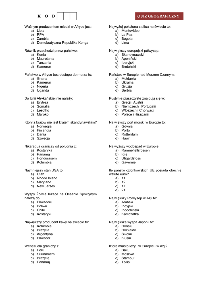 K O D QUIZ GEOGRAFICZNY Ważnym producentem miedzi w Afryce jest: a) Libia b) RPA c) Zambia d) Demokratyczna Republika Konga Najwyżej położona stolica na świecie to: a) Montevideo b) La Paz c) Bogota d) Lima Równik przechodzi przez państwo: a) Kenia b) Mauretania c) Tanzania d) Kamerun Największy europejski półwysep: a) Skandynawski b) Apeniński c) Iberyjski d) Bretoński Państwo w Afryce bez dostępu do morza to: a) Ghana b) Kamerun c) Nigeria d) Uganda Państwo w Europie nad Morzem Czarnym: a) Mołdawia b) Ukraina c) Gruzja d) Serbia Do Unii Afrykańskiej nie należy: a) Erytrea b) Somalia c) Lesotho d) Maroko Pustynie piaszczyste znajdują się w: a) Grecji i Austrii b) Niemczech i Portugalii c) Włoszech i Chorwacji d) Polsce i Hiszpanii Który z krajów nie jest krajem skandynawskim? a) Norwegia b) Finlandia c) Dania d) Szwecja Największy port morski w Europie to: a) Gdynia b) Porto c) Rotterdam d) Hawr Nikaragua graniczy od południa z: a) Kostaryką b) Panamą c) Hondurasem d) Kolumbią Najwyższy wodospad w Europie a) Ramnefjellsfossen b) Kile c) Utigardsfoss d) Gavernie Najmniejszy stan USA to: a) Utah b) Rhode Island c) Maryland d) New Jersey Ile państw członkowskich UE posiada obecnie walutę euro? a) 11 b) 12 c) 17 d) 21 Wyspy Żółwie leżące na Oceanie Spokojnym należą do: a) Ekwadoru b) Boliwii c) Chile d) Kostaryki Największy Półwysep w Azji to: a) Arabski b) Indyjski c) Indochiński d) Kamczatka Największy producent kawy na świecie to: a) Kolumbia b) Brazylia c) Argentyna d) Ekwador Największa wyspa Japonii to: a) Honsiu b) Hokkaido c) Sikoku d) Kiusiu Wenezuela graniczy z: a) Peru b) Surinamem c) Brazylią d) Panamą Które miasto leży i w Europie i w Azji? a) Baku b) Moskwa c) Stambuł d) Tbilisi Nikozja jest stolicą: a) Jordanii b) Syrii c) Malty d) Cypru …………………………………………………… Na ile stanów podzielona jest Australia: a) 5 b) 6 c) 9 d) 12 mają Które z pasm górskich nie leży w Ameryce Północnej? a) Góry Mackenzie b) Góry Brooksa c) Góry Stanowe d) Góry Selwyn ……………………………………………………... …………………………………………………… Podaj nazwy 3 państw, które na swojej fladze barwy panarabskie (biały, zielony, czerwony i czarny) ……………………………………………………... ……………………………………………………... Podaj stolice państw: Serbia…………………………………………….. Urugwaj………………………………………….. Pierwsza Polka, która stanęła na Antarktydzie to: a) b) c) d) M. Wojciechowska M. Popińska A. Centkiewicz A. Kołakowska Legenda o Latającym Holendrze związana jest z: a) b) c) d) Zatoką Meksykańską Morzem Karaibskim Morzem Sargassowym Morzem Arafura Tajlandia………………………………………….. Libia……………………………………………… RPA………………………………………………. Ile gwiazd znajduje się na fladze Stanów Zjednoczonych i co symbolizuje ta liczba? …………………………………………………… …………………………………………………… PYTANIA KRÓTKIEJ ODPOWIEDZI …………………………………………………… Największa na świecie wyspa należy do: ………………………………………………….. ……………………………… (Nazwa państwa) Podaj procesy geologiczne, w wyniku których Wymień 6 państw, które przystąpiły do UE po powstały: 2003 roku: Himalaje…………………………………………. …………………………………………………… Wielki Kanion……………………………………. …………………………………………………… Rów Mariański………………………………….. …………………………………………………… Wyżyna Krakowsko – Częstochowska……… …………………………………………………… ……………………………………………………. Wyspy Galapagos……………………………… Podaj ustrój polityczny Australii …………………………………………………… Razem punktów:…………../50 Na świecie istnieją dwa państwa podwójnie śródlądowe, czyli takie, które nie mają dostępu Komisja: do morza, a ponadto żaden z ich sąsiadów ………………………………….…………............. również nie ma dostępu do morza. Wymień te ........................................................................... państwa. ...........................................................................