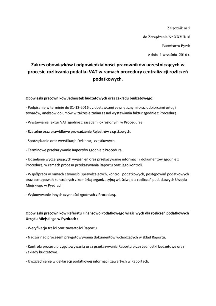 Załącznik nr 5 do Zarządzenia Nr XXVII/16 Burmistrza Pyzdr z dnia 1 września 2016 r. Zakres obowiązków i odpowiedzialności pracowników uczestniczących w procesie rozliczania podatku VAT w ramach procedury centralizacji rozliczeń podatkowych. Obowiązki pracowników Jednostek budżetowych oraz zakładu budżetowego: - Podpisanie w terminie do 31-12-2016r. z dostawcami zewnętrznymi oraz odbiorcami usług i towarów, aneksów do umów w zakresie zmian zasad wystawiania faktur zgodnie z Procedurą. - Wystawiania faktur VAT zgodnie z zasadami określonymi w Procedurze. - Rzetelne oraz prawidłowe prowadzenie Rejestrów cząstkowych. - Sporządzanie oraz weryfikacja Deklaracji cząstkowych. - Terminowe przekazywanie Raportów zgodnie z Procedurą. - Udzielanie wyczerpujących wyjaśnień oraz przekazywanie informacji i dokumentów zgodnie z Procedurą, w ramach procesu przekazywania Raportu oraz jego kontroli. - Współpraca w ramach czynności sprawdzających, kontroli podatkowych, postępowań podatkowych oraz postępowań kontrolnych z komórką organizacyjną właściwą dla rozliczeń podatkowych Urzędu Miejskiego w Pyzdrach - Wykonywanie innych czynności zgodnych z Procedurą. Obowiązki pracowników Referatu Finansowo Podatkowego właściwych dla rozliczeń podatkowych Urzędu Miejskiego w Pyzdrach : - Weryfikacja treści oraz zawartości Raportu. - Nadzór nad procesem przygotowywania dokumentów wchodzących w skład Raportu. - Kontrola procesu przygotowywania oraz przekazywania Raportu przez Jednostki budżetowe oraz Zakłady budżetowe. - Uwzględnienie w deklaracji podatkowej informacji zawartych w Raportach. - Koordynacja współpracy z organami podatkowymi oraz organami kontroli skarbowej w ramach czynności sprawdzających, kontroli podatkowych, postępowań podatkowych oraz postępowań kontrolnych. Zakres odpowiedzialności: - Wszyscy pracownicy oraz dyrektorzy/ kierownicy jednostek organizacyjnych, zakładu budżetowego będący uczestnikami Procedury, odpowiadają za czynności do których dokonania są zobowiązani oraz które faktycznie wykonali. - Kierownik/Dyrektor Jednostki budżetowej podnosi odpowiedzialność za prawdziwość oraz rzetelność danych przekazanych w ramach Raportu. - Kierownik Zakładu budżetowego ponosi odpowiedzialność za prawdziwość oraz rzetelność danych przekazanych w ramach Raportu. - Skarbnik Pyzdr właściwy dla rozliczeń podatkowych Gminy i Miasta w Pyzdrach ponosi odpowiedzialność za rzetelność sporządzonej deklaracji podatkowej. Burmistrz Pyzdr /-/ Przemysław Dębski