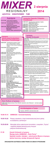 MIXER REGIONALNY ŁĘCZYCA KWIATKÓWEK Łęczyca 11.11-11.30 Parada Rajców Miejskich przed łęczyckim Ratuszem 11.30-11.45 Uroczyste odsłonięcie Murala z okazji 95-lecia Województwa Łódzkiego 12.00-12.20 Oficjalne powitanie na scenie (scena przed budynkiem Starostwa), otwarcie części wystawienniczej 2 sierpnia 2014 TUM Łęczycka Zagroda Chłopska Kwiatkówek 11.00-12.30 Warsztaty tańca ludowego z kapelą „Gęsty kożuch kurzu” 11.00-12.00 Poczęstunek regionalny 12.30-13.15 Pokaz tłoczenia oleju 12.30-18.30 Pokazy: pieczenie chleba, toczenie garnków 14.30-15.15 Pokaz tłoczenia oleju 15.30 Pokaz ustawiania wiatraka pod wiatr 16.00-17.00 Poczęstunek regionalny 16.00-18.00 Pokaz kowalstwa Łęczyca Zamek Królewski Łęczyca scena przed budynkiem Starostwa Powiatowego 12.00-19.00 Zwiedzanie ekspozycji muzealnych Zamku w Łęczycy 12.20-12.30 Przedstawienie programu imprez wraz z aktywnościami w Zamku, Więzieniu, Domu Kultury, Kwiatkówku i Tumie 12.30-13.00 Młodzi Managerowie Kultury: Jimi Jim & Majki & Muti (beatbox&hip-hop), Krzysztof Socha 13.00-13.30 Mały Inżynier (pokazy chemiczne) 13.30-14.30 Usłyszeć Region (przegląd twórczości zespołów ludowych): 13.30-13.45 Świniczanki 13.45-14.00 Witaszewiacy 14.00-14.15 Daszynianki 14.15-14.30 Tumiacy 14.30-15.00 Re-use thinking - pokaz recyclingowej sztuki użytkowej 15.00-16.30 Ludowa Współczesność cz. 1 (przegląd twórczości młodzieżowych zespołów z regionu): Kapela Łęczycka, Marysie i Jaśki z Łyncyckigo, zespół wokalno-instrumentalny Pierożki, Paulina Nowakowska, Martyna Drzewiecka, Małgorzata Brzostowicz z grupą taneczną FIREFLY: 15.00-15.30 Kapela Łęczycka 15.30-15.45 Marysie i Jaśki z Łyncyckigo - scena 15.45-16.00 Zespół wokalno-instrumentalny Pierożki 16.00-16.15 Paulina Nowakowska 16.15-16.30 Martyna Drzewiecka 16.30-17.00 Quiz o regionie 17.00-18.30 Ludowa Współczesność cz. 2 (przegląd twórczości młodzieżowych zespołów z regionu): Dzieci Kazimierza, SOONER, Cutfinger, zespół jazzowy z Radomska 17.00-17.20 Dzieci Kazimierza 17.30-17.45 Cutfinger 17.45-17.50 Klub Palanciarzy z Grabowa 17.50-18.05 SOONER 18.05-18.15 Grupa pod gruszą - Noc Świętojańska 18.15-18.30 Vena i Tony - zespół jazzowy z Radomska 19.00 Zakończenie działań scenicznych i zamknięcie strefy wystawiennicznej Wystawy stałe: Dom Nowy: Pradzieje regionu łęczyckiego, Łęczyca we wczesnym średniowieczu, Wyposażenie dworów szlacheckich w regionie łęczyckim (m.in. portrety, meble), Wyposażenie domów wiejskich w regionie łęczyckim oraz łęczycki strój ludowy, Legendy o diable Borucie w rzeźbie ludowej. Wystawy czasowe: Prochownia, I piętro: Łęczyckie cechy rzemieślnicze od XIX do I połowy XX wieku. Sala recepcyjna Domu Nowego: Tańce, hulanki, swawole... Motywy muzyczno-taneczne w łęczyckiej rzeźbie ludowej. Wieża szlachecka: Drzewo życia (instalacja artystyczna prof. Doroty Sak ASP Łódź). O wystawach opowiadać będą pracownicy merytoryczni Muzeum w Łęczycy: Anna Dłużewska-Sobczak, Patrycja Zasadzka, Tomasz Kucharczyk, Andrzej Bourcki. 12.00-21.30 Punkt gastronomiczny na dziedzińcu zamkowym serwujący potrawy kuchni regionalnej i staropolskiej 15.00-20.00 Artystyczno-historyczne działania interaktywne Obóz łuczników i artylerii burgundzkiej, a w nim: sceny z życia obozowego, pokazy i warsztaty produkcji łuków, strzał oraz robienia kolczug rycerskich, ekspozycja broni i sprzętu bojowego, pogadanki tematyczne - Bractwo Św. Jerzego. Przymierzalnia strojów historycznych od średniowiecza do XVIII wieku, pogadanki i konsultacje z wykonawcami strojów - Pracownia krawiectwa artystycznego HBJ. Wystawa kopii instrumentów muzycznych średniowiecznej Europy, pogadanki tematyczne (pomiędzy koncertami i warsztatami) - zespół muzyczny „Tryzna”. Nasza sarmacka gęba, czyli mixerowe portrety przodków (plansze wielkoformatowe z otworami na twarz i reprodukcjami portretów sarmackich ze zbiorów Muzeum w Łęczycy do samodzielnego wykonania portretu przy pomocy aparatu fotograficznego). 15.00-17.00 Zabawy średniowieczne dla dzieci i dorosłych Atrakcje charakterystyczne dla festynów średniowiecznych. Tor łuczniczy (możliwość strzelania z łuku do tarczy), rzut oszczepem do celu (drewniany pieniek), narty wieloosobowe (zabawa dla sześciu osób polegająca na jak najszybszym pokonaniu odcinka przez dwie grupy mające „narty”, czyli deski z luźnymi zaczepami na stopy. Zdejmowanie pierścieni kopią przez „jeźdźca” siedzącego na wózku ciągnionym przez jedną lub dwie osoby. Zabawa nawiązująca do konnych turniejów rycerskich - Bractwo Św. Jerzego i pracownicy Muzeum w Łęczycy. 15.00-15.15 Pokazy strzelania z kopii średniowiecznej broni palnej 15.20-15.35 Muzyka średniowieczna i „celtycka” w wykonaniu zespołu „Tryzna” 15.40-16.15 Warsztaty tańca z zespołem „Tryzna” 16.20-16.50 Warsztaty budowy średniowiecznych instrumentów muzycznych z zespołem „Tryzna” 17.00-17.15 Pokazy strzelania z łuków angielskich 17.20-17.35 Muzyka średniowieczna i „celtycka” w wykonaniu zespołu „Tryzna” 17.40-18.10 Warsztaty budowy średniowiecznych instrumentów muzycznych z zespołem „Tryzna” 18.00-19.00 Zabawy średniowieczne dla dzieci i dorosłych 18.45-19.00 Muzyka średniowieczna i „celtycka” w wykonaniu zespołu „Tryzna” Dom Kultury w Łęczycy 14.00-14.30 Międzynarodowy Plener Malarski „Łęczyckie Latem Malowane” - wernisaż wystawy poplenerowej Archikolegiata w Tumie Wystawa „VERITAS” autorstwa Doroty Sak 19.00-19.15 ANIMAGIA - korowód teatralny 19.05-19.20 Pokazy strzelania z kopii średniowiecznej broni palnej na dziedzińcu zamkowym 19.25-20.00 Warsztaty tańca zakończone koncertem z zespołem „Tryzna” i wspólną zabawą taneczną przy muzyce „celtycko-średniowiecznej” 21.30 Zamek Królewski w Łęczycy: Występ teatru ANIMAGIA „Dwie Panny” Spektakl światła i dźwięku - zakoń