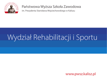 Państwowa Wyższa Szkoła Zawodowa im. Prezydenta Stanisława Wojciechowskiego w Kaliszu Wydział Rehabilitacji i Sportu www.pwsz.kalisz.pl WYDZIAŁ REHABILITACJI I SPORTU FIZJOTERAPIA Poziom studiów: Forma studiów: Czas trwania: Praktyka zawodowa: Obozy sportowe: Kwalifikacja: pierwszego stopnia, licencjackie stacjonarne i niestacjonarne 6 semestrów (3 lata) 23 tygodnie zimowy (dla chętnych) konkurs świadectw – j. polski, j. obcy nowożytny, biologia, fizyka Fizjoterapia to dynamicznie rozwijająca się dziedzina współczesnej medycyny stanowiąca podstawę rehabilitacji i uzupełniająca leczenie wszystkimi metodami współczesnej medycyny. W ciągu trzyletnich studiów licencjackich studenci uzyskują kwalifikacje niezbędne do podjęcia bezpośrednio po ich ukończeniu pracy zawodowej jako fizjoterapeuci. Znaczenie fizjoterapii we współczesnym świecie jest ogromne, uzupełnia bowiem leczenie farmakologiczne i operacyjne, stanowi podstawę rehabilitacji i jest nie do zastąpienia w profilaktyce wielu chorób, ponieważ zapobiega powikłaniom i wzmacnia naturalne procesy obronne organizmu. Stanowi również podstawę postępowania przyspieszającego regenerację sił po wysiłku sportowym i po pracy w życiu codziennym. Zakres studiów obejmuje wiedzę o budowie i czynnościach narządów organizmu ludzkiego, prawach i mechanizmach rządzących tymi czynnościami w zdrowiu i chorobie oraz o metodach leczenia różnych chorób. Tę wiedzę 1 student zdobywa w ramach wykładów i ćwiczeń z zakresu przedmiotów podstawowych, m.in. anatomii, fizjologii, patologii ogólnej i klinicznej, biofizyki, biomechaniki, biochemii oraz biologii medycznej. Zasady, metody oraz techniki i sposoby fizjoterapii student poznaje w pracowniach i oddziałach szpitalnych w ramach przedmiotów kierunkowych i zawodowych, do których należą liczne metody fizjoterapii, jak, m.in. kinezyterapia, masaż, elektroterapia, magnetoterapia, światłolecznictwo z laseroterapią, ultrasonoterapia, hydroterapia, balneoterapia. Student poznaje fizjoterapię w zastosowaniu do wszystkich dyscyplin klinicznej medycyny, w tym interny, kardiologii, neurologii, pulmonologii, ortopedii, ginekologii, pediatrii. Program studiów obejmuje naukę języków obcych oraz zajęcia z wychowania fizycznego. Absolwent kierunku fizjoterapia uzyskuje wykształcenie wyższe i tytuł licencjata. Posiada wiedzę i umiejętności praktyczne, zgodne z wymaganiami obowiązującymi w ochronie zdrowia, do pracy z osobami chorymi i niepełnosprawnymi, w zakresie stosowania różnych metod fizykalnych w profilaktyce, leczeniu i rehabilitacji, w tym podczas kuracji uzdrowiskowej. Jest również przygotowany do pracy w placówkach odnowy biologicznej, „wellnessu” i spa. Fizjoterapeuta wykonuje zawód medyczny, który wymaga pełnej fizycznej i psychicz- nej sprawności niezbędnej do nawiązywania i utrzymywania kontaktów z pacjentami i wykonywania wielu różnych zabiegów fizykalnych w przebiegu leczenia. Wymaga to sprawnego działania narządów służących do komunikacji - mowy, słuchu, wzroku. Powinien posiadać predyspozycje psychofizyczne do pracy z ludźmi chorymi i niepełnosprawnymi oraz być w pełni sprawnym fizycznie, by móc poprawnie demonstrować i przeprowadzać ćwiczenia fizyczne z tymi osobami oraz wykonywać masaż leczniczy. Absolwenci kierunku fizjoterapia posiadają wiedzę i umiejętności niezbędne do prowadzenia rehabilitacji w każdej chorobie i ułomności, to jest do kształtowania, podtrzymywania i przywracania sprawności i wydolności osób w różnym wieku, utraconej lub obniżonej wskutek różnych chorób bądź urazów. Są przygotowani do prawidłowego wykonywania zabiegów fizjoterapeutycznych aprobowanych przez współczesną medycynę oraz do kontrolowania ich skuteczności. Są również dobrze przygotowani do pracy w specjalistycznych zespołach rehabilitacyjnych. Perspektywy zawodowe Studia licencjackie na kierunku fizjoterapia przygotowują do pracy w zawodzie fizjoterapeuty pod kierunkiem lekarza w publicznych i niepublicznych placówkach ochrony zdrowia. Studenci fizjoterapii zdobywają również wia- WYDZIAŁ REHABILITACJI I SPORTU domości z terapii zajęciowej i sportu osób niepełnosprawnych. Ułatwi im to zdobycie pracy nie tylko w szpitalach, sanatoriach, hospicjach, przychodniach rehabilitacyjnych, ale także w ośrodkach sportowo-rekreacyjnych dla osób niepełnosprawnych fizycznie oraz placówkach specjalistycznych zajmujących się opieką nad osobami niepełnosprawnymi umysłowo. Nasi absolwenci są również przygotowani do pracy w uzdrowiskach oraz w placówkach odnowy biologicznej „wellnessu” i spa. Dyplom ukończenia studiów licencjackich z fizjoterapii uprawnia do podjęcia studiów magisterskich na każdej uczelni, która je prowadzi. Wybrane przedmioty z programu studiów Anatomia prawidłowa, funkcjonalna, rentgenowska; fizjologia człowieka, fizjologia wysiłku i kliniczna, kinezyterapia, medycyna sportu i traumatologia, wychowanie zdrowotne i ekologiczne, higiena i epidemiologia, zaopatrzenie ortopedyczne, fizykoterapia, masaż, fizjoterapia w dysfunkcjach narządu ruchu, fizjoterapia w reumatologii, fizjoterapia w neurologii i neurochirurgii, fizjoterapia w oto-rhino-laryngologii, fizjoterapia w ginekologii i położnictwie, fizjoterapia w kardiologii, fizjoterapia w pulmonologii; pierwsza pomoc przedmedyczna, psychologia rozwoju i kliniczna, pedagogika i pedagogika specjalna, kształcenie ruchowe i metodyka nauczania ruchu. WYCHOWANIE FIZYCZNE specjalność: zdrowie publiczne Poziom studiów: pierwszego stopnia, licencjackie Forma studiów: stacjonarne i niestacjonarne Czas trwania: 6 semestrów (3 lata) Praktyka zawodowa: 10 tygodni (pedagogiczna), 10 tygodni (środowiskowa - zdrowie publiczne) Obóz szkoleniowy: obowiązkowy, 80 godzin Kwalifikacja: konkurs świadectw – j. polski, j. obcy nowożytny, biologia, fizyka lub chemia Realizacja części przedm