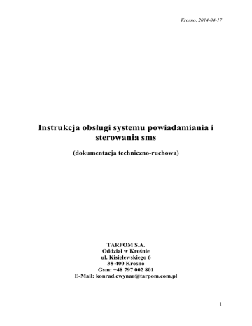 Krosno, 2014-04-17 Instrukcja obsługi systemu powiadamiania i sterowania sms (dokumentacja techniczno-ruchowa) TARPOM S.A. Oddział w Krośnie ul. Kisielewskiego 6 38-400 Krosno Gsm: +48 797 002 801 E-Mail: [email protected] 1 Spis treści 1. 2. 3. 4. 5. 6. 7. 8. 9. 10. 11. 12. 13. 14. Ogólny opis systemu ........................................................................................................... 3 Bezpieczeństwo ................................................................................................................... 3 Dane techniczne .................................................................................................................. 4 Wymiary urządzenia i widok panelu czołowego ................................................................ 4 Podłączenie urządzenia ....................................................................................................... 5 Uruchomienie urządzenia ................................................................................................... 5 Konfiguracja ....................................................................................................................... 7 Zastosowanie....................................................................................................................... 7 Przykładowa konfiguracja................................................................................................... 7 Lista odbiorców komunikatów alarmowych ................................................................... 8 Przykładowe komunikaty alarmowe i czynności kontrolne ............................................ 8 Sprawdzenie skuteczności działania ............................................................................... 9 Doładowanie konta (przykład sieci Simplus)................................................................ 10 Sprawdzenie stanu instalacji ......................................................................................... 10 2 1. Ogólny opis systemu System powiadamiania i sterowania sms jest urządzeniem stosowanym w instalacjach informowania o awariach i wszelkich sytuacjach alarmowych w urządzeniach automatyki. Urządzenie umożliwia wysyłanie komunikatów alarmowych w formie sms oraz wykonywanie połączeń głosowych do maksymalnie ośmiu odbiorców. Urządzenie posiada osiem niezależnych wejść, z którymi można powiązać osiem niezależnych komunikatów. Komunikaty mogą być wysyłane podczas naruszenia wejścia (np. zwarcie linii) oraz podczas normalizacji (np. rozwarcie linii). Dodatkowo system umożliwia sterowanie wyjściami cyfrowymi za pomocą odpowiednich komend wysyłanych za pomocą sms. Zaletą urządzenia jest możliwość poprawnej pracy nawet przy braku zasilania (ok 24 godziny) dzięki zastosowaniu zasilacza buforowego z akumulatorem, co czyni system bezpiecznym dla użytkownika. 2. Bezpieczeństwo Urządzenie będące przedmiotem niniejszej dokumentacji zasilane jest z sieci 230 V i dlatego należy zachować bezpieczeństwo podczas podłączania urządzenia. Urządzenie spełnia europejskie wymogi bezpieczeństwa mające na celu głównie zachowanie zdrowia i bezpieczeństwo użytkowania. Urządzenie, o którym mowa wyżej przeznaczone jest tylko i wyłącznie do zastosowania w systemach alarmowych i informacyjnych. Niniejsza instrukcja powinna być zachowana i przechowywana przez cały okres funkcjonowania urządzenia. UWAGA! NIE PRZESTRZEGANIE NINIEJSZEJ INSTRUKCJI GROZI RYZYKIEM PORAŻENIA PRĄDEM ELEKTRYCZNYM. NALEŻY BEZWZGLĘDNIE ZAPOZNAĆ SIĘ Z INSTRUKCJĄ PRZED ROZPOCZĘCIEM PROCEDURY URUCHOMIENIA URZĄDZENIA. UWAGA! URZĄDZENIE BEDĄCE PODMIOTEM NINIEJSZEJ INSTRUKCJI OBSUGI POWINNO BYĆ MONTOWANE PRZEZ PRZESZKOLONY DO TEGO CELU PERSONEL LUB PRACOWNIKÓW FIRMY ZAJMUJĄCEJ SIĘ INSTALACJAMI ELEKTRYCZNYMI. 3 3. Dane techniczne Napięcie zasilania: Częstotliwość zasilania: Pobór prądu: Akumulator: Stopień ochrony: ~230V 50 Hz min.: 50 mA; maks.: 300 mA 12V / 2,3 Ah IP65 4. Wymiary urządzenia i widok panelu czołowego Głębokość urządzenia wynosi 110 mm. 4 5. Podłączenie urządzenia System do poprawnego działania wymaga podłączenia zasilania o napięciu 230 V oraz zamontowanie anteny GSM do gniazda znajdującego się w górnej części obudowy. Przewód zasilający należy wprowadzić poprzez dławik znajdujący się w górnej części obudowy. Niewykorzystane dławiki należy zaślepić. Urządzenie należy podłączyć do sieci elektrycznej za pomocą przewodu 3-żyłowego (przewód fazowy, neutralny oraz uziemiający) o przekroju minimalnym żyły: 1,5 mm. Przewody zasilające należy wprowadzić do kostki zaciskowej wg rysunku znajdującego się wewnątrz obudowy urządzenia oraz przykręcić końcówki przewodów przeznaczonymi do tego celu śrubami zaciskowymi. Kostka przyłączeniowa wyposażona jest w bezpiecznik topikowy o wartości prądu znamionowego 500 mA. Wymiana bezpiecznika wymaga wyciągnięcia wsuwki zamontowanej na kostce przyłączeniowej oraz zastąpienie spalonego bezpiecznika nowym. Uwaga! Spalenie bezpiecznika spowodowane jest niewłaściwym zadziałaniem urządzenia, więc należy najpierw sprawdzić źródło niepoprawnej pracy, a następnie dokonać wymiany bezpiecznika. A. B. C. D. E. F. G. Procedura montażu systemu powiadamiania: Upewnić się, że urządzenie nie jest podłączone do sieci 230V. Odkręcić sześć śrub mocujących pokrywę obudowy. Zdjąć pokrywę obudowy. Odłączyć i wyjąć akumulator. Odkręcić 4 śruby mocujące blachę montażową wewnątrz obudowy i wyjąć tę blachę. Przymocować plastikową obudowę do podłoża. Przykręcić blachę montażową, podłączyć zasilanie, wpiąć akumulator oraz przykręcić pokrywę obudowy. Montaż urządzenia należy przemyśleć pod kątem dostępu do sieci GSM. Lokalizacja urządzenia w miejscach z ograniczonym zasięgiem sieci GSM wymaga zastosowania przedłużacza antenowego or