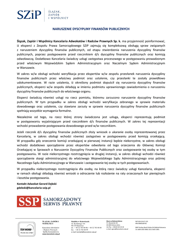 NARUSZENIE DYSCYPLINY FINANSÓW PUBLICZNYCH Ślązak, Zapiór i Wspólnicy Kancelaria Adwokatów i Radców Prawnych Sp. k. ma przyjemność poinformować, iż eksperci z Zespołu Prawa Samorządowego SZiP zajmują się kompleksową obsługą spraw związanych z naruszeniem dyscypliny finansów publicznych, od etapu stwierdzenia naruszenia dyscypliny finansów publicznych, poprzez postępowanie przed rzecznikiem d/s dyscypliny finansów publicznych oraz komisją odwoławczą. Dodatkowo Kancelaria świadczy usługi zastępstwa procesowego w postępowaniu prowadzonym przed właściwym Wojewódzkim Sądem Administracyjnym oraz Naczelnym Sądem Administracyjnym w Warszawie. W zakres w/w obsługi wchodzi weryfikacja przez ekspertów w/w zespołu przesłanek naruszenia dyscypliny finansów publicznych przez właściwy podmiot oraz ustalenie, czy przesłanki te zostały prawidłowo udokumentowane. W razie ustalenia, iż określony podmiot dopuścił się naruszenia dyscypliny finansów publicznych, eksperci w/w zespołu składają w imieniu podmiotu uprawnionego zawiadomienia o naruszeniu dyscypliny finansów publicznych do właściwego organu. Eksperci świadczą również usługi na rzecz pomiotu, któremu zarzucono naruszenie dyscypliny finansów publicznych. W tym przypadku w zakres obsługi wchodzi weryfikacja zebranego w sprawie materiału dowodowego oraz ustalenie, czy stawiane zarzuty w sprawie naruszenia dyscypliny finansów publicznych spełniają wszystkie wymagania formalne. Niezależnie od tego, na rzecz której strony świadczona jest usługa, eksperci reprezentują podmiot w postępowaniu wyjaśniającym przed rzecznikiem d/s finansów publicznych. W zakres tej reprezentacji wchodzi prowadzenie postępowania dowodowego przed w/w rzecznikiem. Jeżeli rzecznik d/s dyscypliny finansów publicznych złoży wniosek o ukaranie osoby reprezentowanej przez Kancelarię, w zakres obsługi wchodzi również zastępstwo w postępowaniu przed komisją orzekającą. W przypadku gdy orzeczenie komisji orzekającej w pierwszej instancji będzie niekorzystne, w zakres obsługi wchodzi dodatkowo sporządzenie przez ekspertów odwołania od tego orzeczenia do Głównej Komisji Orzekającej w Sprawach o Naruszenie Dyscypliny Finansów Publicznych oraz zastępowanie tej osoby w tym postępowaniu. W razie niekorzystnego rozstrzygnięcia w drugiej instancji, w zakres obsługi wchodzi również sporządzenie skargi administracyjnej do właściwego Wojewódzkiego Sądu Administracyjnego oraz później Naczelnego Sądu Administracyjnego w Warszawie i zastępowanie tej osoby w tych postępowaniach. W przypadku niekorzystnego rozstrzygnięcia dla osoby, na którą rzecz świadczy usługi Kancelaria, eksperci w ramach obsługi składają również wnioski o odroczenie lub rozłożenie na raty orzeczonych kar pieniężnych i kosztów postępowania. Kontakt Adwokat Gerard Dębski [email protected] ŚLĄZAK, ZAPIÓR I WSPÓLNICY Kancelaria Adwokatów i Radców Prawnych Spółka Komandytowa www.kancelaria-szip.pl Siedziba w Katowicach: Al. Korfantego 141 40-154 Katowice tel. + 48 32 783 88 00; + 48 32 783 88 88 fax. + 48 32 783 88 99 e-mail: [email protected] Biuro w Zielonej Górze: Pl. Słowiański 26 65-069 Zielona Góra tel./fax + 48 68 324 10 18 e-mail: [email protected] NIP 634-24-67-135 KRS 0000328742 BNP Paribas Bank Polska SA Oddział Katowice 31 1600 1055 0002 3211 5635 1001