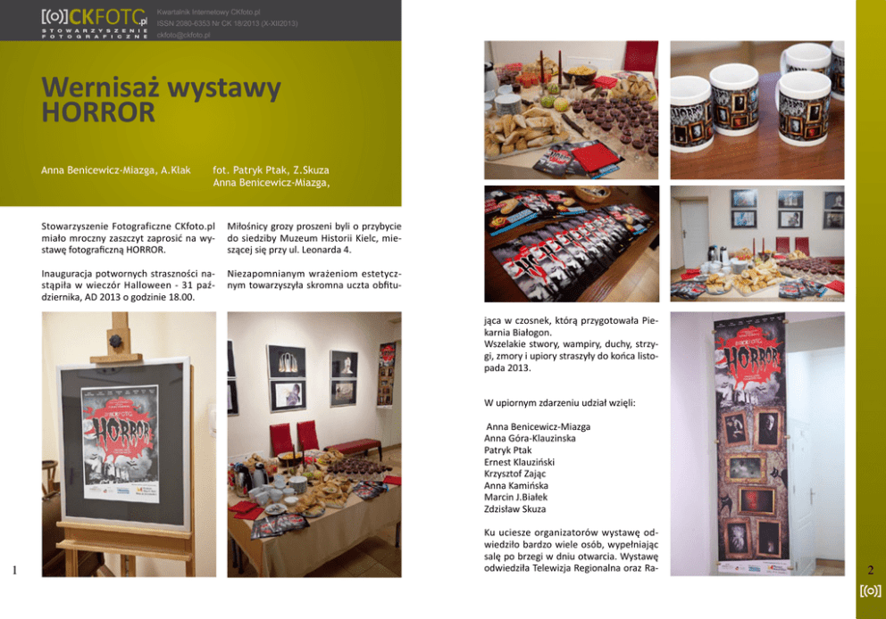 Kwartalnik Internetowy CKfoto.pl ISSN 2080-6353 Nr CK 18/2013 (X-XII2013) [email protected] Wernisaż wystawy HORROR Anna Benicewicz-Miazga, A.Kłak fot. Patryk Ptak, Z.Skuza Anna Benicewicz-Miazga, Stowarzyszenie Fotograficzne CKfoto.pl miało mroczny zaszczyt zaprosić na wystawę fotograficzną HORROR. Miłośnicy grozy proszeni byli o przybycie do siedziby Muzeum Historii Kielc, mieszącej się przy ul. Leonarda 4. Inauguracja potwornych straszności nastąpiła w wieczór Halloween - 31 października, AD 2013 o godzinie 18.00. Niezapomnianym wrażeniom estetycznym towarzyszyła skromna uczta obfitująca w czosnek, którą przygotowała Piekarnia Białogon. Wszelakie stwory, wampiry, duchy, strzygi, zmory i upiory straszyły do końca listopada 2013. W upiornym zdarzeniu udział wzięli: Anna Benicewicz-Miazga Anna Góra-Klauzinska Patryk Ptak Ernest Klauziński Krzysztof Zając Anna Kamińska Marcin J.Białek Zdzisław Skuza 1 Ku uciesze organizatorów wystawę odwiedziło bardzo wiele osób, wypełniając salę po brzegi w dniu otwarcia. Wystawę odwiedziła Telewizja Regionalna oraz Ra- 2 dio RMF MAXXX. Swoją obecnością zaszczycił wernisaż zaprzyjaźniony z nami Paweł Pierściński oraz Andrzej Borys. Swoją pracę - rzeźbę w metalu - postać Frankensteina zaprezentował Pan H.Skuza. Wydany został także folder, przygotowano okazjonalne znaczki oraz kubki. 3 4 5 6 7 ZAPRASZAMY DO DYSKUSJI NA FORUM http://ckfoto.pl/forum 8