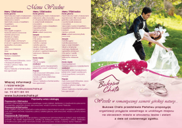 Menu 125zł/osoba Danie głowne: saromatyczny rosół z makaronem stradycyjny schabowy/pieczeń wieprzowa z sosem sziemniaki z wody z masełkiem i koperkiem szestaw surówek Zakaski: smix wędlin swojskich skoreczki serowo-owocowe ssałatka jarzynowa sśledzik po wiejsku spasztet pieczony sswojski chleb z domowym smalcem i ogórkami kiszonymi sgalaretka z kurczaka spikle spieczywo mieszane ssosy Danie na ciepło: sbarszcz z krokietem Napoje: ssoki owocowe 0,5l/osoba, cocacola/pepsi 0,5l/osoba swoda z cytryna i miętą - bez ograniczeń skawa i herbata w formie bufetu bez ograniczeń Propozycja I- 35zł/osoba Menu 155zł/osoba Danie główne: saromatyczny rosół z makaronem spieczone udko z kurczaka w chrupiacej skórce/schab saute w sosie/roladki drobiowe z boczkiem sziemniaki z wody z masełkiem i koperkiem/frytki szestaw surówek deser: sorbet owocowy Zakąski: sjaja w sosie tatarskim smix serów smięsa pieczone ssałatka caprese ssałatka grecka ssledź w śmietanie sswojski chleb z domowym smalcem i ogórkami kiszonymi spieczywo mieszane ssosy Dania ciepłe: sbigos sflaczki swojskie słodkości: spuszysty sernik z brzoskwiniami, jabłecznik z sosem waniliowym Napoje: ssoki owocowe 0,5l/osoba, cocacola/pepsi 0,5l/osoba swoda z cytryna i mieta-bez ograniczeń skawa i herbata w formie bufetubez ograniczeń Menu 195zł/osoba Danie główne: saromatyczny rosół z makaronem spanierowany filet z kurczaka/ golonka z pieca/sznycel z szynki/roladki drobiowe z boczkiem sziemniaki z wody z masełkiem i koperkiem/ziemniaczki zapiekane z ziołami szestaw surówek deser: sorbet owocowy/lody owocowe Zakąski: ssałatka gyros ssałatka jarzynowa sjaja w sosie tatarskim sśledź w śmietanie srolmopsy śledziowe sgalaretka drobiowa smix serów i wędlin sszparagi w szynce spieczywo mieszane ssosy Dania ciepłe: szupa gulaszowa sbarszcz czerwony z pasztecikami słodkości: spuszysty sernik z brzoskwiniami, jabłecznik z sosem waniliowym, ciasto jogurtowe z owocami, sowoce Napoje: ssoki owocowe 0,5l/osoba, cocacola/pepsi 0,5l/osoba swoda z cytryna i miętą - bez ograniczeń skawa i herbata w formie bufetu bez ograniczeń Poprawiny wraz z obsługą potrawy z pierwszego dnia menu weselnego, żurek z jajkiem, kiełbaska ( z mozliwościa upieczenia na palenisku wewnatrz chaty), soki owocowe, woda z cytryna, kawa i herbata Propozycja II-55zł/osoba żurek z jajkiem, pieczeń z karkówki w sosie podana z ziemniakami z wody z masełkiem i koperkiem oraz zestawem surówek, kaszanka z pieca, sałatka grecka, soki owocowe, woda z cytryna, kawa i herbata Propozycja III- 75zł/osoba kwaśnica, schab saute w sosie podany z zapiekanymi ziemniaczkami w ziołach oraz zestawem surówek, mix wędlin regionalnych, sałatka ze świeżych warzyw, kaszanka z pieca, kiełbaska (z mozliwoscia upieczenia wewnatrz chaty), soki owocowe, woda z cytryna, kawa i herbata Dla Państwa Młodych: wpowitanie chlebem i solą wtoast kieliszkiem szampana wprzytulny pokój w noc poślubną z płatkami róż... i widokiem na leśną przyrodę wśniadanie w formie bufetu z ciepłym posiłkiem na życzenie wdrewniane wnętrza Bukowej Chaty i okolicy do sesji zdjęciowej wpierwszy taniec w otoczeniu baniek mydlanych wrocznicowa kolacja z butelką regionalnego wina w Bukowej Chacie w romantycznej scenerii wopieka dedykowanego konsultanta, który będzie czuwał nad organizacją i przebiegiem imprezy wsale główne- do wyboru (sala główna z paleniskiem do max 60 osób, sala kominkowa do max 20 osób oraz sala na antresoli do max 30 osób). Wybór Sali pozostawiamy Państwu. Korzystanie z dowolnej sali - gratis! wpodstawowa dekoracja sali (obrusy, zastawa, dekoracja krzeseł, krzesła Pary Młodej) ww prezencie od Bukowej Chaty, relaks w Spa Bella Medi w Bielawie... pakiet do wyboru o wartości 300zł: wzabieg na twarz z drenażem limfatycznym, zabieg na ciało i poczęstunek spa wZabieg na twarz, manicure i poczęstunek spa wZabieg na ciało, manicure i poczęstunek spa * Z zabiegów można skorzystać po wcześniejszej rezerwacji. Ponadto w ofercie... wbogaty wybór menu weselnego 125zł/osoba, 155zł/osoba, 195zł/osoba wraz z miłą obsługą wpokoje dla gości w atrakcyjnych cenach* i późny check-out do 20:00 wdzieci do lat 5 gratis, od 6 do 10 lat 50% ceny (menu oraz noclegi) wkącik dla dzieci woprawa muzyczna z dj i karaoke* wdo każdego menu weselnego kawa i herbata w formie bufetu bez ograniczeń w płonaca atrakcja wieczoru...* pieczony wieprzowy udziec lub baran podany z kapusta zasmażana , ziemniakami z pieca i dodatkami wstół wiejski z regionalnymi smakołykami* wognisko z pieczeniem kiełbasek na kijach z grzańcem* wwłasne wypieki* w usługi florystyczne i cukiernicze* w możliwość zorganizowania ślubu cywilnego przy Bukowej Chacie* wpoprawiny już od 40zł/od osoby bez dodatkowych opłat za obsługę wAlkohol* wwynajem chaty na wyłączność* * Ustalane indywidualnie