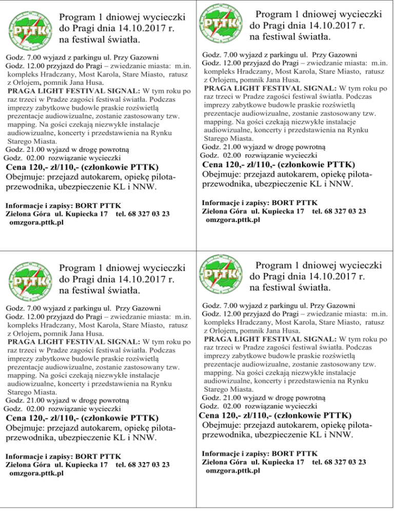 Program 1 dniowej wycieczki do Pragi dnia 14.10.2017 r. na festiwal światła. Godz. 7.00 wyjazd z parkingu ul. Przy Gazowni Godz. 12.00 przyjazd do Pragi – zwiedzanie miasta: m.in. kompleks Hradczany, Most Karola, Stare Miasto, ratusz z Orlojem, pomnik Jana Husa. PRAGA LIGHT FESTIVAL SIGNAL: W tym roku po raz trzeci w Pradze zagości festiwal światła. Podczas imprezy zabytkowe budowle praskie rozświetlą prezentacje audiowizualne, zostanie zastosowany tzw. mapping. Na gości czekają niezwykłe instalacje audiowizualne, koncerty i przedstawienia na Rynku Starego Miasta. Godz. 21.00 wyjazd w drogę powrotną Godz. 02.00 rozwiązanie wycieczki Program 1 dniowej wycieczki do Pragi dnia 14.10.2017 r. na festiwal światła. Godz. 7.00 wyjazd z parkingu ul. Przy Gazowni Godz. 12.00 przyjazd do Pragi – zwiedzanie miasta: m.in. kompleks Hradczany, Most Karola, Stare Miasto, ratusz z Orlojem, pomnik Jana Husa. PRAGA LIGHT FESTIVAL SIGNAL: W tym roku po raz trzeci w Pradze zagości festiwal światła. Podczas imprezy zabytkowe budowle praskie rozświetlą prezentacje audiowizualne, zostanie zastosowany tzw. mapping. Na gości czekają niezwykłe instalacje audiowizualne, koncerty i przedstawienia na Rynku Starego Miasta. Godz. 21.00 wyjazd w drogę powrotną Godz. 02.00 rozwiązanie wycieczki Cena 120,- zł/110,- (członkowie PTTK) Obejmuje: przejazd autokarem, opiekę pilotaprzewodnika, ubezpieczenie KL i NNW. Cena 120,- zł/110,- (członkowie PTTK) Obejmuje: przejazd autokarem, opiekę pilotaprzewodnika, ubezpieczenie KL i NNW. Informacje i zapisy: BORT PTTK Zielona Góra ul. Kupiecka 17 tel. 68 327 03 23 omzgora.pttk.pl Informacje i zapisy: BORT PTTK Zielona Góra ul. Kupiecka 17 tel. 68 327 03 23 omzgora.pttk.pl Program 1 dniowej wycieczki do Pragi dnia 14.10.2017 r. na festiwal światła. Godz. 7.00 wyjazd z parkingu ul. Przy Gazowni Godz. 12.00 przyjazd do Pragi – zwiedzanie miasta: m.in. kompleks Hradczany, Most Karola, Stare Miasto, ratusz z Orlojem, pomnik Jana Husa. PRAGA LIGHT FESTIVAL SIGNAL: W tym roku po raz trzeci w Pradze zagości festiwal światła. Podczas imprezy zabytkowe budowle praskie rozświetlą prezentacje audiowizualne, zostanie zastosowany tzw. mapping. Na gości czekają niezwykłe instalacje audiowizualne, koncerty i przedstawienia na Rynku Starego Miasta. Godz. 21.00 wyjazd w drogę powrotną Godz. 02.00 rozwiązanie wycieczki Cena 120,- zł/110,- (członkowie PTTK) Obejmuje: przejazd autokarem, opiekę pilotaprzewodnika, ubezpieczenie KL i NNW. Informacje i zapisy: BORT PTTK Zielona Góra ul. Kupiecka 17 tel. 68 327 03 23 omzgora.pttk.pl Program 1 dniowej wycieczki do Pragi dnia 14.10.2017 r. na festiwal światła. Godz. 7.00 wyjazd z parkingu ul. Przy Gazowni Godz. 12.00 przyjazd do Pragi – zwiedzanie miasta: m.in. kompleks Hradczany, Most Karola, Stare Miasto, ratusz z Orlojem, pomnik Jana Husa. PRAGA LIGHT FESTIVAL SIGNAL: W tym roku po raz trzeci w Pradze zagości festiwal światła. Podczas imprezy zabytkowe budowle praskie rozświetlą prezentacje audiowizualne, zostanie zastosowany tzw. mapping. Na gości czekają niezwykłe instalacje audiowizualne, koncerty i przedstawienia na Rynku Starego Miasta. Godz. 21.00 wyjazd w drogę powrotną Godz. 02.00 rozwiązanie wycieczki Cena 120,- zł/110,- (członkowie PTTK) Obejmuje: przejazd autokarem, opiekę pilotaprzewodnika, ubezpieczenie KL i NNW. Informacje i zapisy: BORT PTTK Zielona Góra ul. Kupiecka 17 tel. 68 327 03 23 omzgora.pttk.pl