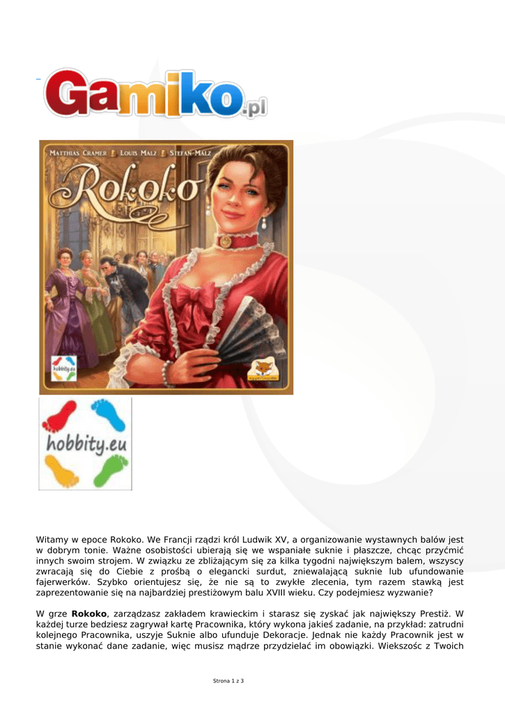 Witamy w epoce Rokoko. We Francji rządzi król Ludwik XV, a organizowanie wystawnych balów jest w dobrym tonie. Ważne osobistości ubierają się we wspaniałe suknie i płaszcze, chcąc przyćmić innych swoim strojem. W związku ze zbliżającym się za kilka tygodni największym balem, wszyscy zwracają się do Ciebie z prośbą o elegancki surdut, zniewalającą suknie lub ufundowanie fajerwerków. Szybko orientujesz się, że nie są to zwykłe zlecenia, tym razem stawką jest zaprezentowanie się na najbardziej prestiżowym balu XVIII wieku. Czy podejmiesz wyzwanie? W grze Rokoko, zarządzasz zakładem krawieckim i starasz się zyskać jak największy Prestiż. W każdej turze bedziesz zagrywał kartę Pracownika, który wykona jakieś zadanie, na przykład: zatrudni kolejnego Pracownika, uszyje Suknie albo ufunduje Dekoracje. Jednak nie każdy Pracownik jest w stanie wykonać dane zadanie, więc musisz mądrze przydzielać im obowiązki. Wiekszośc z Twoich Strona 1 z 3 Pracowników ma dodatkowe zdolności np. uzyskiwanie Punktów Prestiżu w formie żetonów Prestiżu. Po 7 rundach gra kończy się balem i ostatecznym podliczeniem punktów. Wtedy otrzymasz Punkty Prestizu za niektóre zdolności Pracowników, za Stroje, które wypożyczyłeś gościom na bal oraz za Dekoracje, które ufundowałeś. Na koniec wszyscy gracze podliczają swoje Punkty Prestiżu i ten gracz, który zdobył ich najwiecej, wygrywa grę. Zawartość pudełka: dwustronna plansza 55 kart 42 żetony Strojów 48 żetonów Surowców 48 Monet 48 znaczników Punktów Prestiżu 80 drewnianych znaczników Własności 16 drewnianych znaczników Przędzy 16 drewnianych znaczników Koronki 5 plansz graczy woreczek znacznik gracza rozpoczynającego instrukcja Wiek od 12 lat Liczba graczy 2-5 Czas gry ok. 90 minut Instrukcja polska Wydanie Strona 2 z 3 polskie Producent HOBBITY.eu Projektant Matthias Cramer Louis Malz Stefan Malz Strona 3 z 3