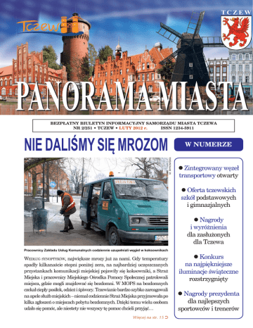 TCZEW •1 PANORAMA MIASTA • www. tczew.pl • www.bip.tczew.pl • Luty 2012 PANORAMA MIASTA BEZPŁATNY BIULETYN INFORMACYJNY SAMORZĄDU MIASTA TCZEWA NR 2/251 • TCZEW • LUTY 2012 r. ISSN 1234-5911 NIE DALIŚMY SIĘ MROZOM M. MYKOWSKA W NUMERZE Zintegrowany węzeł transportowy otwarty Oferta tczewskich szkół podstawowych i gimnazjalnych Nagrody i wyróżnienia dla zasłużonych dla Tczewa Pracownicy Zakładu Usług Komunalnych codziennie uzupełniali węgiel w koksownikach WEDŁUG SYNOPTYKÓW, największe mrozy już za nami. Gdy temperatury spadły kilkanaście stopni poniżej zera, na najbardziej uczęszczanych przystankach komunikacji miejskiej pojawiły się koksowniki, a Straż Miejska i pracownicy Miejskiego Ośrodka Pomocy Społecznej patrolowali miejsca, gdzie mogli znajdować się bezdomni. W MOPS na bezdomnych czekał ciepły posiłek, odzież i śpiwory. Tczewianie bardzo szybko zareagowali na apele służb miejskich – niemal codziennie Straż Miejska przyjmowała po kilka zgłoszeń o miejscach pobytu bezdomnych. Dzięki temu wielu osobom udało się pomóc, ale niestety nie wszyscy tę pomoc chcieli przyjąć… Więcej na str. 15 ² Konkurs na najpiękniejsze iluminacje świąteczne rozstrzygnięty Nagrody prezydenta dla najlepszych sportowców i trenerów 2 • Aktualności Luty 2012 • PANORAMA MIASTA • www. tczew.pl • www.bip.tczew.pl Alicja Gajewska w kapitule konkursu „Polska Pięknieje” A licja Gajewska, dyrektor Fabryki Sztuk została zaproszona przez Ministerstwo Rozwoju Regionalnego do udziału w pracach kapituły V edycji konkursu „Polska Pięknieje. 7 cudów funduszy unijnych”. Na konkurs przyjmowane są projekty z całej Polski zrealizowane przy wsparciu środków unijnych. Zgłoszenia przyjmowane są w siedmiu kategoriach: – rewitalizacja – zabytek – produkt promocyjny (wydawnictwo, portal, kampania promocyjna) – obiekt turystyczny/gastronomiczny – wydarzenie (festiwal, targi, jarmark) – współpraca transgraniczna siębiorcy w Tczewie. Inkubator dysponuje obecnie już tylko jednym, ostatnim lokalem o powierzchni 13,41 m2 wyposażonym w sprzęt komputerowy i biurowy. Oferta kierowana jest do osób, które zamierzają otworzyć działalność gospodarczą lub ją prowadzą nie dłużej niż rok, a w szczególnych przypadkach istnieją na rynku dłużej niż rok. Korzyści dla przyszłych klientów Domu Przedsiębiorcy: – dobra lokalizacja w nowo wyremontowanym budynku o wysokim standardzie, zlokalizowanym w sercu miasta, – niskie koszty prowadzenia działalności, dzięki preferencyjnym warunkom finansowym wynajmu lokalu (25zł + Porządek obrad XVII sesji Rady Miejskiej w Tczewie na 23 lutego 2012 r. (czwartek) o godz. 10.00 w sali konferencyjnej im. Franciszka Fabicha w Urzędzie Miejskim w Tczewie I. CZĘŚĆ PIERWSZA: 1. 2. 3. 4. – rozwój turystyki na obszarach wiejskich. W pierwszej edycji konkursu, w kategorii rewitalizacja, zwyciężyła tczewska Fabryka Sztuk (Centrum Wystawienniczo-Regionalne Dolnej Wisły). Więcej informacji o konkursie na stronie: www.polskapieknieje. pascal.pl Ostatnie miejsce w inkubatorze przedsiębiorczości rwa nabór dla przedsiębiorców, T którzy chcieliby ulokować swoje firmy w inkubatorze Domu Przed- XVII SESJA 23% VAT za m2), – nieodpłatne korzystanie z Internetu , pakietu reklamowego oraz nowoczesnej sali konferencyjnej, – darmowe usługi doradcze i konsultacje dla firm na miejscu, – przyjazne otoczenie i sąsiedztwo innych firm nastawionych na sukces, – ułatwianie przedsiębiorcom nawiązywania kontaktów ze środowiskiem biznesowym. Zgłoszenia należy składać na formularzach dostępnych na stronie dp.tczew.pl (zakładka: Inkubator) w pokoju nr 14, 15 lub 16 I piętra Domu Przedsiębiorcy w Tczewie, ul. Obr. Westerplatte 3. Kontakt: tel. 58 777 53 41 (42, 43) fax: 58 777 53 43 e-mail:[email protected] ILU NAS JEST? 1 lutego 2012 r. w Tczewie zameldowanych było 59 468 osób, w tym 58 388 na pobyt stały i 1080 na pobyt czasowy. Od początku stycznia 2012 r. przybyło 78 mieszkańców miasta. Otwarcie sesji i powitanie gości. Sprawdzenie obecności radnych. Przedstawienie proponowanego porządku obrad sesji. Przyjęcie protokołu z sesji Rady Miejskiej w Tczewie z 26 stycznia 2012 r. 5. Informacja z działalności Prezydenta Miasta Tczewa za luty 2012 r. 6. Informacja z interpelacji zgłoszonych przez radnych w okresie od 26 stycznia do 22 lutego 2012 r. II . CZĘŚĆ DRUGA: 7. Informacja z realizacji w 2011 r. stypendiów szkolnych o charakterze socjalnym dla uczniów szkół podstawowych, gimnazjów oraz szkół ponadgimnazjalnych. 8. Sprawozdanie z realizacji w latach 2010-2011 „Gminnego programu opieki nad zabytkami dla miasta Tczewa na lata 2010-2013”. 9. Informacja o przebiegu Akcji Zima w listopadzie i grudniu 2011 r. 10.Sprawozdania z działalności Komisji stałych za 2011 r. 11.Podjęcie uchwał w sprawie: 11.1 zatwierdzenia Taryf dla zbiorowego zaopatrzenia w wodę i zbiorowego odprowadzeni ścieków przez Zakład Wodociągów i Kanalizacji Spółka z o.o. w Tczewie , 11.2 zmieniająca uchwałę w sprawie likwidacji Zakładu Usług Komunalnych w Tczewie prowadzonego w formie zakładu budżetowego i utworzenia jednostki budżetowej o tej samej nazwie. 12. Wytypowanie radnych miejskich do powiatowo – miejskiego zespołu do spraw przejęcia przez Gminę Miejską Tczew dróg powiatowych w latach 2012-2014 oraz przejmowania tych ulic wraz z uzgodnieniem harmonogramu ich przejęcia. 13.Zgłaszanie interpelacji i zapytań oraz wniosków. 14.Wolne wnioski, informacje oraz oświadczenia. Porządek sporządzono 9 lutego 2012 r. Od 1 marca Nabór do przedszkoli oniżej przedstawiamy harmonogram prac związanych z naP borem dzieci do przedszkoli pu- zaświadczeniami. Rodzice samotnie wychowujący dzieci powinni złożyć stosowne oświadczenie. blicznych i niepublicznych na rok szkolny 2012/2013.Dzieci przyjmowane są zgodnie z ustawą o systemie oświaty w w
