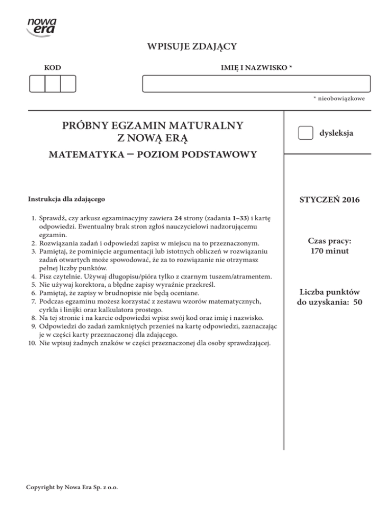 WPISUJE ZDAJĄCY KOD IMIĘ I NAZWISKO * * nieobowiązkowe PRÓBNY EGZAMIN MATURALNY Z NOWĄ ERĄ dysleksja matematyka - poziom PODSTAWOWY Instrukcja dla zdającego 1. Sprawdź, czy arkusz egzaminacyjny zawiera 24 strony (zadania 1–33) i kartę odpowiedzi. Ewentualny brak stron zgłoś nauczycielowi nadzorującemu egzamin. 2.Rozwiązania zadań i odpowiedzi zapisz w miejscu na to przeznaczonym. 3. Pamiętaj, że pominięcie argumentacji lub istotnych obliczeń w rozwiązaniu zadań otwartych może spowodować, że za to rozwiązanie nie otrzymasz pełnej liczby punktów. 4.Pisz czytelnie. Używaj długopisu/pióra tylko z czarnym tuszem/atramentem. 5. Nie używaj korektora, a błędne zapisy wyraźnie przekreśl. 6.Pamiętaj, że zapisy w brudnopisie nie będą oceniane. 7. Podczas egzaminu możesz korzystać z zestawu wzorów matematycznych, cyrkla i linijki oraz kalkulatora prostego. 8.Na tej stronie i na karcie odpowiedzi wpisz swój kod oraz imię i nazwisko. 9. Odpowiedzi do zadań zamkniętych przenieś na kartę odpowiedzi, zaznaczając je w części karty przeznaczonej dla zdającego. 10. Nie wpisuj żadnych znaków w części przeznaczonej dla osoby sprawdzającej. Copyright by Nowa Era Sp. z o.o. STYCZEŃ 2016 Czas pracy: 170 minut Liczba punktów do uzyskania: 50 Próbny egzamin maturalny z Nową Erą Matematyka – poziom podstawowy W zadaniach od 1. do 23. wybierz i zaznacz na karcie odpowiedzi poprawną odpowiedź. Zadanie 1. (0−1) Liczba 60 jest przybliżeniem z niedomiarem liczby x. Błąd względny tego przybliżenia to 4%. Liczba x jest równa A. 57,69 B. 57,6 Zadanie 2. (0−1) Dla liczb a = 2 2 i b = 2 - 2 wyrażenie A. 2 2 - 2 B. 2 C. 60,04 a jest równe b2 C. 2 ^ 2 + 1h D. 62,5 D. 4 ^2 + 2 h Zadanie 3. (0−1) Cenę towaru podwyższono o 20%. O ile procent należy obniżyć nową cenę towaru, aby po obniżce stanowiła ona 90% ceny przed zmianami? A. o 10% B. o 15% C. o 25% Zadanie 4. (0−1) Ciąg (an) jest określony wzorem a n = log ^n + 1h dla n H 1. Liczba A. log 4 B. log 6 C. 2 Zadanie 5. (0−1) Iloraz liczby 8 10 - 4 14 przez liczbę 6 3 4 $ 6 4 jest równy 1 1 A. 3 B. 6 C. 226 Zadanie 6. (0−1) 8 - 2x 2 Równanie x + 2 = x + 2 ma dokładnie 2 2 , x 2 =. A. dwa rozwiązania: x 1 = 3 3 2 B. dwa rozwiązania: x = 3 , x =- 2. C. jedno rozwiązanie: x = 2. 2 D. jedno rozwiązanie: x = 3 . 2 z 24 D. o 30% 3a 3 - a 7 jest równa a1 D. 3 D. 230 Próbny egzamin maturalny z Nową Erą Matematyka – poziom podstawowy Brudnopis 3 z 24 Próbny egzamin maturalny z Nową Erą Matematyka – poziom podstawowy Zadanie 7. (0–1) Liczba 4 spełnia nierówność a 2 x - 16 1 0 z niewiadomą x wtedy i tylko wtedy, gdy A. a ! ^-2, 2h B. a ! ^-3, -2h , ^2, 3h C. a ! " -2, 2 , D. a ! ^-3, 2h Zadanie 8. (0–1) Funkcja f przyporządkowuje każdej liczbie naturalnej n największy wspólny dzielnik liczb n oraz n + 10. Największa wartość funkcji f jest równa A. 2 B. 5 C. 10 D. 20 Zadanie 9. (0–1) Funkcja liniowa f ^ x h =-2x + b przyjmuje wartości dodatnie dla wszystkich x 1 2 i tylko dla takich. Wynika stąd, że współczynnik b jest równy A. 4 B. 2 C. 0 D. -4 Zadanie 10. (0–1) 1 Prostą o równaniu y = 2 x + 1 przesunięto wzdłuż osi Ox o cztery jednostki w prawo. Otrzymano prostą o równaniu 1 1 1 1 A. y = 2 x - 3 B. y = 2 x - 1 C. y = 2 x + 3 D. y = 2 x + 5 Zadanie 11. (0–1) Wykres funkcji kwadratowej f ^ x h = -^x + 1h2 + 5 przekształcono symetrycznie względem osi Oy i otrzymano wykres funkcji g. Wskaż równanie prostej, która jest osią symetrii wykresu funkcji g. A. x = 1 B. x =-1 C. y = 5 D. y = 1 Zadanie 12. (0–1) Pan Krzysztof pokonuje trasę Warszawa–Kraków w czasie t ze średnią prędkością v. Aby skrócić czas podróży o 20%, pan Krzysztof musi średnią prędkość A. zwiększyć o 25%. B. zwiększyć o 20%. C. zmniejszyć o 20%. D. zmniejszyć o 25%. 4 z 24 Próbny egzamin maturalny z Nową Erą Matematyka – poziom podstawowy Brudnopis 5 z 24 Próbny egzamin maturalny z Nową Erą Matematyka – poziom podstawowy Zadanie 13. (0–1) 3 Ciąg (an) jest określony wzorem a n = 4 n 2 - 24n + 90 dla n H 1. Najmniejszy wyraz ciągu (an) jest równy 3 A. 90 B. 66 4 C. -102 D. -124 Zadanie 14. (0–1) Dla pewnego kąta ostrego a trzywyrazowy ciąg _ 2 sin 2 a, Miara kąta a jest równa A. 75° B. 60° C. 45° 3 tg a, 2 cos 2 a i jest arytmetyczny. D. 30° Zadanie 15. (0–1) Kąt a jest kątem ostrym w trójkącie prostokątnym przedstawionym na rysunku. α 7 3 Liczba 4 sina jest równa A. 2 7 B. 2 2 3 C. 4 7 D. 4 3 4 Zadanie 16. (0–1) Prosta o równaniu y = -2x tworzy z osią Ox kąt rozwarty a (zobacz rysunek poniżej). y 6 5 4 3 2 1α –3 –2 –1 0 –1 1 2 x Cosinus kąta a jest równy A. -2 1 B. - 2 C. 2 5 5 6 z 24 5 D. - 5 Próbny egzamin maturalny z Nową Erą Matematyka – poziom podstawowy Brudnopis 7 z 24 Próbny egzamin maturalny z Nową Erą Matematyka – poziom podstawowy Zadanie 17. (0–1) W okrąg o środku S wpisano deltoid ABCD (zobacz rysunek poniżej). Krótsza przekątna deltoidu ma długość 4, a jego najmniejszy kąt wewnętrzny ma miarę 45°. S B Pole deltoidu jest równe B. 16 A. 16 2 C. 12 D. 8 2 Zadanie 18. (0–1) Dwa okręgi: pierwszy o środku O 1 = ^- 2, 4h i promieniu r1 = 4 oraz drugi o środku O 2 = ^6, 0h, są styczne zewnętrznie. Promień drugiego okręgu jest równy A. 4 B. 4 ^ 5 - 1h C. 2 5 D. 5 Zadanie 19. (0–1) Rysunek przedstawia ostrosłup prawidłowy trójkątny. D C A E S B Kąt między ścianą boczną a płaszczyzną podstawy ostrosłupa to A. BDES B. BDCE C. BDCS D. BDEB Zadanie 20. (0–1) Pole powierzchni bocznej walca jest 5 razy większe od sumy pól jego podstaw. Miara kąta nachylenia przekątnej przekroju osiowego tego walca do podstawy jest w przybliżeniu równa A. 79° B. 68° C. 51° 8 z 24 D. 22° Próbny egzamin maturalny z Nową Erą Matematyka – poziom podstawowy Brudnopis 9 z 24 Próbny egzamin maturalny z Nową Erą Matematyka – poziom podstawowy Zadanie 21. (