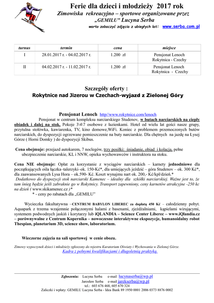 Ferie dla dzieci i młodzieży 2017 rok Zimowiska rekreacyjno – sportowe organizowane przez „GEMILU” Lucyna Serba warto zobaczyć zdjęcia z ubiegłych lat: www.serba.com.pl turnus termin cena miejsce I 28.01.2017 r. - 04.02.2017 r. 1.200 zł Pensjonat Lenoch Rokytnica - Czechy II 04.02.2017 r. - 11.02.2017 r. 1.200 zł Pensjonat Lenoch Rokytnica - Czechy Szczegóły oferty : Rokytnice nad Jizerou w Czechach-wyjazd z Zielonej Góry Pensjonat Lenoch http//www.rokytnice.com/lenoch Pensjonat w centrum kompleksu narciarskiego Studenov, w butach narciarskich na ciepły obiadek i dalej na stok. Pokoje 3\4\7 osobowe z łazienkami. Hotel od wielu lat gości nasze grupy, przytulna stołówka, kawiarenka, TV, kino domowe,WiFi. Koniec z problemem przemoczonych butów narciarskich, do dyspozycji ogrzewane pomieszczenie na buty narciarskie. Dla chętnych na jazdę na Łysej Górze ( Horni Domky ) do dyspozycji Skibus. Cena obejmuje: przejazd autokarem, 7 noclegów, trzy posiłki: śniadanie, obiad i kolacja, pełne ubezpieczenie narciarskie, KL i NNW, opieka wychowawców i instruktora na stoku. Cena NIE obejmuje: Opłat za korzystanie z wyciągów narciarskich – karnety jednodniowe dla początkujących ośla łączka–talerzyki–ok. 150-Kć*, dla umiejących jeździć – góra Studenov – ok. 300 Kć*, dla zaawansowanych Lysa Hora – ok.590- Kć. Koszt wynajmu nart ok. 200,- Kć/kpl/dzień.* Dodatkowo do dyspozycji stok narciarski Kamenec – idealny dla szkółki narciarskiej. Ważne jest to, że tam śnieg będzie jeśli zabraknie go w Rokytnicy. Transport zapewniony, ceny karnetów atrakcyjne -250 kc na dzień ( www.skikamenec.cz )* * - ceny po rabatach dla „GEMILU” Wycieczka fakultatywna –CENTRUM BABYLON LIBEREC za dopłatą 450 Kć – całodzienny pobyt. Aquapark z trzema wzajemnie połączonymi halami z basenami, zjeżdżalniami, kąpielami wirującymi, systemem podwodnych jaskiń i korytarzy lub iQLANDIA – Science Center Liberec – www.iQlandia.cz – porównywalne z Centrum Kopernika – nowoczesne interaktywne ekspozycje, humanoidalny robot Thespian, planetarium 3D, science show, laboratorium. Wieczorne zajęcia na sali sportowej w cenie obozu. Zimowy wypoczynek dzieci i młodzieży zgłoszony do rejestru Kuratorium Oświaty i Wychowania w Zielonej Górze. Kadra z pełnymi kwalifikacjami i długoletnią praktyką. Lucyna Serba e-mail [email protected] Jarosław Serba e-mail [email protected] tel.: 603 676 468, 605 670 324 Zaliczki i wpłaty: GEMILU Lucyna Serba - Idea Bank 89 1950 0001 2006 0373 8876 0002 Zgłoszenia: