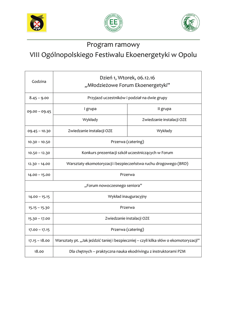 Program ramowy VIII Ogólnopolskiego Festiwalu Ekoenergetyki w Opolu Godzina Dzień 1, Wtorek, 06.12.16 „Młodzieżowe Forum Ekoenergetyki” 8.45 – 9.00 Przyjazd uczestników i podział na dwie grupy 09.00 – 09.45 09.45 – 10.30 I grupa II grupa Wykłady Zwiedzanie instalacji OZE Zwiedzanie instalacji OZE Wykłady 10.30 – 10.50 Przerwa (catering) 10.50 – 12.30 Konkurs prezentacji szkół uczestniczących w Forum 12.30 – 14.00 Warsztaty ekomotoryzacji i bezpieczeństwa ruchu drogowego (BRD) 14.00 – 15.00 Przerwa „Forum nowoczesnego seniora” 14.00 – 15.15 Wykład inauguracyjny 15.15 – 15.30 Przerwa 15.30 – 17.00 Zwiedzanie instalacji OZE 17.00 – 17.15 Przerwa (catering) 17.15 – 18.00 Warsztaty pt. „Jak jeździć taniej i bezpieczniej – czyli kilka słów o ekomotoryzacji” 18.00 Dla chętnych – praktyczna nauka ekodrivingu z instruktorami PZM Program ramowy VIII Ogólnopolskiego Festiwalu Ekoenergetyki w Opolu Godzina Dzień 1, Wtorek, 06.12.16 „Samorządowe Forum Ekoenergetyczne” 9.30 – 10.00 Otwarcie VIII Ogólnopolskiego Festiwalu Ekoenergetyki oraz Samorządowego Forum Ekoenergetycznego 10.00 – 10.40 Wykład inauguracyjny 10.40 – 11.25 Prezentacja rekomendowanych rozwiązań (projektów) samorządowych w zakresie ekoenergetyki (część I) 11.25 – 11.40 Przerwa 11.45 – 13.00 Panel dyskusyjny pt. „Priorytety i obszary aktywności samorządów w zakresie energetyki rozproszonej i efektywności energetycznej” 13.00 – 13.15 Przerwa 13.15 – 14.15 Prezentacja rekomendowanych rozwiązań (projektów) samorządowych w zakresie ekoenergetyki (część II) 14.15 – 14.30 Przerwa 14.30 – 15.45 Grupa I Grupa II Warsztaty pt. „Nowe regulacje prawne i źródła finansowania samorządowych projektów w zakresie ekoenergetyki i energetycznej konwersji odpadów komunalnych” Narada przedstawicieli samorządów pt. „Zadania samorządów w zakresie ekoenergetyki oraz przyjęcie założeń samorządowego raportu o stanie ekoenergetyki w Polsce” Program ramowy VIII Ogólnopolskiego Festiwalu Ekoenergetyki w Opolu Godzina Dzień 2, Środa, 07.12.16 „Forum Ekoenergetyki” 8.30 – 09.45 Panel młodych naukowców 09.45 – 10.00 Przerwa 10.00 – 10.15 Otwarcie „Forum Ekoenergetyki” 10.15 – 10.50 Wykład inauguracyjny 10.50 – 11.00 Przerwa 11.00 – 13.00 Warsztaty dobrych praktyk pt. „Technologie, przechowywania energii, oszczędności” Sesja plenarna konferencji naukowej pt. „Mikroźródła energii w energetyce konsumenckiej” 13.00 – 13.15 Przerwa 13.15 – 14.30 Panel dyskusyjny pt. „Jak powinien wyglądać optymalny miks energetyczny dla Polski” 14.30 – 14.45 Przerwa 14.45 – 16.00 Konferencja naukowa cd. Dyskusja panelowa pt. „Problemy przyłączeniowe do sieci elektroenergetycznej mikro i małych źródeł energii” Program ramowy VIII Ogólnopolskiego Festiwalu Ekoenergetyki w Opolu Godzina Dzień 3, Czwartek, 08.12.16 „Eko-Moto-Forum” 8.30 – 09.45 Panel młodych naukowców 09.45 – 10.00 Przerwa 10.00 – 10.15 Otwarcie „Eko-Moto-Forum” 10.15 – 10.50 Wykład inauguracyjny 10.50 – 11.00 Przerwa 11.00 – 13.00 Konferencja popularnonaukowa pt. „Aktualne problemy rozwoju pojazdów elektrycznych i hybrydowych” Warsztaty dobrych praktyk pt. „Innowacyjne rozwiązania proekologiczne w motoryzacji” Seminarium dla diagnostów samochodowych – „Zmiany w systemie działalności SKP. Specyfika kontroli pojazdów z alternatywnym napędem” 13.00 – 13.15 Przerwa 13.15 – 14.30 Panel dyskusyjny „Jakiej infrastruktury oraz wsparcia organizacyjnego i prawnego wymaga rozwój ekomotoryzacji w Polsce” 14.30 – 14.45 Przerwa 14.45 – 16.00 18.30 – 21.00 Konferencja popularnonaukowa cd. Panel dyskusyjny „Doświadczenia w eksploatacji pojazdów z alternatywnym napędem w transporcie komunalnym (autobusy elektryczne, trolejbusy autonomiczne, biodiesel, CNG)” Uroczysta VIII Gala z okazji wręczenia Statuetek „Zielonego Feniksa” (wstęp wyłącznie za zaproszeniem!) Program ramowy VIII Ogólnopolskiego Festiwalu Ekoenergetyki w Opolu Dzień 4, Piątek, 09.12.16 „Międzynarodowe Forum Ekoenergetyki” 10.20 – 11.00 Otwarcie „Międzynarodowego Forum Ekoenergetyki” 11.00 – 11.30 Wykład inauguracyjny 11.30 – 11.40 Przerwa 11.40 – 13.20 Konferencja popularnonaukowa pt. „Aktualne kierunki badań nad ekoenrgetyką” w krajach uczestniczących w konferencji Warsztaty dobrych praktyk pt. „Przegląd najbardziej innowacyjnych rozwiązań i technologii” w krajach uczestniczących w konferencji 13.20 – 13.40 Przerwa 13.40 – 15.00 Międzynarodowy panel dyskusyjny pt. „Dotychczasowe doświadczenia w rozwoju ekoenergetyki – sukcesy i porażki”