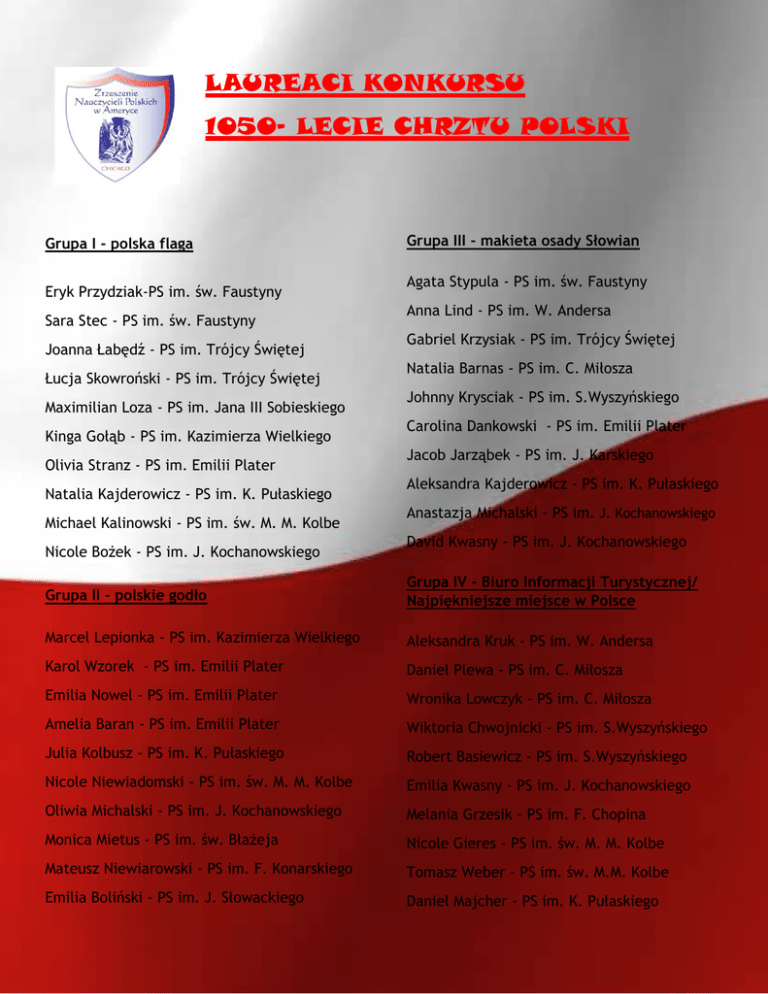 LAUREACI KONKURSU 1050- LECIE CHRZTU POLSKI Grupa I - polska flaga Eryk Przydziak-PS im. św. Faustyny Sara Stec - PS im. św. Faustyny Joanna Łabędź - PS im. Trójcy Świętej Łucja Skowroński - PS im. Trójcy Świętej Maximilian Loza - PS im. Jana III Sobieskiego Kinga Gołąb - PS im. Kazimierza Wielkiego Olivia Stranz - PS im. Emilii Plater Natalia Kajderowicz - PS im. K. Pułaskiego Michael Kalinowski - PS im. św. M. M. Kolbe Nicole Bożek - PS im. J. Kochanowskiego Grupa III - makieta osady Słowian Agata Stypula - PS im. św. Faustyny Anna Lind - PS im. W. Andersa Gabriel Krzysiak - PS im. Trójcy Świętej Natalia Barnas - PS im. C. Miłosza Johnny Krysciak - PS im. S.Wyszyńskiego Carolina Dankowski - PS im. Emilii Plater Jacob Jarząbek - PS im. J. Karskiego Aleksandra Kajderowicz - PS im. K. Pułaskiego Anastazja Michalski - PS im. J. Kochanowskiego David Kwasny - PS im. J. Kochanowskiego Grupa II - polskie godło Grupa IV - Biuro Informacji Turystycznej/ Najpiękniejsze miejsce w Polsce Marcel Lepionka - PS im. Kazimierza Wielkiego Aleksandra Kruk - PS im. W. Andersa Karol Wzorek - PS im. Emilii Plater Daniel Plewa - PS im. C. Miłosza Emilia Nowel - PS im. Emilii Plater Wronika Lowczyk - PS im. C. Miłosza Amelia Baran - PS im. Emilii Plater Wiktoria Chwojnicki - PS im. S.Wyszyńskiego Julia Kolbusz - PS im. K. Pułaskiego Robert Basiewicz - PS im. S.Wyszyńskiego Nicole Niewiadomski - PS im. św. M. M. Kolbe Emilia Kwasny - PS im. J. Kochanowskiego Oliwia Michalski - PS im. J. Kochanowskiego Melania Grzesik - PS im. F. Chopina Monica Mietus - PS im. św. Błażeja Nicole Gieres - PS im. św. M. M. Kolbe Mateusz Niewiarowski - PS im. F. Konarskiego Tomasz Weber - PS im. św. M.M. Kolbe Emilia Boliński - PS im. J. Słowackiego Daniel Majcher - PS im. K. Pułaskiego