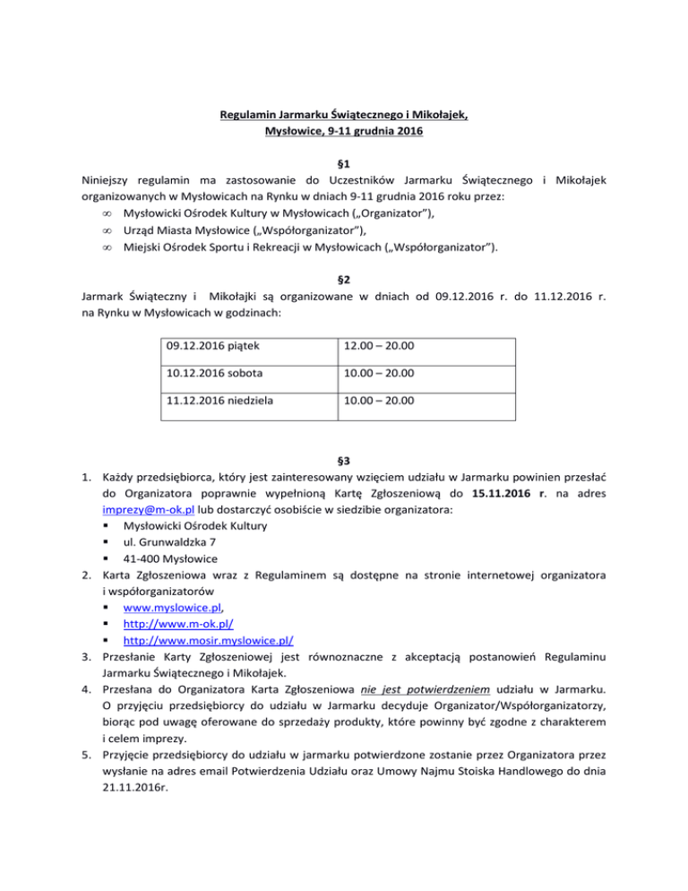 Regulamin Jarmarku Świątecznego i Mikołajek, Mysłowice, 9-11 grudnia 2016 §1 Niniejszy regulamin ma zastosowanie do Uczestników Jarmarku Świątecznego i Mikołajek organizowanych w Mysłowicach na Rynku w dniach 9-11 grudnia 2016 roku przez: • Mysłowicki Ośrodek Kultury w Mysłowicach („Organizator”), • Urząd Miasta Mysłowice („Współorganizator”), • Miejski Ośrodek Sportu i Rekreacji w Mysłowicach („Współorganizator”). §2 Jarmark Świąteczny i Mikołajki są organizowane w dniach od 09.12.2016 r. do 11.12.2016 r. na Rynku w Mysłowicach w godzinach: 1. 2. 3. 4. 5. 09.12.2016 piątek 12.00 – 20.00 10.12.2016 sobota 10.00 – 20.00 11.12.2016 niedziela 10.00 – 20.00 §3 Każdy przedsiębiorca, który jest zainteresowany wzięciem udziału w Jarmarku powinien przesłać do Organizatora poprawnie wypełnioną Kartę Zgłoszeniową do 15.11.2016 r. na adres [email protected] lub dostarczyć osobiście w siedzibie organizatora: Mysłowicki Ośrodek Kultury ul. Grunwaldzka 7 41-400 Mysłowice Karta Zgłoszeniowa wraz z Regulaminem są dostępne na stronie internetowej organizatora i współorganizatorów www.myslowice.pl, http://www.m-ok.pl/ http://www.mosir.myslowice.pl/ Przesłanie Karty Zgłoszeniowej jest równoznaczne z akceptacją postanowień Regulaminu Jarmarku Świątecznego i Mikołajek. Przesłana do Organizatora Karta Zgłoszeniowa nie jest potwierdzeniem udziału w Jarmarku. O przyjęciu przedsiębiorcy do udziału w Jarmarku decyduje Organizator/Współorganizatorzy, biorąc pod uwagę oferowane do sprzedaży produkty, które powinny być zgodne z charakterem i celem imprezy. Przyjęcie przedsiębiorcy do udziału w jarmarku potwierdzone zostanie przez Organizatora przez wysłanie na adres email Potwierdzenia Udziału oraz Umowy Najmu Stoiska Handlowego do dnia 21.11.2016r. 6. Po otrzymaniu potwierdzenia przedsiębiorca zobowiązany jest do podpisania Umowy Najmu Stoiska Handlowego. 7. W trakcie Jarmarku preferowana jest sprzedaż produktów o charakterze świątecznym takich jak: ceramika artystyczna i użytkowa (wazy, kubki i inne naczynia, dzbany itp.), tkaniny zdobione, pamiątki, ozdoby, rękodzieło, ozdoby świąteczne, lampki, bombki, drzewka świąteczne itp., artykuły spożywcze (w tym szynki, sery, słodycze, wypieki, chleby, ciasta itp.), gastronomia (w tym grzane wino, grzane piwo, miody pitne, nalewki, wina piwa, wyroby garmażeryjne itp.). 1. 2. 3. 4. 5. 6. 7. 8. 9. 10. 11. 12. 13. §4 Stoisko handlowe zostanie udostępnione Uczestnikowi na podstawie zawartej z Organizatorem Umowy Najmu stoiska Handlowego. Działalność handlowa Uczestnika może być prowadzona wyłącznie w ramach posiadanego Stoiska Handlowego w godzinach wskazanych w §2, a rodzaj oferowanych produktów musi być zgodny ze wskazanym na Karcie Zgłoszeniowej. Wybór lokalizacji Stoiska handlowego leży po stronie Organizatora /Współorganizatorów. Organizator/ Współorganizatorzy zastrzegają sobie prawo do zmiany lokalizacji, rodzaju i wielkości stoiska handlowego przyznanego Uczestnikowi. Stoiska będą wyposażone w dostęp do gniazda elektrycznego. Zapewnienie wszelkiego pozostałego wyposażenia Stoisk np. półki, regały, krzesła, leży po stronie Uczestnika. Uczestnik może reklamować swoją działalność oraz produkty w miejscach wyznaczonych przez organizatora. Każde Stoisko powinno zostać wyposażone przez Uczestnika w gaśnicę o pojemności 2 kg o symbolu ABC. Stoisko handlowe zostanie przekazane Uczestnikowi minimum 1 godzinę przed rozpoczęciem Jarmarku Świątecznego zgodnie z harmonogramem wskazanym w §2. Przekazanie nastąpi wyłącznie po dokonaniu pełnej wpłaty za udział w Jarmarku Świątecznym oraz podpisaniu protokołu przejęcia stanowiska Odbiór stoisk handlowych nastąpi w ostatnim dniu wynajmu stoiska handlowego w godz.20.0020.30 Uczestnik zobowiązany jest przekazać stoisko handlowe w takim stanie, w jakim zostało mu przekazane przez Organizatora. Stoisko handlowe powinno być uprzątnięte (śmieci wyrzucone) i oczyszczone z naniesionych dekoracji. Zaopatrzenie Stoisk może odbywać się wyłącznie poza godzinami wskazanymi w §2. Wszelkie zauważone uszkodzenia stoisk handlowych lub też włamania do nich powinny być niezwłocznie zgłoszone Organizatorowi przez Uczestnika. Stoiska będą udekorowane przez Organizatora. §5 Uczestnik jest zobowiązany do: • prowadzenia działalności handlowej w okresie i godzinach wskazanych w §2, • zabezpieczenia Stoiska handlowego po każdym dniu sprzedaży, w tym wyłączenia oświetlenia, • utrzymania porządku na Stoisku oraz w jego bezpośrednim otoczeniu, • • • przebywania lub pozostawienia osoby odpowiedzialnej na stoisku w godzinach trwania Jarmarku Świątecznego, pokrycia kosztów naprawy lub zakupu uszkodzonych lub zaginionych elementów stoiska, przestrzegania bezwzględnie obowiązujących przepisów regulujących sprzedaż oferowanych produktów oraz stosowanie urządzeń pomiarowych dopuszczonych do obrotu. §6 Koszt wynajmu Stoiska Uczestnikowi przez trzy dni (bez względu na asortyment) wynosi: 200,00 zł brutto, słownie: dwieście złotych, zero groszy. §7 Uczestnikowi zabrania się: • prowadzenia działalności na terenie Jarmarku, naruszającej porządek i spokój publiczny, dobre obyczaje i uczucia religijne, • udostępniania Stosika handlowego lub przydzielonego miejsca osobom trzecim bez zgody Organizatora / Współorganizatora, • obudowywania i plakatowania powierzchni Stoisk handlowych bez zgody Organizatora / Współorganizatora, • dokonywania przeróbek w Stoisku handlowym, a w szczególności ingerencji w instalację elektryczną, w konstrukcję dachu, wkręcania wkrętów, wbijania gwoździ, wbijania zszywek itp., • używania otwartego ognia, • sprzedaży podróbek produktów oraz produktów, na które Uczestnik nie posiada zezwoleń, • nocowania w miejscu stoiska handlowego, • sprzedaży narkotyków, środków p
