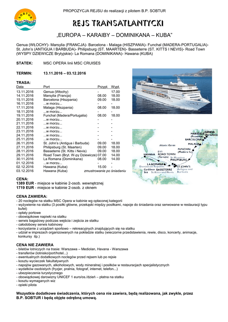 PROPOZYCJA REJSU do realizacji z pilotem B.P. SOBTUR REJS TRANSATLANTYCKI „EUROPA – KARAIBY – DOMINIKANA – KUBA” Genua (WŁOCHY)- Marsylia (FRANCJA)- Barcelona - Malaga (HISZPANIA)- Funchal (MADERA-PORTUGALIA)St. John’s (ANTIGUA I BARBUDA)- Philipsburg (ST. MAARTEN)- Basseterre (ST. KITTS I NEVIS)- Road Town (WYSPY DZIEWICZE Brytyjskie)- La Romana (DOMINIKANA)- Hawana (KUBA) STATEK: MSC OPERA linii MSC CRUISES TERMIN: 13.11.2016 – 03.12.2016 TRASA: Data 13.11.2016 14.11.2016 15.11.2016 16.11.2016 17.11.2016 18.11.2016 19.11.2016 20.11.2016 21.11.2016 22.11.2016 23.11.2016 24.11.2016 25.11.2016 26.11.2016 27.11.2016 28.11.2016 29.11.2016 30.11.2016 01.12.2016 02.12.2016 03.12.2016 Port Przypł. Wypł. Genua (Włochy) 17.00 Marsylia (Francja) 08.00 18.00 Barcelona (Hiszpania) 09.00 18.00 ...w morzu... Malaga (Hiszpania) 08.00 18.00 ...w morzu... Funchal (Madera/Portugalia) 08.00 18.00 ...w morzu... ...w morzu... ...w morzu... ...w morzu... ...w morzu... ...w morzu... St. John’s (Antigua i Barbuda) 09.00 18.00 Philipsburg (St. Maarten) 09.00 18.00 Basseterre (St. Kitts i Nevis) 09.00 18.00 Road Town (Bryt. W-py Dziewicze) 07.00 14.00 La Romana (Dominikana) 08.00 14.00 ...w morzu... Hawana (Kuba) 15.00 Hawana (Kuba) zmustrowanie po śniadaniu CENA: 1389 EUR - miejsce w kabinie 2-osob. wewnętrznej 1719 EUR - miejsce w kabinie 2-osob. z oknem CENA ZAWIERA: - 20 noclegów na statku MSC Opera w kabinie wg opłaconej kategorii - wyżywienie na statku (3 posiłki główne, przekąski między posiłkami, napoje do śniadania oraz serwowane w restauracji typu bufet) - opłaty portowe - obowiązkowe napiwki na statku - serwis bagażowy podczas wejścia i zejścia ze statku - całodobowy serwis kabinowy - korzystanie z urządzeń sportowo – rekreacyjnych znajdujących się na statku - udział w imprezach organizowanych na pokładzie statku (wieczorne przedstawienia, rewie, disco, koncerty, animacje, konkursy itp.) CENA NIE ZAWIERA - biletów lotniczych na trasie: Warszawa – Mediolan, Havana - Warszawa - transferów (lotnisko/port/hotel...) - ewentualnych dodatkowych noclegów przed rejsem lub po rejsie - kosztu wycieczek fakultatywnych - napojów gazowanych, alkoholowych, wody mineralnej i posiłków w restauracjach specjalistycznych - wydatków osobistych (fryzjer, pralnia, fotograf, internet, telefon...) - ubezpieczenia turystycznego - obowiązkowej darowizny UNICEF 1 euro/os./dzień – płatna na statku - kosztu wymaganych wiz - opieki pilota Wszystkie dodatkowe świadczenia, których cena nie zawiera, będą realizowana, jak zwykle, przez B.P. SOBTUR i będą objęte odrębną umową.