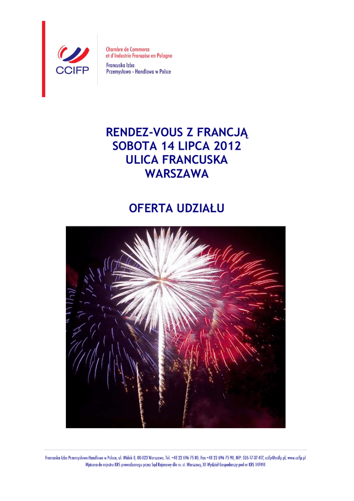 RENDEZ-VOUS Z FRANCJĄ SOBOTA 14 LIPCA 2012 ULICA FRANCUSKA WARSZAWA OFERTA UDZIAŁU Z okazji święta narodowego Francji, Francuska Izba Przemysłowo-Handlowa w Polsce przy współpracy z Instytutem Francuskim oraz firmą Sopexa S.A. pragnie zorganizować na ulicach Warszawy w dniu 14 lipca 2012 r. wydarzenie pod tytułem „Rendez-vous z Francją”. Patronat nad nim objął Burmistrz Dzielnicy Pragi Południe. Głównym celem tego wydarzenia jest promocja Francji w Polsce, zaznaczenie bliskich relacji obu państw oraz licznej obecności francuskich firm w Polsce. Przewidujemy, że na Saskiej Kępie, na ulicy Francuskiej, która zostanie zamknięta dla ruchu kołowego stanie minimum 40 stoisk, scena, na której przez cały dzień będziemy proponować wiele atrakcji, strefa dla dzieci i strefa sportowa. To wydarzenie pozwoli na promocję wszystkich firm i instytucji współpracujących i związanych z Francją (stowarzyszenia, agencje reklamowe, media, przedszkola, szkoły, restauracje, etc.). Biorąc udział w tym wydarzeniu i wystawiając się w tym niecodziennym i oryginalnym miejscu francuskie firmy istniejące w Polsce będą miały możliwość zaprezentowania wielu aspektów swojej działalności oraz okazję do zwiększenia popularności swojej marki. Będzie to też okazja do podzielenia się z warszawiakami swoim „know-how”, francuskim „art. de vivre”, do sprawienia by uczestnicy tej imprezy poczuli Francję wszystkimi zmysłami. W atrakcyjny i/lub ludyczny sposób, każda z firm będzie mogła zaprezentować swoje działania (w tym CSR), czy produkty, oraz przekazać szerokiej publiczności istotne dla niej treści. Różne atrakcje pozwolą także na zaprezentowanie rozległej oferty firm kierujących się do biznesu, wspierających samorządy, etc. W ten wyjątkowy dzień, warszawiacy będą mogli zapoznać się z francuską kuchnią (degustacje win, prezentacje kulinarne, nauka gotowania, etc.), nowościami kosmetycznymi, fryzjerskimi i modowymi (pokazy fryzur, mody, badanie włosa, ocena stanu skóry), sportowymi, nowymi technologiami, etc. oraz francuską kulturą (piosenki, wystawa zdjęć, koncerty, etc.).. Wieczorem CCIFP organizuje „Wieczór francuski” w Centrum Kultury Saska Kępa, które znajduje się na przedłużeniu ulicy Francuskiej. Podczas koktajlu wszyscy sponsorzy, przedstawiciele władz miasta i dzielnicy Praga Południe, osobistości świata polityki i biznesu oraz nasi goście VIP będą mieć okazję do poznania tego nowoczesnego i przestronnego miejsca jeszcze przed oficjalną inauguracją. By zakończyć wieczór w rytmach francusko-polskich dla miłośników tańca przygotowaliśmy parkiet taneczny. Udział w „Wieczorze francuskim” jest odpłatny i możliwy tylko dla firm stowarzyszonych. Wydarzenie: RENDEZ VOUS Z FRANCJĄ Miejsce: Warszawa, ul. Francuska, Termin: Sobota 14 lipca 2012, w godz. 12.00 – 22.00 Organizatorzy: Francuska Izba Przemysłowo-Handlowa w Polsce, Współorganizatorzy: Sopexa S. A., Instytut Francuski w Polsce, Skierowany do : Szerokiej publiczności: warszawiaków, francuskiej społeczności w Polsce, mediów, turystów… Spodziewamy się, że wydarzenie odwiedzi blisko 3 tys. osób. Wstęp wolny. ____________________________________ Wydarzenie: WIECZÓR FRANCUSKI Miejsce: Centrum Kultury Saska Kępa (ul. Brukselska 23), Termin: Sobota 14 lipca 2012, w godz. 20.00 – 24.00 Skierowany do: Sponsorów wydarzenia „Rendez-vous z Francją”, przedstawicieli władz miasta i dzielnicy, gości VIP – wstęp wolny. Wszystkie firmy stowarzyszone CCIFP zapraszamy do udziału odpłatnie (100 PLN + VAT/ 1 osoba; ilość miejsc ograniczona!). „Rendez-vous z Francją” będzie największym wydarzeniem w kalendarzu Francuskiej Izby Przemysłowo-Handlowej w Polsce w 2012 r. Realizacja tego przedsięwzięcia będzie możliwa jedynie przy masowym i silnym zaangażowaniu wszystkich francuskich firm obecnych w Polsce oraz tych zainteresowanych polskim rynkiem. Ponieważ udział w imprezie dla odwiedzających jest bezpłatny gorąco zachęcamy do włączenia się do tej inicjatywy. Oferujemy kilka możliwości udziału: - Wystawca na stoisku, - Wystawca na stoisku spożywczym, - Wystawca na wolnej przestrzeni (cena za 1 mkw), - Partner złoty, - Partner srebrny, - Partner atrakcji/animacji/pokazu,… I. WYSTAWCA – STOISKO STANDARDOWE LUB SPOŻYWCZE Cena : 4 800 PLN + VAT DLA DUŻYCH FIRM / 2 600 + VAT DLA MśP* Powierzchnia pod namiotem 9m², Stół + 2 krzesła, Podłączenie do prądu (1 kontakt), Oświetlenie w godzinach wieczornych, Komunikacja dot. imprezy: o Drukowanie plakatów, o Plakaty reklamowe w Warszawie, o Reklama w radiu (stacja do potwierdzenia), o Reklama na stacjach metra, o Reklama w Internecie (na stronie CCIFP, na stronach www partnerów medialnych, w sieciach społecznościowych, inne). Koszty ogólne wspólne: ochrona, ubezpieczenie, pomoc medyczna, recepcja, hostessy, transport, scenografia, dostęp do wody, barierki, sanitariaty, sprzątanie, etc. * Dodatkowo dla firm spożywczych: - lodówka, dostęp do kasy fiskalnej, koncesja na sprzedaż alkoholu i produktów spożywczych. II. WYSTAWCA – TEREN BEZ STOISKA Cena: 1 m² = 530 PLN +VAT DLA DUŻYCH FIRM / 300 PLN + VAT DLA MśP* + koszty dodatkowe Podłączenie do prądu, Komunikacja dot. imprezy (jw.), Koszty ogólne wspólne: ochrona, ubezpieczenie, pomoc medyczna, recepcja, hostessy, transport, scenografia, dostęp do wody, barierki, sanitariaty, sprzątanie, etc. *MśP: ilość zatrudnionych -> poniżej 50 os.; roczne obroty -> poniżej 50 mln PLN III. PARTNER ZŁOTY Cena: 30 000 PLN + VAT Logo na zaproszeniach oraz na plakatach, Logo z aktywnym linkiem na stronie CCIFP poświęconej wydarzeniu, Obecność wizualna podczas imprezy (banner,…), 10 zaproszeń indywidualnych do strefy VIP podczas „Wieczoru francuskiego” (bufet w cenie), Podziękowania w biuletynie CCIFP oraz w reportażu z „Wieczoru francuskiego” zamieszczonym na stroni