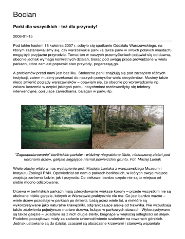 Bocian Parki dla wszystkich - też dla przyrody! 2008-01-15 Pod takim hasłem 18 kwietnia 2007 r. odbyło się spotkanie Oddziału Warszawskiego, na którym zastanawialiśmy się, czy warszawskie parki (a także parki w innych polskich miastach) mogą być przyjazne przyrodzie. Temat ten w naszych przemyśleniach pojawiał się od dawna, obecnie jednak wymaga konkretnych działań, biorąc pod uwagę prace prowadzone w wielu parkach, które zamiast poprawić stan przyrody, pogarszają go. A problemów przed nami jest bez liku. Stołeczne parki znajdują się pod zarządem różnych instytucji, zatem musimy przekonać do naszych pomysłów wielu decydentów. Musimy także nieco zmienić poglądy warszawiaków – obawiam się, że obecnie po wprowadzeniu np. zakazu koszenia w części jakiegoś parku, natychmiast rozdzwoniłyby się telefony interwencyjne, opisujące zaniedbania, bałagan w parku itp. "Zagospodarowanie" berlińskich parków - widzimy niegrabione liście, niekoszoną zieleń pod koronami drzew, gałęzie sięgające niemal powierzchni gruntu. Fot. Maciej Luniak Wiele otuchy wlało w nas wystąpienie prof. Macieja Luniaka z warszawskiego Muzeum i Instytutu Zoologii PAN. Opowiedział on nam o parkach berlińskich, w których swoje miejsce znajdują zarówno ludzie, jak i przyroda. Co ciekawe, bardzo często nie są to miejsca od siebie mocno odizolowane. Drzewa w berlińskich parkach mają zdecydowanie większe korony – przede wszystkim nie są obcinane niskie gałęzie, których w Warszawie praktycznie nie ma. Co jest bardzo ważne – wiele drzew pozostaje w parkach po śmierci. Leżą przez wiele lat, a niektóre są wykorzystywane jako naturalne krawężniki, odgraniczające alejkę od trawnika. Nie wzbudzają także zdziwienia pojedyncze martwe drzewa, leżące w parkowych stawach. Wykorzystywane są także gałęzie – układane są z nich długie sterty, biegnące w większej odległości od alejek. Podobno początkowo miały za zadanie uniemożliwienie szaleństw na rowerach górskich. Jednak ustawiane są do dzisiaj, czasami są obsadzane krzewami i stanowią wspaniałe środowisko dla wielu bezkręgowców, a także dla drobnych gryzoni. Martwe drewno w berlińskich parkach: z lewej płotek z gałęzi, z prawej pnie wykorzystane jako ograniczniki alejki. Fot. Maciej Luniak Nieustanne koszenie trawy i grabienie liści nie obejmuje całych parków. Na przykład przestrzenie pod koronami drzew czy okolice krzewów pozostają niekoszone, a liście nie są spod nich usuwane. Umożliwia to przeżycie wielu zwierzętom. Zamiast tego, stosuje się podlewanie. Podlewa się dużo obficiej i częściej niż w Warszawie – a pamiętajmy, że ilość opadów u nas jest dużo mniejsza niż w Berlinie. Może z racji częstego nawadniania, nie widać miejsc silnie wydeptanych (a na niektórych trawnikach można np. urządzać całodniowe grillowania). Zimą w parkach nie stosuje się żadnych środków, które ułatwiałyby ludziom poruszanie się po alejkach. Nie wolno solić (tego nie wolno w całym Berlinie...), nie sypie się także piasku. Zamiast tego są tabliczki, informujące o tym, że w okresie zimy każdy wchodzi do parku na swoją własną odpowiedzialność. Niewygrabione liście, leżące drzewo, w dali płotek z gałęzi. Zdjęcie niestety pochodzi z centrum Berlina, ale może i w Warszawie będzie podobnie. Fot. Maciej Luniak Z opisu berlińskich parków wynikało, że ich utrzymanie jest wiele tańsze niż parków warszawskich, a jednocześnie efekt dla przyrody jest ogromny. Nikt nie zgłasza tam pomysłów znanych z Polski – np. wymiany kilkudziesięcioletniej alei zdrowych jesionów na japońskie wiśnie, sprowadzone z Holandii. Czy uda się wprowadzić podobne rozwiązania w Polsce? Zobaczymy. Znając tego typu pomysły na pewno łatwo nie będzie, ale będziemy się o to starać. Marek Kowalski 18 IV 2007 r. Podyskutuj o tym na Forum Przyrodniczym "Bocian" Warszawskie parki a przyroda