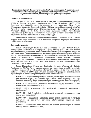 Europejska Agencja Obrony prowadzi działania zmierzające do ujednolicenia w państwach Unii Europejskiej przepisów dotyczących zdatności do lotów wojskowych statków powietrznych (w tym bezpilotowych). Ujednolicenie wymagań W dniu 10 listopada 2008 roku Rada Sterująca Europejskiej Agencji Obrony (EDA) w formule Krajowych Dyrektorów do Spraw Uzbrojenia (NAD), (EDA Document No. 2008/39) uzgodniła utworzenie pod auspicjami EDA, Forum Wojskowych Nadzorów Zdatności do Lotu [ Military Airworthiness Autority (MAWA) Forum] w celu przygotowania Zharmonizowanych Europejskich Wojskowych Wymagań Zdatności do Lotu [Harmonised European Military Airworthiness Requirements (EMARs)] tj. dokumentów regulujących tematykę zdatności do lotu wojskowych statków powietrznych w całej Europie (rys.). Na spotkaniu ministrów obrony w Brukseli w dniu 17 listopada 2009 r. została przyjęta przez kraje zrzeszone w EDA deklaracja polityczna dotycząca opracowania i implementacji EMAR-ów. Zakres obowiązków Forum Wojskowych Nadzorów nad Zdatnością do Lotu (MAWA Forum) funkcjonujące w strukturach Europejskiej Agencji Obrony (EDA) obecnie zrzesza wojskowe nadzory wszystkich państw członkowskich UE i prowadzi prace mające na celu stworzenie i zaimplementowanie wspólnych przepisów dotyczących zdatności do lotu, wspólnego procesu certyfikacji, uzgodnień organizacyjnych, przepisów oraz zasad ich wzajemnego uznawania. Równolegle Forum prowadzi działania zmierzające do stworzenia Organizacji Połączonych Europejskich Wojskowych Nadzorów nad Zdatnością do Lotu (European Military Joint Airworthiness Authorities’ Organization – EMJAAO). Przez Europejskie Forum ds. Zdatności do Lotu Wojskowych Statków Powietrznych MAWA Forum opracowywane są następujące projekty przepisów i regulacji związanych z wdrożeniem standardów zdatności do lotu wojskowych statków powietrznych EMAR (rys.). Swoim zakresem obejmują one przedsięwzięcia organizacyjne, a także wymagania sprzętowe do których należą: EMAR 21 – certyfikacja wojskowych statków powietrznych, ich komponentów, podzespołów, części, wyposażenia i produktów z nimi związanych oraz tryb i sposób certyfikacji instytucji projektowych, produkcyjnych, modernizacyjnych; EMAR M – zarządzanie procesem zachowania ciągłej zdatności do lotu wojskowych statków powietrznych; EMAR 145 – wymagania dla wojskowych obsługowych; organizacji remontowo - EMAR 66 – tryb i metodyka certyfikowania personelu obsługowego oraz ocena jego kompetencji; EMAR 147 – organizacja i realizacja zadań przez organizacje i instytucje zajmujące się szkoleniem personelu obsługującego wojskowe statki powietrzne; EMACC – europejskie kody wojskowych statków powietrznych European Military Aircraft Certification Code, Zharmonizowane Europejskie Wojskowe Wymagania Zdatności do Lotu (EMARs) są jedynie wymaganiami a nie regulacjami prawnymi i każde państwo UE jest odpowiedzialne za implementację tych wymagań do narodowych przepisów zdatności do lotu wojskowych statków powietrznych. Niemniej jednak przyjęcie przedmiotowych regulacji będzie miało znaczący wpływ na zabezpieczenie eksploatacji wojskowych statków powietrznych, głównie ze względu na procesy certyfikacji wyrobów lotniczych. Kolejne ogniwo Niezależnie od działalności MAWA Forum w czerwcu 2010 roku Rada Sterująca Wojskowego Komitetu Zdatności do Lotów (MCASB-Millitary Committee Airworthiness Steering Board) powołała do życia wyspecjalizowaną komórkę Airworthiness Working Group (AwWG), celem określenia głównych regulacji oraz dokumentów „organizacyjnych” w zakresie zdatności do lotów wojskowych statków powietrznych państw NATO”. Na dotychczasowe spotkania AwWG, delegowani byli przedstawiciele z poszczególnych krajów członkowskich NATO, tj. agencji NATO (m.in. NAPMA, NAMSA-NSPA, NAGSMA, NAMA), Dowództwo Sił Wczesnego Ostrzegania i Dowodzenia NATO (NAEW&C FC), a także innych podmiotów (np. Europaen Air Transport Command – EATC, Europaen Air Group-EAG), które opracowują dokumenty standaryzacyjne i ewentualnie wskazują różnice w rozwiązaniach narodowych. By zapobiec dublowania wysiłku nad opracowywaniem dokumentów oraz samych dokumentów, AwWG ściśle współpracuje z Forum (MAWA Forum). Mając na uwadze powyższe ustalono wyraźny podział kompetencji. Zgodnie z tym AwWG przygotowuje standardy w zakresie zdatności wojskowych statków powietrznych normujące kwestie organizacyjne oraz regulujące wymagania tzw. NATO Airworthiness Policy, natomiast MAWA Forum opracowuje dokumenty wykonawcze i specjalistyczne. Wytyczne polityczne NATO w zakresie zdatności określają, że wszystkie wyroby lotnicze użytkowane w tzw. „przestrzeni kontrolowanej” powinny być weryfikowane przez odpowiedni nadzór. Celem działalności stosownych komórek funkcjonalnych dowództwa NATO, prócz przygotowania stosownych dokumentów w zakresie zdatności do lotów wojskowych statków powietrznych, jest również kontrola dotrzymywania tych standardów przez państwa członkowskie. W tym celu planuje się powołać nową instytucję: NAE - NATO Airworthiness Executive, komórkę w ramach struktur NATO, która będzie normowała zakres wymagań w zakresie zdatności do lotów1. Jednocześnie należy dodać, że zakres prac AwWG nad dokumentami póki co nie obejmuje aspektów związanych z operacjami lotniczymi takich jak: procedury operacyjne, flight standards, operator training, kwalifikacje i licencjonowanie personelu lotniczego oraz kontroli ruchu lotniczego. Podjęte działania narodowe W lipcu ubiegłego roku, Minister Obrony Narodowej wydał decyzję w sprawie powołania Zespołu Zadaniowego do spraw utworzenia Władzy Lotnictwa Państwowego. Inicjatywa powołania Władzy Lotnictwa Państwowego, której MAWA byłaby jednym z kluczowych filarów, jest przedsięwzięciem od dawna oczekiwanym w lotnictwie państwowym. Powstanie odpowiednio um
