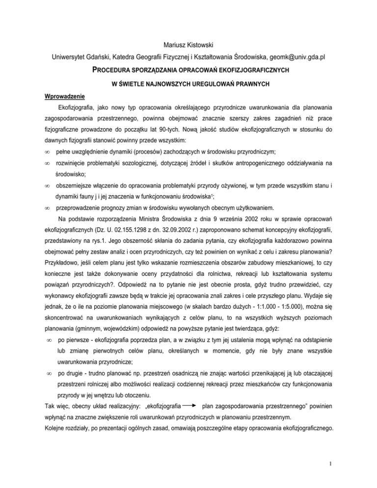 Mariusz Kistowski Uniwersytet Gdański, Katedra Geografii Fizycznej i Kształtowania Środowiska, [email protected] PROCEDURA SPORZĄDZANIA OPRACOWAŃ EKOFIZJOGRAFICZNYCH W ŚWIETLE NAJNOWSZYCH UREGULOWAŃ PRAWNYCH Wprowadzenie Ekofizjografia, jako nowy typ opracowania określającego przyrodnicze uwarunkowania dla planowania zagospodarowania przestrzennego, powinna obejmować znacznie szerszy zakres zagadnień niż prace fizjograficzne prowadzone do początku lat 90-tych. Nową jakość studiów ekofizjograficznych w stosunku do dawnych fizjografii stanowić powinny przede wszystkim: • pełne uwzględnienie dynamiki (procesów) zachodzących w środowisku przyrodniczym; • rozwinięcie problematyki sozologicznej, dotyczącej źródeł i skutków antropogenicznego oddziaływania na środowisko; • obszerniejsze włączenie do opracowania problematyki przyrody ożywionej, w tym przede wszystkim stanu i dynamiki fauny j i jej znaczenia w funkcjonowaniu środowiska1; • przeprowadzenie prognozy zmian w środowisku wywołanych obecnym użytkowaniem. Na podstawie rozporządzenia Ministra Środowiska z dnia 9 września 2002 roku w sprawie opracowań ekofizjograficznych (Dz. U. 02.155.1298 z dn. 32.09.2002 r.) zaproponowano schemat koncepcyjny ekofizjografii, przedstawiony na rys.1. Jego obszerność skłania do zadania pytania, czy ekofizjografia każdorazowo powinna obejmować pełny zestaw analiz i ocen przyrodniczych, czy też powinien on wynikać z celu i zakresu planowania? Przykładowo, jeśli celem planu jest tylko wskazanie rozmieszczenia obszarów zabudowy mieszkaniowej, to czy konieczne jest także dokonywanie oceny przydatności dla rolnictwa, rekreacji lub kształtowania systemu powiązań przyrodniczych?. Odpowiedź na to pytanie nie jest obecnie prosta, gdyż trudno przewidzieć, czy wykonawcy ekofizjografii zawsze będą w trakcie jej opracowania znali zakres i cele przyszłego planu. Wydaje się jednak, że o ile na poziomie planowania miejscowego (w skalach bardzo dużych - 1:1.000 - 1:5.000), można się skoncentrować na uwarunkowaniach wynikających z celów planu, to na wszystkich wyższych poziomach planowania (gminnym, wojewódzkim) odpowiedź na powyższe pytanie jest twierdząca, gdyż: • po pierwsze - ekofizjografia poprzedza plan, a w związku z tym jej ustalenia mogą wpłynąć na odstąpienie lub zmianę pierwotnych celów planu, określanych w momencie, gdy nie były znane wszystkie uwarunkowania przyrodnicze; • po drugie - trudno planować np. przestrzeń osadniczą nie znając wartości przenikającej ją lub otaczającej przestrzeni rolniczej albo możliwości realizacji codziennej rekreacji przez mieszkańców czy funkcjonowania przyrody w jej wnętrzu lub otoczeniu. Tak więc, obecny układ realizacyjny: „ekofizjografia plan zagospodarowania przestrzennego” powinien wpłynąć na znaczne zwiększenie roli uwarunkowań przyrodniczych w planowaniu przestrzennym. Kolejne rozdziały, po prezentacji ogólnych zasad, omawiają poszczególne etapy opracowania ekofizjograficznego. 1 Rozpoznanie i charakterystyka struktury (budowa) środowiska przyrodniczego E T A P D I A G N O Z Y E T A P Źródła antropogenicznych oddziaływań na środowisko (antropopresja) Ocena odporności środowiska na antropopresję i ocena jego zdolności do regeneracji O C E N Y Ocena jakości środowiska w odniesieniu do norm i otoczenia oraz ograniczenia w zagospodarowaniu z niej wynikające (jakość) E T A P W S K A Z A Ń Prawne formy ochrony środowiska przyrodniczego (ochrona) Skutki zmian w środowisku przyrodniczym (degradacja) Ocena zasięgu i rangi barier fizjograficznych i prawnych dla obecnego i przyszłego zagospodarowania Ocena dotychczasowego zakresu ochrony walorów i zasobów przyrodniczych Stan zagospodarowania i użytkowania środowiska przyrodniczego Opis dotychczasowych zmian w środowisku przyrodniczym (retrospekcja) Ocena przydatności środowiska dla realizacji funkcji społeczno-gospodarczych (potencjał) Ocena występowania rzeczywistych sytuacji konfliktowych w środowisku przyrodniczym (konflikty rzeczywiste) Ocena zgodności aktualnego użytkowania i zagospodarowania z uwarunkowaniami przyrodniczymi Ocena wystąpienia potencjalnych sytuacji konfliktowych w środowisku (konflikty potencjalne) Wstępna prognoza kierunków i natężenia zmian zachodzących w środowisku przyrodniczym pod wpływem aktualnie istniejącego użytkowania i zagospodarowania terenu (prognoza) P R O G N O Z Y E T A P Rozpoznanie procesów (funkcjonowanie) środowiska przyrodniczego Wskazanie możliwości likwidacji i minimalizacji zagrożeń środowiska przyrodniczego, w tym poprzez zabiegi kształtowania środowiska Wskazanie obszarów predysponowanych do pełnienia funkcji przyrodniczych w strukturze funkcjonalnoprzestrzennej obszaru w tym: wskazanie obszarów koniecznych do ochrony prawnej Wskazanie terenów przydatnych do pełnienia różnych funkcji społecznogospodarczych, z podaniem stopnia natężenia ich realizacji Rysunek 1. Schemat koncepcyjny sporządzania opracowania ekofizjograficznego 1 Problematyka dotycząca roślinności była uwzględniana w fizjografiach także poprzednio, szczególnie od początku lat 80-tych 2 Ogólne zasady sporządzania opracowań ekofizjograficznych W rozporządzeniu uznano, że ekofizjografie powinny być sporządzane dla dwóch podstawowych, aktualnie obowiązujących, typów opracowań planistycznych: • projektów miejscowych planów zagospodarowania przestrzennego (pojedynczych lub w zestawach) dla gminy lub jej części albo zespołu gmin lub jego części; • projektów planów zagospodarowania przestrzennego województw. Przewidziano dwa rodzaje opracowań: podstawowe (które można tez określić jako standardowe), opracowywane dla każdego projektu planu, oraz problemowe – sporządzane dla planów, w przypadku wystąpienia specyficznych problemów, np. szczególnie wartościowych cech środowiska przyrodniczego lub niet