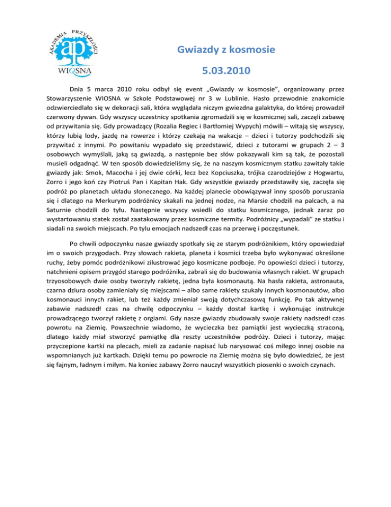 Gwiazdy z kosmosie 5.03.2010 Dnia 5 marca 2010 roku odbył się event „Gwiazdy w kosmosie”, organizowany przez Stowarzyszenie WIOSNA w Szkole Podstawowej nr 3 w Lublinie. Hasło przewodnie znakomicie odzwierciedlało się w dekoracji sali, która wyglądała niczym gwiezdna galaktyka, do której prowadził czerwony dywan. Gdy wszyscy uczestnicy spotkania zgromadzili się w kosmicznej sali, zaczęli zabawę od przywitania się. Gdy prowadzący (Rozalia Regiec i Bartłomiej Wypych) mówili – witają się wszyscy, którzy lubią lody, jazdę na rowerze i którzy czekają na wakacje – dzieci i tutorzy podchodzili się przywitać z innymi. Po powitaniu wypadało się przedstawić, dzieci z tutorami w grupach 2 – 3 osobowych wymyślali, jaką są gwiazdą, a następnie bez słów pokazywali kim są tak, że pozostali musieli odgadnąć. W ten sposób dowiedzieliśmy się, że na naszym kosmicznym statku zawitały takie gwiazdy jak: Smok, Macocha i jej dwie córki, lecz bez Kopciuszka, trójka czarodziejów z Hogwartu, Zorro i jego koń czy Piotruś Pan i Kapitan Hak. Gdy wszystkie gwiazdy przedstawiły się, zaczęła się podróż po planetach układu słonecznego. Na każdej planecie obowiązywał inny sposób poruszania się i dlatego na Merkurym podróżnicy skakali na jednej nodze, na Marsie chodzili na palcach, a na Saturnie chodzili do tyłu. Następnie wszyscy wsiedli do statku kosmicznego, jednak zaraz po wystartowaniu statek został zaatakowany przez kosmiczne termity. Podróżnicy „wypadali” ze statku i siadali na swoich miejscach. Po tylu emocjach nadszedł czas na przerwę i poczęstunek. Po chwili odpoczynku nasze gwiazdy spotkały się ze starym podróżnikiem, który opowiedział im o swoich przygodach. Przy słowach rakieta, planeta i kosmici trzeba było wykonywać określone ruchy, żeby pomóc podróżnikowi zilustrować jego kosmiczne podboje. Po opowieści dzieci i tutorzy, natchnieni opisem przygód starego podróżnika, zabrali się do budowania własnych rakiet. W grupach trzyosobowych dwie osoby tworzyły rakietę, jedna była kosmonautą. Na hasła rakieta, astronauta, czarna dziura osoby zamieniały się miejscami – albo same rakiety szukały innych kosmonautów, albo kosmonauci innych rakiet, lub też każdy zmieniał swoją dotychczasową funkcję. Po tak aktywnej zabawie nadszedł czas na chwilę odpoczynku – każdy dostał kartkę i wykonując instrukcje prowadzącego tworzył rakietę z orgiami. Gdy nasze gwiazdy zbudowały swoje rakiety nadszedł czas powrotu na Ziemię. Powszechnie wiadomo, że wycieczka bez pamiątki jest wycieczką straconą, dlatego każdy miał stworzyć pamiątkę dla reszty uczestników podróży. Dzieci i tutorzy, mając przyczepione kartki na plecach, mieli za zadanie napisać lub narysować coś miłego innej osobie na wspomnianych już kartkach. Dzięki temu po powrocie na Ziemię można się było dowiedzieć, że jest się fajnym, ładnym i miłym. Na koniec zabawy Zorro nauczył wszystkich piosenki o swoich czynach.