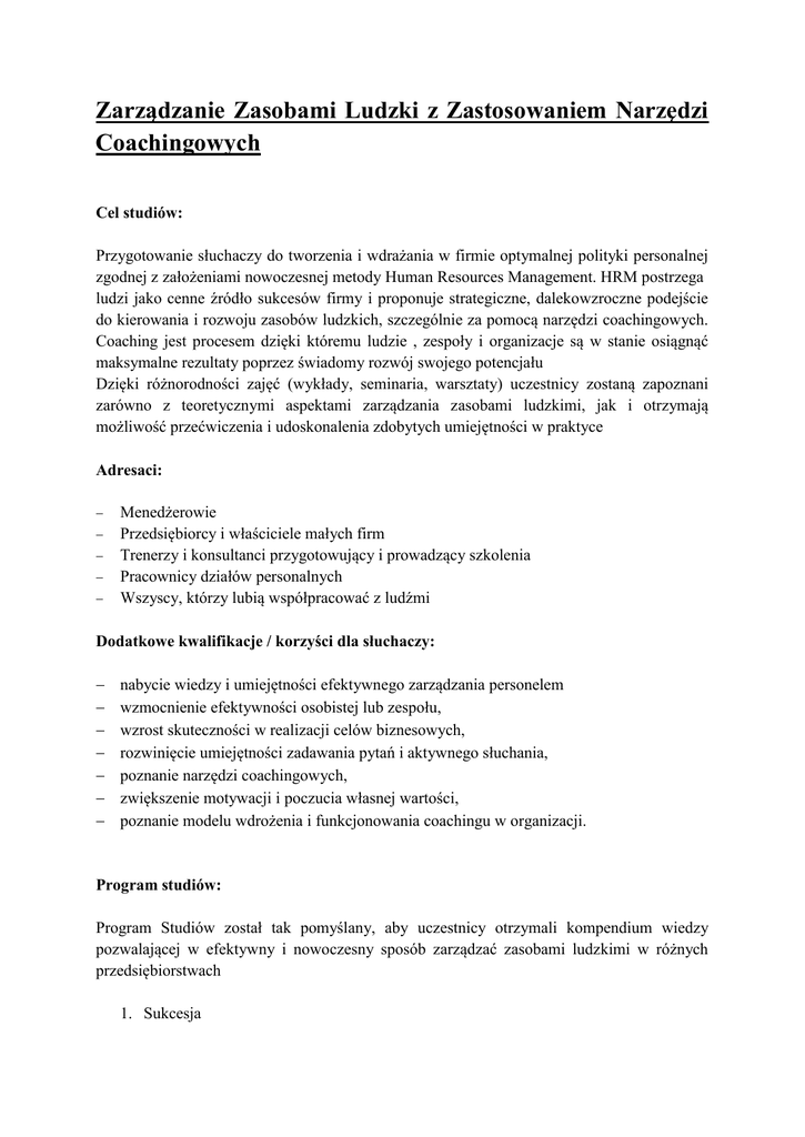 Zarządzanie Zasobami Ludzki z Zastosowaniem Narzędzi Coachingowych Cel studiów: Przygotowanie słuchaczy do tworzenia i wdrażania w firmie optymalnej polityki personalnej zgodnej z założeniami nowoczesnej metody Human Resources Management. HRM postrzega ludzi jako cenne źródło sukcesów firmy i proponuje strategiczne, dalekowzroczne podejście do kierowania i rozwoju zasobów ludzkich, szczególnie za pomocą narzędzi coachingowych. Coaching jest procesem dzięki któremu ludzie , zespoły i organizacje są w stanie osiągnąć maksymalne rezultaty poprzez świadomy rozwój swojego potencjału Dzięki różnorodności zajęć (wykłady, seminaria, warsztaty) uczestnicy zostaną zapoznani zarówno z teoretycznymi aspektami zarządzania zasobami ludzkimi, jak i otrzymają możliwość przećwiczenia i udoskonalenia zdobytych umiejętności w praktyce Adresaci: Menedżerowie Przedsiębiorcy i właściciele małych firm Trenerzy i konsultanci przygotowujący i prowadzący szkolenia Pracownicy działów personalnych Wszyscy, którzy lubią współpracować z ludźmi Dodatkowe kwalifikacje / korzyści dla słuchaczy: nabycie wiedzy i umiejętności efektywnego zarządzania personelem wzmocnienie efektywności osobistej lub zespołu, wzrost skuteczności w realizacji celów biznesowych, rozwinięcie umiejętności zadawania pytań i aktywnego słuchania, poznanie narzędzi coachingowych, zwiększenie motywacji i poczucia własnej wartości, poznanie modelu wdrożenia i funkcjonowania coachingu w organizacji. Program studiów: Program Studiów został tak pomyślany, aby uczestnicy otrzymali kompendium wiedzy pozwalającej w efektywny i nowoczesny sposób zarządzać zasobami ludzkimi w różnych przedsiębiorstwach 1. Sukcesja 2. Techniki wywierania wpływu- efektywna komunikacja 3. Proces rekrutacji i dobór pracowników 4. Modele kompetencyjne w zarządzaniu –kompetencje coacha 5. Zarządzania wiedzą 6. Narzędzia coachingowe 7. Wprowadzenie do coachingu 8. Zarządzanie talentami w organizacji 9. Etyka i społeczna odpowiedzialność biznesu 10. Rozwój zasobów ludzkich w organizacji – proces szkoleniowy 11. System oceny pracowników 12. Organizacja procesu coachingowego 13. Coachingowy model przywództwa 14. Analiza pracy i planowanie zatrudnienia 15. Seminarium dyplomowe Moduły dodatkowo płatne: Moduł I: rozwój osobisty: - trening asertywności - trening antystresowy - racjonalna terapia zachowań Moduł II: rozwój umiejętności liderskich - trening myślenia strategicznego - trening rozwiazywania sytuacji trudnych w organizacji - wykorzystanie coachingu jako narzędzia kierowania organizacją Moduł III: rozwój umiejętności trenerskich: - analiza potrzeb szkoleniowych - przygotowanie szkolenia i praca z grupą z wykorzystaniem coachingu Moduł IV: współpraca w grupie: - trening kreatywności - podnoszenie efektywności działania organizacji - budowanie pozytywnych relacji w grupie Forma zaliczenia: Czas trwania studiów: 2 semestry Liczba godzin: 200 Cena: Kierunek studiów podyplomowych Opłata jednorazowa Opłata semestralna Opłata miesięczna ( 1 rata ) ( 2 raty ) ( 10 rat ) 4 000 zł 2 100 zł 440 zł Zarządzanie Zasobami Ludzkimi z Zastosowaniem Narzędzi Coachingowych NOWOŚĆ !!! *20% zniżki dla studentów i absolwentów WSB i WSG