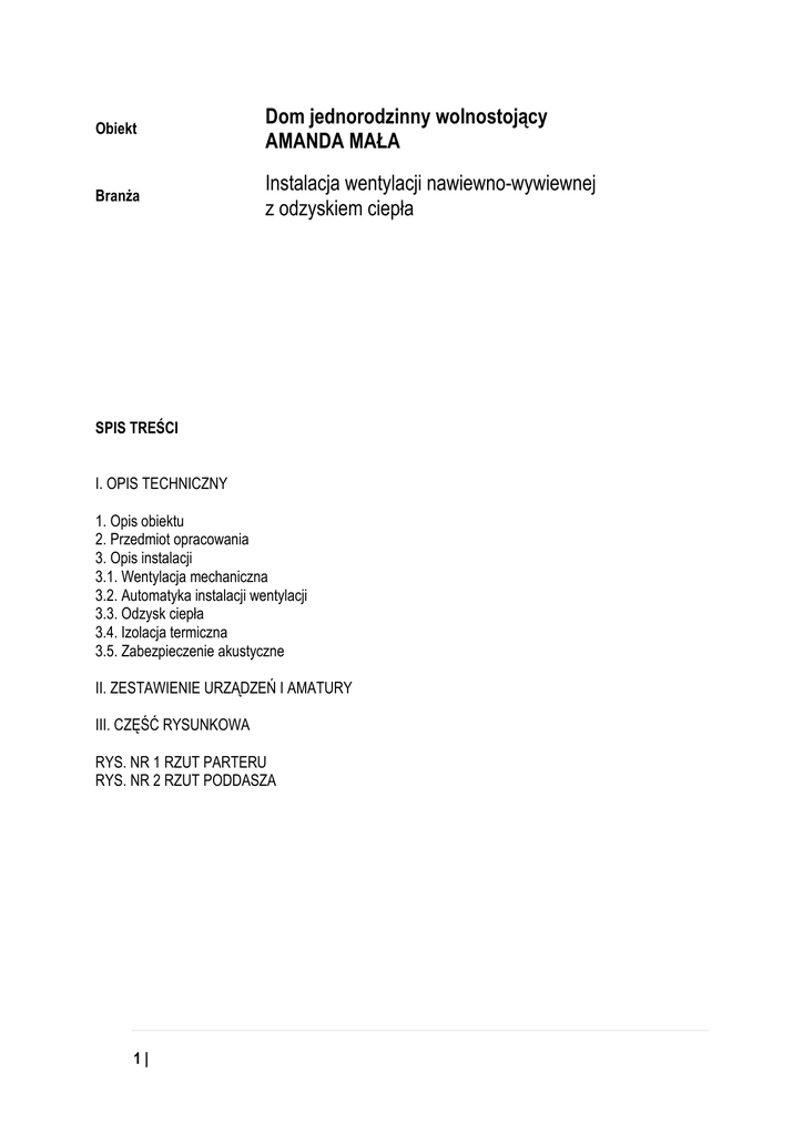 Obiekt Dom jednorodzinny wolnostojący AMANDA MAŁA Branża Instalacja wentylacji nawiewno-wywiewnej z odzyskiem ciepła SPIS TREŚCI I. OPIS TECHNICZNY 1. Opis obiektu 2. Przedmiot opracowania 3. Opis instalacji 3.1. Wentylacja mechaniczna 3.2. Automatyka instalacji wentylacji 3.3. Odzysk ciepła 3.4. Izolacja termiczna 3.5. Zabezpieczenie akustyczne II. ZESTAWIENIE URZĄDZEŃ I AMATURY III. CZĘŚĆ RYSUNKOWA RYS. NR 1 RZUT PARTERU RYS. NR 2 RZUT PODDASZA 1|Strona I. OPIS TECHNICZNY 1. OPIS OBIEKTU Obiekt, w którym projektuje się rekuperację stanowi budynek jednorodzinny. Budynek wykonany jest w technologii lekkiej ze szczelną stolarką okienną i drzwiową. 2. PRZEDMIOT OPRACOWANIA Przedmiotem niniejszego opracowania jest koncepcja wentylacji mechanicznej nawiewno – wywiewnej z odzyskiem ciepła (tzw. rekuperacją), pracującej na potrzeby funkcjonowania budynku jednorodzinnego oraz pomieszczeń sanitarnych. 3. OPIS INSTALACJI 3.1. Wentylacja mechaniczna Dla pomieszczeń domu jednorodzinnego zaprojektowano układ wentylacji mechanicznej nawiewno-wywiewnej. Wymiana powietrza będzie realizowana poprzez centralę nawiewno-wywiewną z odzyskiem ciepła, typu Komfovent Domekt REGO 450VE firmy Ventia Sp. z o.o., zlokalizowaną w garażu. Centrala wyposażona jest w filtry powietrza nawiewanego i wywiewanego klasy F7, energooszczędne wentylatory EC, obrotowy wymiennik zapewniający odzysk ciepła i wilgoci, wtórną nagrzewnicę powietrza zapewniającą komfortową temperaturę powietrza nawiewanego oraz automatykę z dotykowym sterownikiem C4PLUS. Urządzenie powinno pracować nieustannie. Dystrybucja powietrza nawiewnego, jak i wywiewnego będzie odbywać się za pomocą układu wentylacyjnego połączonego z centralą wentylacyjną. Dopływ powietrza wentylacyjnego do kuchni, łazienek, ustępów oraz pomocniczych pomieszczeń bezokiennych powinien być zapewniony przez otwory w dolnych częściach drzwi lub przez szczeliny pomiędzy dolną krawędzią drzwi a podłogą lub progiem. Przekrój netto otworów lub szczelin powinien wynosić 200 cm2. Swobodny przepływ powietrza z pokoi powinna zapewnić szczelina pomiędzy dolną krawędzią drzwi a podłogą o przekroju netto co najmniej 80 cm2. Czerpnię i wyrzutnię powietrza zaprojektowano w elewacji budynku. Czerpnia i wyrzutnia wyposażona jest w żaluzję zabezpieczającą przed wpływem warunków atmosferycznych i siatkę metalową zabezpieczającą przed przedostawaniem się do instalacji ptaków, liści itp. Przy adaptacji projektu dla potrzeb lokalnych i powstaniu właściwego planu zagospodarowania terenu, każdorazowo należy przeanalizować lokalizację czerpni i wyrzutni tak, aby ich usytuowanie spełniały wymagania przepisów oraz zapewniały pobór powietrza zewnętrznego na potrzeby wentylacji o najniekorzystniejszych parametrach, na przykład z elewacji północnej lub miejsc zacienionych. Kanał czerpni oraz kanał wyrzutni należy wykonać z przewodów stalowych ocynkowanych typu Spiro o odpowiedniej średnicy. Przewody Spiro należy zaizolować termicznie, aby uniknąć tworzenia się skroplin na powierzchni kanałów. Kanały należy mocować do ścian i stropu przy pomocy obejm z uszczelką gumową. Odcinek kanału czerpnia, wyrzutnia zaizolować wełna o min. gr.50mm. Kanały nawiewne i wywiewne min. gr. 20mm Na króćcach centrali wentylacyjnej od strony pomieszczeń (na przewodzie tłocznym i ssawnym) w celu zmniejszenia hałasu przenoszonego do instalacji zamontować należy tłumiki akustyczne. Z centrali powietrze będzie wyprowadzone kanałem głównym spiro typ RZS firmy Ventia następnie powietrze zostanie doprowadzone za pomocą trójnika do skrzynki rozdzielczo tłumiącej 4xDN90 2|Strona umieszczonej na piętrze budynku i do przestrzeni poddasza do skrzynki rozdzielacza tłumiącego 4xDN90 wyposażonego w płytę montażową 4-kanałową DN90. Z rozdzielacza powietrze rozprowadzone zostanie do poszczególnych pomieszczeń indywidualnie, za pomocą przewodów elastycznych np. typu ComfoTube90. Podłączenie przewodów do punktów nawiewnych będzie następowało w skrzynce rozprężnej okrągłej TVA 90 umieszczonej w stropie lub suficie podwieszonym. Skrzynki rozprężne zakończone zostaną anemostatami nawiewnymi typu REGA DVS-P-1-125 oraz anemostatami wywiewnymi REGA DVS-1-125 firmy Ventia. Instalacja wywiewna będzie rozprowadzona w sposób analogiczny jak powietrza nawiewanego z zachowaniem przeciwnego kierunku przepływu powietrza. 3.2. Automatyka instalacji wentylacji Centrala wentylacyjna sterowana jest za pomocą zintegrowanej zawansowanej automatyki typu Plug&Play ze sterownikiem C4PLUS wyposażonym w dotykowy ekran LCD. Podstawowe funkcje automatyki: • Tryby pracy ON/OFF/AUTO • Regulacja intensywność wentylacji (poziom 1, 2, 3, każdy poziom sterowany płynnie) • Programowanie harmonogramu tygodniowego pracy urządzenia • Regulacja temperatury nawiewu w zakresie 15-30°C • Tryby pracy LATO/ZIMA • Regulacja intensywność wentylacji, temperatury nawiewu, trybów pracy urządzenia, itp. ze ściennego sterownika C4PLUS z ekranem dotykowym LCD • Aktywacja nadrzędnej funkcji OVR - praca centrali poprzez sygnał zewnętrzny (praca okapu kuchennego, czujnik wilgotności, czujnik CO2, współpraca z kominkiem, włącznik ścienny itp.), Funkcja nadrzędna OVR może być wykorzystana do zbilansowania ilość powietrza przy współpracy z okapem kuchennym wyposażonym we własny wentylator wyciągowy. • Wybór języka na panelu sterowania. Komunikaty tekstowe w języku polskim • Informacja o błędach oraz konieczności serwisu urządzenia 3.3. Odzysk ciepła Urządzenie wyposażone jest wysoko sprawny obrotowy wymiennik ciepła. W trakcie pracy centrali wymiennik obrotowy nie zamarza w niskich temperaturach zewnętrznych (nie traci sprawności odzysku ciepła oraz nie potrzebuje dodatkowych systemów zabezpieczających przed zamarzaniem). Nawet przy skrajnie niskich temperat