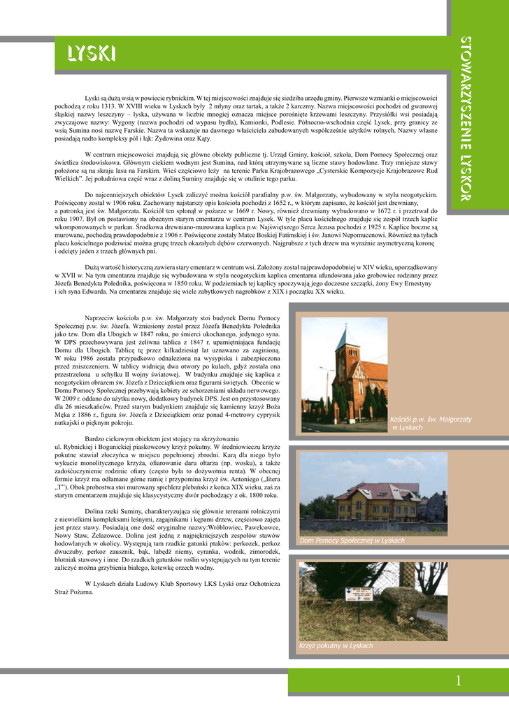 Lyski są dużą wsią w powiecie rybnickim. W tej miejscowości znajduje się siedziba urzędu gminy. Pierwsze wzmianki o miejscowości pochodzą z roku 1313. W XVIII wieku w Lyskach były 2 młyny oraz tartak, a także 2 karczmy. Nazwa miejscowości pochodzi od gwarowej śląskiej nazwy leszczyny – lyska, używana w liczbie mnogiej oznacza miejsce porośnięte krzewami leszczyny. Przysiółki wsi posiadają zwyczajowe nazwy: Wygony (nazwa pochodzi od wypasu bydła), Kamionki, Podlesie. Północno-wschodnia część Lysek, przy granicy ze wsią Sumina nosi nazwę Farskie. Nazwa ta wskazuje na dawnego właściciela zabudowanych współcześnie użytków rolnych. Nazwy własne posiadają nadto kompleksy pól i łąk: Żydowina oraz Kąty. W centrum miejscowości znajdują się główne obiekty publiczne tj. Urząd Gminy, kościół, szkoła, Dom Pomocy Społecznej oraz świetlica środowiskowa. Głównym ciekiem wodnym jest Sumina, nad którą utrzymywane są liczne stawy hodowlane. Trzy mniejsze stawy położone są na skraju lasu na Farskim. Wieś częściowo leży na terenie Parku Krajobrazowego „Cysterskie Kompozycje Krajobrazowe Rud Wielkich”. Jej południowa część wraz z doliną Suminy znajduje się w otulinie tego parku. Do najcenniejszych obiektów Lysek zaliczyć można kościół parafialny p.w. św. Małgorzaty, wybudowany w stylu neogotyckim. Poświęcony został w 1906 roku. Zachowany najstarszy opis kościoła pochodzi z 1652 r., w którym zapisano, że kościół jest drewniany, a patronką jest św. Małgorzata. Kościół ten spłonął w pożarze w 1669 r. Nowy, również drewniany wybudowano w 1672 r. i przetrwał do roku 1907. Był on postawiony na obecnym starym cmentarzu w centrum Lysek. W tyle placu kościelnego znajduje się zespół trzech kaplic wkomponowanych w parkan. Środkowa drewniano-murowana kaplica p.w. Najświętszego Serca Jezusa pochodzi z 1925 r. Kaplice boczne są murowane, pochodzą prawdopodobnie z 1906 r. Poświęcone zostały Matce Boskiej Fatimskiej i św. Janowi Nepomucenowi. Również na tyłach placu kościelnego podziwiać można grupę trzech okazałych dębów czerwonych. Najgrubsze z tych drzew ma wyraźnie asymetryczną koronę i odcięty jeden z trzech głównych pni. Dużą wartość historyczną zawiera stary cmentarz w centrum wsi. Założony został najprawdopodobniej w XIV wieku, uporządkowany w XVII w. Na tym cmentarzu znajduje się wybudowana w stylu neogotyckim kaplica cmentarna ufundowana jako grobowiec rodzinny przez Józefa Benedykta Połednika, poświęcona w 1850 roku. W podziemiach tej kaplicy spoczywają jego doczesne szczątki, żony Ewy Ernestyny i ich syna Edwarda. Na cmentarzu znajduje się wiele zabytkowych nagrobków z XIX i początku XX wieku. Naprzeciw kościoła p.w. św. Małgorzaty stoi budynek Domu Pomocy Społecznej p.w. św. Józefa. Wzniesiony został przez Józefa Benedykta Połednika jako tzw. Dom dla Ubogich w 1847 roku, po śmierci ukochanego, jedynego syna. W DPS przechowywana jest żeliwna tablica z 1847 r. upamiętniająca fundację Domu dla Ubogich. Tablicę tę przez kilkadziesiąt lat uznawano za zaginioną. W roku 1986 została przypadkowo odnaleziona na wysypisku i zabezpieczona przed zniszczeniem. W tablicy widnieją dwa otwory po kulach, gdyż została ona przestrzelona u schyłku II wojny światowej. W budynku znajduje się kaplica z neogotyckim obrazem św. Józefa z Dzieciątkiem oraz figurami świętych. Obecnie w Domu Pomocy Społecznej przebywają kobiety ze schorzeniami układu nerwowego. W 2009 r. oddano do użytku nowy, dodatkowy budynek DPS. Jest on przystosowany dla 26 mieszkańców. Przed starym budynkiem znajduje się kamienny krzyż Boża Męka z 1886 r., figura św. Józefa z Dzieciątkiem oraz ponad 4-metrowy cyprysik nutkajski o pięknym pokroju. Bardzo ciekawym obiektem jest stojący na skrzyżowaniu ul. Rybnickiej i Bogunickiej piaskowcowy krzyż pokutny. W średniowieczu krzyże pokutne stawiał złoczyńca w miejscu popełnionej zbrodni. Karą dla niego było wykucie monolitycznego krzyża, ofiarowanie daru ołtarza (np. wosku), a także zadośćuczynienie rodzinie ofiary (często była to dożywotnia renta). W obecnej formie krzyż ma odłamane górne ramię i przypomina krzyż św. Antoniego („litera „T”). Obok probostwa stoi murowany spichlerz plebański z końca XIX wieku, zaś za starym cmentarzem znajduje się klasycystyczny dwór pochodzący z ok. 1800 roku. Dolina rzeki Suminy, charakteryzująca się głównie terenami rolniczymi z niewielkimi kompleksami leśnymi, zagajnikami i kępami drzew, częściowo zajęta jest przez stawy. Posiadają one dość oryginalne nazwy:Wróblowiec, Pawelcowce, Nowy Staw, Żelazowce. Dolina jest jedną z najpiękniejszych zespołów stawów hodowlanych w okolicy. Występują tam rzadkie gatunki ptaków: perkozek, perkoz dwuczuby, perkoz zausznik, bąk, łabędź niemy, cyranka, wodnik, zimorodek, błotniak stawowy i inne. Do rzadkich gatunków roślin występujących na tym terenie zaliczyć można grzybienia białego, kotewkę orzech wodny. W Lyskach działa Ludowy Klub Sportowy LKS Lyski oraz Ochotnicza Straż Pożarna. stowarzyszenie lyskor LYSKI Kościół p.w. św. Małgorzaty w Lyskach Dom Pomocy Społecznej w Lyskach Krzyż pokutny w Lyskach 1 stowarzyszenie lyskor nowa wieś Nowa Wieś to sołectwo otoczone rozległymi polami. Nazwa jest pochodzenia kulturowego – najpewniej miejscowość ta powstała później niż okoliczne i nazwano ją Nową Wsią. Jednak istnieje też prawdopodobieństwo, iż istniała wcześniej, a mieszkańcy wskutek spalenia miejscowości, zatopienia, bądź innej klęski żywiołowej, przenieśli się na wyższy teren i tam założyli nowe osiedle. Założona w XV wieku jako wieś rycerska, o której pierwsza wzmianka pochodzi z roku 1458. Na terenie miejscowości znalezione zostały niegdyś szczątki naczyń ceramicznych i narzędzi z krzemienia z okresu neolitu. Z innych ciekawos