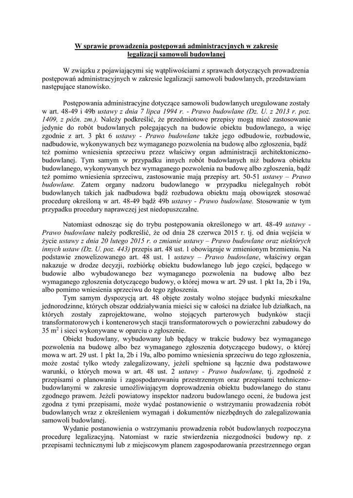 W sprawie prowadzenia postępowań administracyjnych w zakresie legalizacji samowoli budowlanej W związku z pojawiającymi się wątpliwościami z sprawach dotyczących prowadzenia postępowań administracyjnych w zakresie legalizacji samowoli budowlanych, przedstawiam następujące stanowisko. Postępowania administracyjne dotyczące samowoli budowlanych uregulowane zostały w art. 48-49 i 49b ustawy z dnia 7 lipca 1994 r. - Prawo budowlane (Dz. U. z 2013 r. poz. 1409, z późn. zm.). Należy podkreślić, że przedmiotowe przepisy mogą mieć zastosowanie jedynie do robót budowlanych polegających na budowie obiektu budowlanego, a więc zgodnie z art. 3 pkt 6 ustawy - Prawo budowlane także jego odbudowie, rozbudowie, nadbudowie, wykonywanych bez wymaganego pozwolenia na budowę albo zgłoszenia, bądź też pomimo wniesienia sprzeciwu przez właściwy organ administracji architektonicznobudowlanej. Tym samym w przypadku innych robót budowlanych niż budowa obiektu budowlanego, wykonywanych bez wymaganego pozwolenia na budowę albo zgłoszenia, bądź też pomimo wniesienia sprzeciwu, zastosowanie mają przepisy art. 50-51 ustawy – Prawo budowlane. Zatem organy nadzoru budowlanego w przypadku nielegalnych robót budowlanych takich jak nadbudowa bądź rozbudowa obiektu mają obowiązek stosować procedurę określoną w art. 48-49 bądź 49b ustawy - Prawo budowlane. Stosowanie w tym przypadku procedury naprawczej jest niedopuszczalne. Natomiast odnosząc się do trybu postępowania określonego w art. 48-49 ustawy Prawo budowlane należy podkreślić, że od dnia 28 czerwca 2015 r. tj. od dnia wejścia w życie ustawy z dnia 20 lutego 2015 r. o zmianie ustawy – Prawo budowlane oraz niektórych innych ustaw (Dz. U. poz. 443) przepis art. 48 ust. 1 obowiązuje w zmienionym brzmieniu. Na podstawie znowelizowanego art. 48 ust. 1 ustawy – Prawo budowlane, właściwy organ nakazuje w drodze decyzji, rozbiórkę obiektu budowlanego lub jego części, będącego w budowie albo wybudowanego bez wymaganego pozwolenia na budowę albo bez wymaganego zgłoszenia dotyczącego budowy, o której mowa w art. 29 ust. 1 pkt 1a, 2b i 19a, albo pomimo wniesienia sprzeciwu do tego zgłoszenia. Tym samym dyspozycją art. 48 objęte zostały wolno stojące budynki mieszkalne jednorodzinne, których obszar oddziaływania mieści się w całości na działce lub działkach, na których zostały zaprojektowane, wolno stojących parterowych budynków stacji transformatorowych i kontenerowych stacji transformatorowych o powierzchni zabudowy do 35 m2 i sieci wykonywane w oparciu o zgłoszenie. Obiekt budowlany, wybudowany lub będący w trakcie budowy bez wymaganego pozwolenia na budowę albo bez wymaganego zgłoszenia dotyczącego budowy, o której mowa w art. 29 ust. 1 pkt 1a, 2b i 19a, albo pomimo wniesienia sprzeciwu do tego zgłoszenia, może zostać tylko wtedy zalegalizowany, jeżeli spełnione są łącznie dwa podstawowe warunki, o których mowa w art. 48 ust. 2 ustawy - Prawo budowlane, tj. zgodność z przepisami o planowaniu i zagospodarowaniu przestrzennym oraz przepisami technicznobudowlanymi w zakresie umożliwiającym doprowadzenia obiektu budowlanego do stanu zgodnego prawem. Jeżeli powiatowy inspektor nadzoru budowlanego oceni, że budowa jest zgodna z tymi przepisami, może wydać postanowienie o wstrzymaniu prowadzenia robót budowlanych wraz z określeniem wymagań i dokumentów niezbędnych do zalegalizowania samowoli budowlanej. Wydanie postanowienia o wstrzymaniu prowadzenia robót budowlanych rozpoczyna procedurę legalizacyjną. Natomiast w razie stwierdzenia niezgodności budowy np. z przepisami technicznymi lub z miejscowym planem zagospodarowania przestrzennego organ nadzoru budowlanego nie może wszcząć postępowania legalizacyjnego (wydając postanowienie wstrzymujące budowę) lecz jest zobowiązany nakazać rozbiórkę samowoli budowlanej. Nie jest zatem dopuszczalne uruchamianie procedury legalizacyjnej, jeśli budowa nie spełnia łączenie ww. warunków. Ponadto inwestor zamierzający zalegalizować obiekt będzie zobowiązany dostarczyć organowi nadzoru budowlanego prowadzącemu postępowanie, dokumenty, o których mowa w art. 48 ust. 3 ustawy - Prawo budowlane tj. m. in. zaświadczenie wójta, burmistrza albo prezydenta miasta o zgodności budowy z ustaleniami obowiązującego miejscowego planu zagospodarowania przestrzennego albo decyzję o warunkach zabudowy i zagospodarowania terenu, w przypadku braku obowiązującego planu zagospodarowania przestrzennego, 4 egzemplarze projektu budowlanego wraz z opiniami, uzgodnieniami, pozwoleniami i innymi dokumentami wymaganymi przepisami szczególnymi oraz zaświadczeniem, o którym mowa w art. 12 ust. 7, aktualnym na dzień opracowania projektu, oświadczenie o posiadanym prawie do dysponowania nieruchomością na cele budowlane. Podkreślić należy, że wymaganą dokumentacje inwestor ma obowiązek dostarczyć w terminie określonym przez organ w postanowieniu. Przedłożenie w wyznaczonym terminie wymaganych dokumentów traktuje się jak wniosek o zatwierdzenie projektu budowlanego i pozwolenie na wznowienie robót budowlanych, jeżeli budowa nie została zakończona (art. 48 ust. 5 ustawy - Prawo budowlane). Należy przy tym podkreślić, że przedłożenie omawianej dokumentacji po terminie nie wywołuje skutków, o których mowa w ww. przepisie. Niedotrzymanie terminu oznacza niespełnienie nałożonych na inwestora obowiązków i również wiąże się z koniecznością wydania nakazu rozbiórki samowoli (zob. art. 48 ust. 4 ustawy - Prawo budowlane). Organ nie może w takim przypadku uchylać się od wydania takiego nakazu. Zauważyć również należy, że wydawane w tym postępowaniu na podstawie art. 48 ust. 2 ustawy - Prawo budowlane, postanowienie wstrzymujące prowadzenie robót budowlanych oznacza kategoryczny zakaz prowadzenia budowy. Powiatowi inspektorzy nadzoru budowlanego zobowiązani są kontrolować