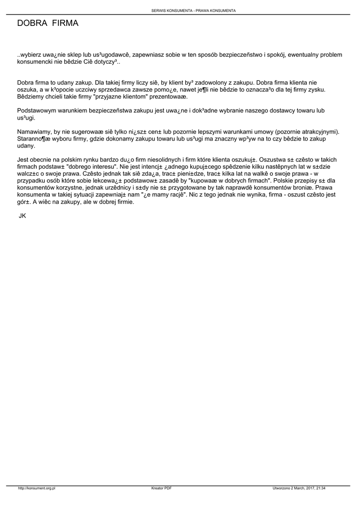 SERWIS KONSUMENTA - PRAWA KONSUMENTA DOBRA FIRMA ..wybierz uwa¿nie sklep lub us³ugodawcê, zapewniasz sobie w ten sposób bezpieczeñstwo i spokój, ewentualny problem konsumencki nie bêdzie Ciê dotyczy³.. Dobra firma to udany zakup. Dla takiej firmy liczy siê, by klient by³ zadowolony z zakupu. Dobra firma klienta nie oszuka, a w k³opocie uczciwy sprzedawca zawsze pomo¿e, nawet je¶li nie bêdzie to oznacza³o dla tej firmy zysku. Bêdziemy chcieli takie firmy "przyjazne klientom" prezentowaæ. Podstawowym warunkiem bezpieczeñstwa zakupu jest uwa¿ne i dok³adne wybranie naszego dostawcy towaru lub us³ugi. Namawiamy, by nie sugerowaæ siê tylko ni¿sz± cen± lub pozornie lepszymi warunkami umowy (pozornie atrakcyjnymi). Staranno¶æ wyboru firmy, gdzie dokonamy zakupu towaru lub us³ugi ma znaczny wp³yw na to czy bêdzie to zakup udany. Jest obecnie na polskim rynku bardzo du¿o firm niesolidnych i firm które klienta oszukuj±. Oszustwa s± czêsto w takich firmach podstaw± "dobrego interesu". Nie jest intencj± ¿adnego kupuj±cego spêdzenie kilku nastêpnych lat w s±dzie walcz±c o swoje prawa. Czêsto jednak tak siê zda¿a, trac± pieni±dze, trac± kilka lat na walkê o swoje prawa - w przypadku osób które sobie lekcewa¿± podstawow± zasadê by "kupowaæ w dobrych firmach". Polskie przepisy s± dla konsumentów korzystne, jednak urzêdnicy i s±dy nie s± przygotowane by tak naprawdê konsumentów broniæ. Prawa konsumenta w takiej sytuacji zapewniaj± nam "¿e mamy racjê". Nic z tego jednak nie wynika, firma - oszust czêsto jest gór±. A wiêc na zakupy, ale w dobrej firmie. JK http://konsument.org.pl Kreator PDF Utworzono 2 March, 2017, 21:34