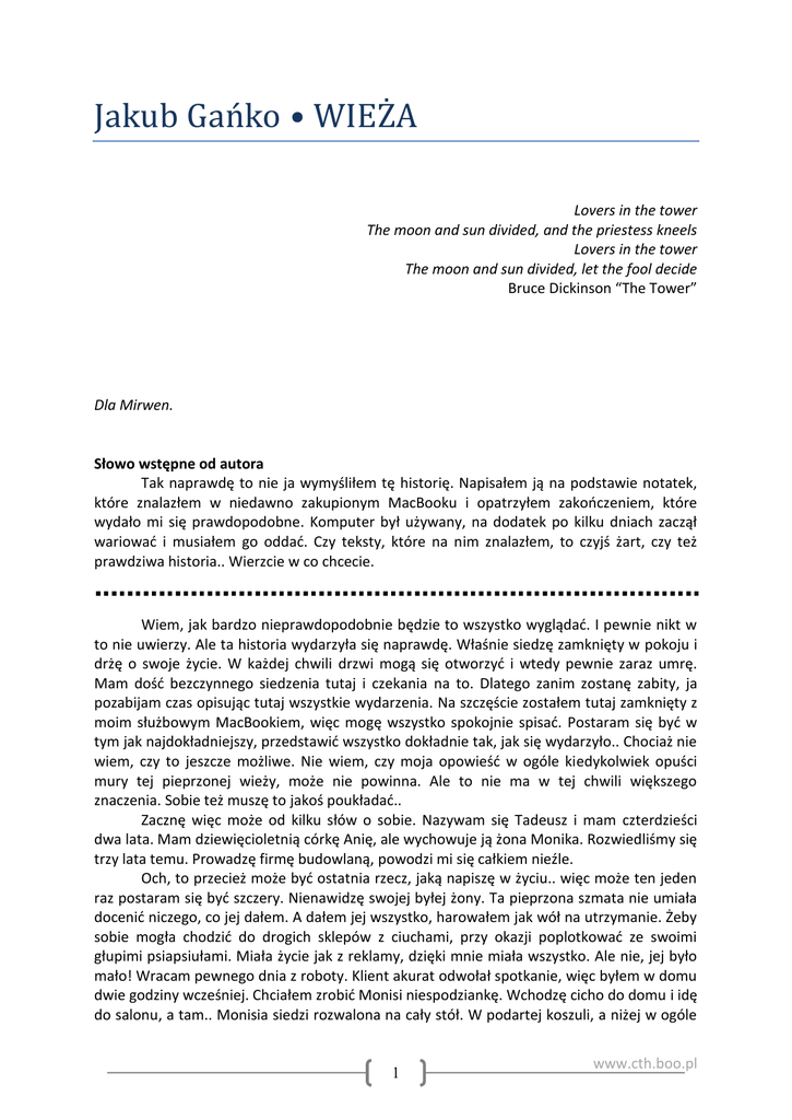 Jakub Gańko • WIEŻA Lovers in the tower The moon and sun divided, and the priestess kneels Lovers in the tower The moon and sun divided, let the fool decide Bruce Dickinson “The Tower” Dla Mirwen. Słowo wstępne od autora Tak naprawdę to nie ja wymyśliłem tę historię. Napisałem ją na podstawie notatek, które znalazłem w niedawno zakupionym MacBooku i opatrzyłem zakooczeniem, które wydało mi się prawdopodobne. Komputer był używany, na dodatek po kilku dniach zaczął wariowad i musiałem go oddad. Czy teksty, które na nim znalazłem, to czyjś żart, czy też prawdziwa historia.. Wierzcie w co chcecie. Wiem, jak bardzo nieprawdopodobnie będzie to wszystko wyglądad. I pewnie nikt w to nie uwierzy. Ale ta historia wydarzyła się naprawdę. Właśnie siedzę zamknięty w pokoju i drżę o swoje życie. W każdej chwili drzwi mogą się otworzyd i wtedy pewnie zaraz umrę. Mam dośd bezczynnego siedzenia tutaj i czekania na to. Dlatego zanim zostanę zabity, ja pozabijam czas opisując tutaj wszystkie wydarzenia. Na szczęście zostałem tutaj zamknięty z moim służbowym MacBookiem, więc mogę wszystko spokojnie spisad. Postaram się byd w tym jak najdokładniejszy, przedstawid wszystko dokładnie tak, jak się wydarzyło.. Chociaż nie wiem, czy to jeszcze możliwe. Nie wiem, czy moja opowieśd w ogóle kiedykolwiek opuści mury tej pieprzonej wieży, może nie powinna. Ale to nie ma w tej chwili większego znaczenia. Sobie też muszę to jakoś poukładad.. Zacznę więc może od kilku słów o sobie. Nazywam się Tadeusz i mam czterdzieści dwa lata. Mam dziewięcioletnią córkę Anię, ale wychowuje ją żona Monika. Rozwiedliśmy się trzy lata temu. Prowadzę firmę budowlaną, powodzi mi się całkiem nieźle. Och, to przecież może byd ostatnia rzecz, jaką napiszę w życiu.. więc może ten jeden raz postaram się byd szczery. Nienawidzę swojej byłej żony. Ta pieprzona szmata nie umiała docenid niczego, co jej dałem. A dałem jej wszystko, harowałem jak wół na utrzymanie. Żeby sobie mogła chodzid do drogich sklepów z ciuchami, przy okazji poplotkowad ze swoimi głupimi psiapsiułami. Miała życie jak z reklamy, dzięki mnie miała wszystko. Ale nie, jej było mało! Wracam pewnego dnia z roboty. Klient akurat odwołał spotkanie, więc byłem w domu dwie godziny wcześniej. Chciałem zrobid Monisi niespodziankę. Wchodzę cicho do domu i idę do salonu, a tam.. Monisia siedzi rozwalona na cały stół. W podartej koszuli, a niżej w ogóle 1 www.cth.boo.pl bez niczego. Posuwał ją jakiś młody kutafon, który miał założyd w domu nowy Internet – zupełnie jak w tandetnym pornolcu. Szybkie łącze z niemieckiej firmy. Pewnie dlatego krzyczała mu „szpric mir!” czy coś takiego. Paskudny język, nie wiem jak można na co dzieo tak mówid, a co dopiero kochając się z kobietą. W czym był problem? No na pewno nie po mojej stronie. Potrafiłem w pełni zaspokoid jej potrzeby, to ją bolała głowa. Może chciała zobaczyd, jak to jest z młodszym. Może chciała poczud się jak kurwa. Nie wiem. Kwestie zawodowe.. Wcale mi się nie powodzi. Moja firma jest na skraju bankructwa. Ostatnie zlecenie, przez które właśnie jestem tu, gdzie teraz jestem, miało postawid ją na nogi. Pewnego dnia zadzwonił do mnie klient. Niemiecka firma komputerowa, co za ironia losu. Ale uznaję zasadę, że w interesach nie ma sentymentów. Niemcy wydymali mi żonę, teraz ja się wydymam ich grubą kasą. Tak przynajmniej wtedy myślałem.. Klient umówił się ze mną na jakimś zadupiu pod Warszawą, gdzie miał działkę pod swoją inwestycję. Nawet nie pamiętam dokładnie nazwy, zresztą pewnie wam by też nic nie powiedziała. Autobusy tam już nie dojeżdżają, bo nawet jezdni nie ma. Tylko jakieś wiejskie drogi. I taką drogą właśnie jechałem tamtego dnia. Wokół była potworna mgła, jechało się jak z podziurawionym prześcieradłem na przedniej szybie. Może ze trzy metry było widad przed sobą. Żywej duszy wokół, wciąż tylko pola jakieś. Na takim polu właśnie nawalił mi samochód. Wysiadłem, kombinowałem.. nic nie dało. Zadzwoniłem do Józka, mojego wspólnika. Nagrałem mu wiadomośd na pocztę głosową, ale nie jestem nawet pewien, czy do niego doszło. W takiej dziurze równie dobrze może nie byd zasięgu. Więcej prób kontaktu nie wykonałem, bo komórka mi siadła. Jak mi się znudziło stanie przy samochodzie i wymyślanie coraz gorszych wiązanek z krzaczastych, wziąłem torbę z MacBookiem i postanowiłem przejśd się po tych zawszonych polach. Też, cholera, nie miałem co robid, naprawdę.. Mgła nie opadała, można było jej wręcz dotknąd. Strasznie mi ograniczała pole widzenia i pewnie dlatego nie zauważyłem od razu budowli. Jedynej chyba w promilu 10 kilometrów. To była taka wieża, chyba strasznie wysoka – we mgle nie można było dojrzed jej szczytu. Obszedłem ją dookoła, znajdując w koocu duże, drewniane drzwi. Zamontowano na nich jakąś paskudną, mosiężną mordę z metalowym kółkiem w gębie. Jej widok mnie zaniepokoił, no ale nie miałem specjalnie nic innego do roboty, to zastukałem tym kółkiem. Pamiętam, że głuchy odgłos, jaki przy tym wydałem, zaniepokoił mnie jeszcze bardziej. Ale potem było ciekawiej. Drzwi otworzyły się dośd szybko. Stanęła w nich.. Och, to dopiero była kobieta. Drzwi otworzyła mi wysoka blondynka w ubiorze pokojówki. Wiecie, co mam na myśli – taki staromodny czarny ubiór z białymi elementami, koronkami i tak dalej. Zawsze mnie pociągały takie wdzianka. Ta czarna sukienka pod spodem doskonale układała się na piersiach blondynki, chod niestety dekolt przysłaniały te koronki. Skórę miała mlecznobladą, nieskazitelnie gładką. Wąski nos, lekko zadarty do góry, co tylko dodawało jej uroku. Chociaż najwięcej uroku miały jej oczy. W jej spojrzeniu widziałem zarówno ciekawośd, jak i jakiś lęk, coś.. Dopiero p