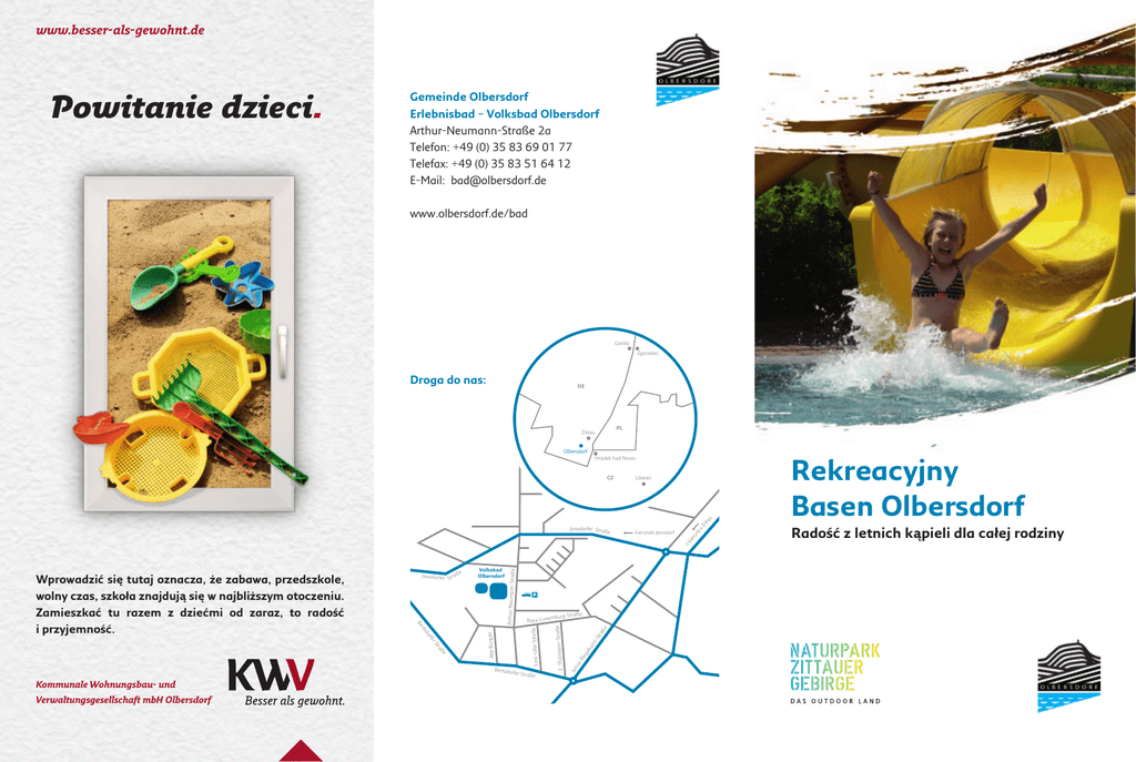 www.besser-als-gewohnt.de Powitanie dzieci. www.olbersdorf.de/volksbad Gemeinde Olbersdorf Erlebnisbad – Volksbad Olbersdorf Arthur-Neumann-Straße 2a Telefon: +49 (0) 35 83 69 01 77 Telefax: +49 (0) 35 83 51 64 12 E-Mail: [email protected] www.olbersdorf.de/bad Görlitz Zgorzelec Droga do nas: DE PL Zittau Olbersdorf Hrádek had Nisou Liberec e eh ah nS tra ße raße us -R ing E.-Thälmann-St ße ra Verwaltungsgesellschaft mbH Olbersdorf rfer Straß Ju li St Bertsdo Kommunale Wohnungsbau- und traße emburg-S Rosa-Lux e Emil-Ufer-Straß Arthur-Neumann-S Volksbad Olbersdorf Alte Burgstr. e Jonsdorfer Straß r rfe do rts Be Wprowadzić się tutaj oznacza, że zabawa, przedszkole, wolny czas, szkoła znajdują się w najbliższym otoczeniu. Zamieszkać tu razem z dziećmi od zaraz, to radość i przyjemność. traße ku kierunek Jonsdorf zk ier un Jonsdorfer Straß e Zi tta u CZ Rekreacyjny Basen Olbersdorf Radość z letnich kąpieli dla całej rodziny Nurkujcie Państwo w naszej przeźroczystej, podgrzewanej górskiej wodzie lub rozluźnieni relaksujcie na naszych łąkach. Odkryjcie Państwo różnorodność możliwości przebywania w wodzie albo poza basenem i pozostawcie codzienne troski poza sobą. Czas otwarcia, ceny i parking Czas otwarcia: Maj – Wrzesień, codziennie 9°° – 19°° godz. 9°° – 20°° godz. Czerwiec – Sierpień Parking przy basenie rekreacyjnym. Nasz rekreacyjny basen pozwoli Państwu na miłe kąpiele, rozluźnienie się, jak również odpoczynek dla całej rodziny. Taryfy dzienne Dorośli Jedna osoba Karta 10-razowa u nas przeżyć: ~podgrzewany otwarty basen o temp. wody od 22° do 26° ~ czysta górska woda ~ 25m basen sportowy do pływania ~ 800m² basen dla niepływających ~ osobny basen dla dzieci ze zjeżdżalnią ~ 72m zjeżdżalnia ~ kanał do pływania/ chodzenia pod prąd wodny Dzieci 3,00 € 2,50 € 1,50 € 25,00 € 20,00 € 12,00 € Karta rodzinna 1 To możecie Państwo Ulgowe 5,00 € (1 dorosły + 2 dzieci) ~masaże wodno powietrzne n.p.: grzyb wodny lub leżak nad dyszą wodno-powietrzną i wiele innych form d ~ uże łąki do przebywania na słońcu lub w cieniu ~boisko do siatkòwki, tennisa stołowego, dwa place zabaw dla dzieci, trampolina 10x15m ~restauracja i kawiarnia ~ Bez przeszkód wejście do wody ~ Bez przeszkód wejście do przebieralni, natrysków, toalet ~ Bez przeszkód wejście do kawiarni i restauracji Karta rodzinna 2 6,00 € (2 dorosłe + 1 dziecko) Karta rodzinna 3 7,50 € (2 dorosłe + minimum 2 dzieci) Cennik dla grupy (z 1 opiekunem + minimum 8 dzieci) Opiekun 2,00 € grupa od osoby 1,00 € Taryfy wieczorne od 17.00 godz Jedna osoba Karta 10-razowa Dorośli Ulgowe Dzieci 2,00 € 1,50 € 1,00 € 16,00 € 12,00 € 8,00 €