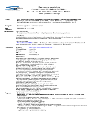 Zapraszamy na szkolenia Centrum Promocji i Szkolenia SYSTEM s.c. tel. 12 4138182, kom. 660 433566, fax 12 4136197 www.systemszkolenia.pl Temat: >>> Rozliczenia zakładu pracy z ZUS i Urzędem Skarbowym. - podatek dochodowy od osób fizycznych, rozliczenie za 2008, zmiany 2009 - zasiłki chorobowe po wyroku Trybunału Konstytucyjnego - emerytury, najnowsze zmiany - rozliczanie składek ZUS [nr 1119] Kategoria: Szkolenia wyjazdowe z zakwaterowaniem Data szkolenia: 08-12-2008 do 10-12-2008 Wykładowcy: Krystyna KrystynaTymorek Tymorek - -Radca Radcaprawny prawnywwMinisterstwie MinisterstwiePracy Pracyi iPolityki PolitykiSpołecznej. Społecznej.Doświadczony Doświadczonywykładowca. wykładowca. Anna AnnaRajwa Rajwa doradca doradcapodatkowy, podatkowy,trener treneri iwykładowca wykładowcazzzakresu zakresupodatków podatkówdochodowych, dochodowych,wykładowca wykładowcana naszkoleniach szkoleniach współfinansowanych współfinansowanychzzUnii UniiEuropejskiej, Europejskiej,właściciel właścicielKancelarii Kancelariipodatkowej. podatkowej. Andrzej AndrzejRadzisław Radzisław - -Pracownik Pracownikcentrali centraliZUS ZUSod od1998 1998r., r.,autor autorlicznych licznychpublikacji publikacjizzzakresu zakresuubezpieczeń ubezpieczeńspołecznych społecznychi izdrowotnych zdrowotnych oraz orazrozliczania rozliczaniaskładek, składek,uznany uznanywykładowca, wykładowca,prowadzący prowadzącywiele wieleszkoleń szkoleńwwtym tymzakresie. zakresie. Lokalizacja: Miejsce: Grand Hotel Stamary Wellness && SPA **** Miejsce: Grand Hotel Stamary Wellness SPA **** Województwo: małopolskie Województwo: małopolskie Miasto: Zakopane Miasto: Zakopane Ulica: Ulica: Strona www: Strona www: Kościuszki 1919 Kościuszki www.stamary.pl www.stamary.pl Opis miejsca: Opis miejsca: Hotel mieści sięsię ww pochodzącym z 1905 roku budynku, wzniesionym Hotel mieści pochodzącym z 1905 roku budynku, wzniesionym według projektu Eugeniusza Wesołowskiego, przy głównej ulicy według projektu Eugeniusza Wesołowskiego, przy głównej ulicy Zakopanego, wiodącej dodo centrum miasta. Zakopanego, wiodącej centrum miasta. Stamary - to pseudonim popularnej wówczas artystki estradowej Stamary - to pseudonim popularnej wówczas artystki estradowej Marii Budziszewskiej, pierwszej właścicielki, której nakładem Marii Budziszewskiej, pierwszej właścicielki, której nakładem środków hotel został wzniesiony. środków hotel został wzniesiony. Obecnie, wizerunek Grand Hotelu Stamary toto połączenie pięknej Obecnie, wizerunek Grand Hotelu Stamary połączenie pięknej formy architektonicznej, stylowych wnętrz oraz nowoczesnych formy architektonicznej, stylowych wnętrz oraz nowoczesnych rozwiązań zapewniających komfort i bezpieczeństwo Gości. rozwiązań zapewniających komfort i bezpieczeństwo Gości. WW nowoczesnym Centrum Wellness && SPA szczególne wrażenie robi nowoczesnym Centrum Wellness SPA szczególne wrażenie robi okazała pływalnia z systemem hydroterapii ww formie gejzerów, okazała pływalnia z systemem hydroterapii formie gejzerów, wodospadów, kaskad i masaży podwodnych oraz duże, funkcjonalne wodospadów, kaskad i masaży podwodnych oraz duże, funkcjonalne jacuzzi. Nie zapomniano o najmłodszych, wyznaczając imim jacuzzi. Nie zapomniano o najmłodszych, wyznaczając bezpieczne miejsce dodo wodnych zabaw ww formie mini-basenu. Przed bezpieczne miejsce wodnych zabaw formie mini-basenu. Przed wejściem nana pływalnię można skorzystać z dużej atrakcji, jaką jest wejściem pływalnię można skorzystać z dużej atrakcji, jaką jest „prysznic wrażeń”, zaskakujący ilością programów oddziałujących „prysznic wrażeń”, zaskakujący ilością programów oddziałujących nana zmysły poprzez koloroterapię, z możliwością regulacji zmysły poprzez koloroterapię, z możliwością regulacji intensywności i kierunków wody. intensywności i kierunków wody. Integralną częścią SPA jest zespół saun, ww tym sauna fińska i i Integralną częścią SPA jest zespół saun, tym sauna fińska turecka oraz kabina nana podczerwień, połączone z pokojem relaxu, turecka oraz kabina podczerwień, połączone z pokojem relaxu, który wprowadza Gości ww nastrój wyciszenia. który wprowadza Gości nastrój wyciszenia. Oprócz zespołu basenów i SPA ww GRAND hotelu STAMARY niedaleko Oprócz zespołu basenów i SPA GRAND hotelu STAMARY niedaleko hotelu otwarto Termalny AGUAPARK - ZAKOPANE; szczegóły nana hotelu otwarto Termalny AGUAPARK - ZAKOPANE; szczegóły stronie: WWW.AQUAPARK.ZAKOPANE.PL stronie: WWW.AQUAPARK.ZAKOPANE.PL Program: 8.12.2008r. Prowadzi : Anna Rajwa OBOWIĄZKI PŁATNIKA PODATKU DOCHODOWEGO OD OSÓB FIZYCZNYCH, ROZLICZENIE ZA 2008, ZMIANY 2009 1. Obliczanie podatku od dochodów pracowników – pojęcie przychodu ze stosunku pracy bez względu na rodzaj świadczenia: (wypłaty pieniężne, świadczenia w naturze i inne nieodpłatne świadczenia) – określenie momentu powstania przychodu, – koszty uzyskania przychodów w 2008 roku – ogólne i szczególne zasady poboru zaliczek od dochodu pracowników – obliczanie należnego podatku dochodowego za 2008 r. z uwzględnieniem składek na ubezpieczenie zdrowotne podlegających odliczaniu od podatku . 2. Świadczenia na rzecz pracowników: – wydatki pracodawcy na działalność socjalną, – świadczenia urlopowe, świadczenia związane z ochroną zdrowia, – świadczenia okolicznościowe sfinansowane ze środków ZFŚS, – spotkania integracyjne, – korzystanie przez pracowników z samochodów i telefonów służbowych, – świadczenia na rzecz osób nie będących pracownikami podatnika. 3. Zwolnienia przedmiotowe, w tym: – podstawowe grupy zwolnień przedmiotowych: (odszkodowania, podróże służbowe pracowników i pozostałych osób, używanie samochodów prywatnych do celów służbowych, stypendia, szkolenia, studia), 4. Opodatkowanie przychodów (dochodów) z: – umów zle