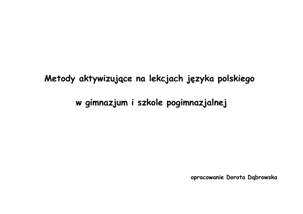 Metody aktywizujące na lekcjach języka polskiego w gimnazjum i szkole pogimnazjalnej opracowanie Dorota Dąbrowska DEFINIOWANIE, PREZENTOWANIE WŁASNEGO STANOWISKA, WIEDZY Z DANEJ DZIEDZINY NAZWA METODY/ TECHNIKI JEJ ISTOTA • Mapa definiowania pojęć- graficzne zobrazowanie pojęcia według schematu określającego kategorię pojęcia, jego właściwości i przykłady( zał. 1. ). • Do pojęcia ( model Frayera )- definiowanie pojęcia według określonego schematu określającego: cechy istotne, cechy nieistotne, wzory- przykłady, antywzoryantyprzykłady ( zał. 2. ). • Burza mózgów- swobodna, wstępna prezentacja hipotez, skojarzeń, niepoddanych jeszcze weryfikacji. W wersji rozwiniętej może przebiegać w następujący sposób: 1. Wybór słowa kluczowego. 2. Prezentacja skojarzeń ( każdy uczeń jedno skojarzenie ). 3. Rozwinięcie skojarzeń przez uczniów. 4. Zadawania pytań na temat zapisanych skojarzeń ( uczniowie zadają sobie pytania ) . 5. Wybór przez nauczyciela niektórych odpowiedzi uczniowskich, prośba o wyjaśnienie : np. Co skłoniło Cię do myślenia o tym ....? 6. Zanotowanie definicji pojęcia. • Tablica pytań- uczeń lub uczniowie w grupach odpowiadają na pytania, które wcześniej sformułowali ( mogą być utworzone w drodze burzy mózgów, a potem poddane selekcji ) lub które przygotował nauczyciel, konfrontują swoją wiedzę na dany temat z różnymi źródłami. Może być wykorzystywana na jednej lekcji lub wyznaczyć kierunek pracy samodzielnej uczniów podczas cyklu lekcji ( zał. nr 3. ). PRZYKŁADY KONKRETNEGO WYKORZYSTANIA NA LEKCJACH JĘZYKA POLSKIEGO -definiowanie pojęć historycznoliterackich ( renesans, barok ), teoretycznoliterackich ( groteska, powieść historyczna, realistyczna ), kulturowych ( dekadentyzm ) -definiowanie pojęć historycznoliterackich, teoretycznoliterackich, kulturowych -analiza słów kluczy, pojęć, metafor w tekstach literackich, tematach wypracowań -wstępne przygotowanie do lektury tekstu- definiowanie pojęć istotnych dla zrozumienia tekstu -ustalenie symbolicznej treści znaczeń - formułowanie hipotez interpretacyjnych - wzbogacanie słownictwa, np. poszukiwanie synonimów do określonego pojęcia -przygotowanie do egzaminu ustnego - jako jeden z etapów realizacji projektu na określony temat -diagnozowanie i poszerzanie wiedzy związanej z różnorodnymi zagadnieniami literackimi, historycznoliterackimi, teoretycznoliterackimi, kulturowymi, np. wiedza o epoce, pisarzu, problemie - wprowadzenie biografii autora • Dywanik pomysłów, ustaleń- każdy uczeń otrzymuje dwie, trzy kartki, na których zwięźle zapisuje swoje pomysły, ustalenia ( 1 kartka- 1 pomysł, 1 ustalenie ) i uprzednio odczytawszy, zawiesza je na dużym plakacie, na którym zapisany jest rozważany problem bądź zagadnienie. Następnie dochodzi do eliminacji propozycji powtarzających się, błędnych oraz ewentualnego porządkowania pomysłów, ustaleń w kręgi tematyczne. • Graffiti- pozwala na dzielenie się z innymi wiedzą i refleksjami. Nauczyciel wywiesza kilka plakatów z rozpoczętymi zdaniami i prosi o dopisanie indywidualnych zakończeń. • Bliźniaki- zasada analogii- szukanie podobieństw i różnic między nowym pojęciem a pojęciem, zagadnieniem, rzeczywistością dobrze znaną ( zał.4 ). -ustalenie np. cech bohaterów (np. humanista, Sarmata, bohater romantyczny ), zjawisk kulturowych (np. postmodernizm), prądów artystycznych (np. ekspresjonizm, symbolizm ) -ustalenie możliwych motywacji działań bohaterów ( np. Raskolnikowa, Judyma, Pana Cogito ) - formułowanie hipotez interpretacyjnych -wstęp do omawiania lektury lub podsumowanie zagadnień z nią związanych ( przykładowe zapisy: W utworze podobało mi się…, Lekturę tekstu utrudniało… Chciałbym przedyskutować…W utworze najbardziej zaintrygowało mnie..., lub bardziej konkretne: Forma według Gombrowicza to....) -synteza, ocena epoki, zjawiska, postawy ( można sprawdzać umiejętność formułowania argumentów i charakteryzowania zjawisk -Oświecenie to epoka rozumu ponieważ…, Filozofię tej epoki charakteryzuje…) - samoocena wiedzy i umiejętności ucznia -porównywanie różnych rzeczywistości ( np. społeczeństwo polskie w Lalce- chory organizm, Soplicowo- Nawłoć, gatunków literackich ( dramat antyczny- dramat szekspirowski ) - diagram można wykorzystać do analizy porównawczej tekstów literackich - ocena bohatera, jego wyborów ( Judym, Ziembiewicz, Cezary Baryka ) - dyskusja nad wartością zjawiska np. Znaczenie mitów narodowych w życiu zbiorowości - przygotowanie do pisania tekstu argumentacyjnego • Dyskusja punktowana: 1. Określenie tematu dyskusji. 2. Podział klasy na grupy ( za i przeciw ). 3. Wyznaczenie obserwatorów grup. 4. Dyskusja i monitoring pracy grup przez obserwatorów. 5.Przydzielenie punktów za udział w dyskusji według kryteriów wyznaczonych w tabeli. 5. Przedstawienie przez obserwatorów wniosków z dyskusji. Specyfika tematów, problemów poddanych dyskusji może wpłynąć na rozszerzenie tabeli o nowe, związane z konkretnym tematem kryteria ( zał. 5. ). • Debata: 1. Określenie tematu debaty. 2. Zajęcie przez uczniów dwóch przeciwnych jak wyżej stanowisk: za i przeciw. 3. Przygotowanie argumentów. 4. Wymiana poglądów w formie wystąpień uczniowskich. Zapisywanie wyników na tablicy. 5. Podsumowanie debaty przez nauczyciela. HIERARCHIZOWANIE NAZWA METODY/ TECHNIKI JEJ ISTOTA PRZYKŁADY KONKRETNEGO WYKORZYSTANIA NA LEKCJACH JĘZYKA POLSKIEGO • Piramida priorytetów i diamentowy ranking- hierarchizacja elementów np. według -hierarchizacja cech bohaterów -prezentacja hierarchii wartości bohatera kryterium ważności, preferencji, kolejności ( zał. 6., 7. ). -hierarchizacja motywów działania bohatera -przedstawienie hierarchii ważności, społecznej np. Pan Tadeusz, Dziady -ustalenie hierarchii czynników kształtujących jakieś zjawisko, np. najistotnie