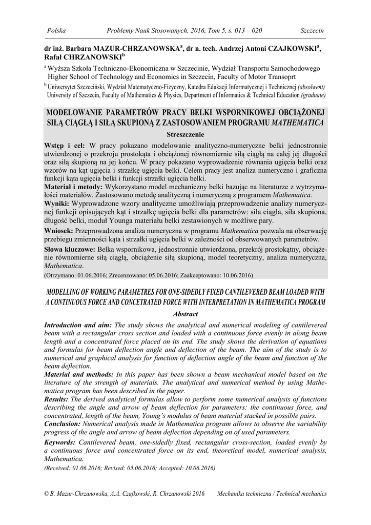 MODELOWANIE PARAMETRÓW PRACY BELKI WSPORNIKOWEJ OBCIĄŻONEJ