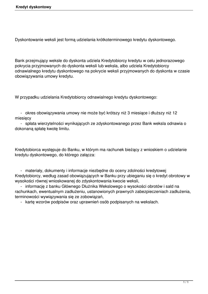 Kredyt dyskontowy Dyskontowanie weksli jest formą udzielania krótkoterminowego kredytu dyskontowego. Bank przejmujący weksle do dyskonta udziela Kredytobiorcy kredytu w celu jednorazowego pokrycia przyjmowanych do dyskonta weksli lub weksla, albo udziela Kredytobiorcy odnawialnego kredytu dyskontowego na pokrycie weksli przyjmowanych do dyskonta w czasie obowiązywania umowy kredytu. W przypadku udzielania Kredytobiorcy odnawialnego kredytu dyskontowego: - okres obowiązywania umowy nie może być krótszy niż 3 miesiące i dłuższy niż 12 miesięcy - spłata wierzytelności wynikających ze zdyskontowanego przez Bank weksla odnawia o dokonaną spłatę kwotę limitu. Kredytobiorca występuje do Banku, w którym ma rachunek bieżący z wnioskiem o udzielanie kredytu dyskontowego, do którego załącza: - materiały, dokumenty i informacje niezbędne do oceny zdolności kredytowej Kredytobiorcy, według zasad obowiązujących w Banku przy ubieganiu się o kredyt obrotowy w wysokości równej wnioskowanej do zdyskontowania kwocie weksli, - informację z banku Głównego Dłużnika Wekslowego o wysokości obrotów i sald na rachunkach, ewentualnym zadłużeniu, ustanowionych prawnych zabezpieczeniach zadłużenia, terminowości wywiązywania się ze zobowiązań, - kartę wzorów podpisów oraz uprawnień osób podpisanych na wekslach. 1/1