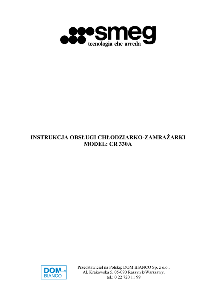 INSTRUKCJA OBSŁUGI CHŁODZIARKO-ZAMRAśARKI MODEL: CR 330A Przedstawiciel na Polskę: DOM BIANCO Sp. z o.o., Al. Krakowska 5, 05-090 Raszyn k/Warszawy, tel.: 0 22 720 11 99 Spis treści: 1. 2. 3. 4. 5. 6. Przed uruchomieniem urządzenia. Umieszczenie i podłączenie urządzenia Opis urządzenia Ustawianie działania urządzenia UŜytkowanie urządzenia Czyszczenie i obsługa techniczna 3 3 4 5 5-6 6-8 2 1. Przed uruchomieniem urządzenia naleŜy: • przed podłączeniem urządzenia do źródła prądu, pozostawić urządzenie w pomieszczeniu docelowym około 2 godzin. Zapobiegnie to moŜliwości uszkodzenia systemu chłodzenia. • wyczyścić urządzenie wewnątrz (patrz: punkt „Czyszczenie i obsługa techniczna”). • sprawdzić, czy elementy wnętrza urządzenia są umieszczone prawidłowo (patrz: punkt „Opis urządzenia”). a. Aby zaoszczędzić pobór energii: • naleŜy starać się nie otwierać drzwi urządzenia zbyt często, szczególnie kiedy pogoda na zewnątrz jest wilgotna i ciepła. • naleŜy sprawdzać, czy urządzenie jest dobrze wentylowane (cyrkulacja powietrza z tyłu urządzenia). • ustawiać termostat na niŜsze ustawienia tak często jak to moŜliwe. • pokrywa z lodu i szronu zwiększa pobór energii, więc naleŜy czyścić urządzenie, kiedy pojawi się pokrywa ok. 3-5 mm grubości. • Pojemnik na skraplającą się wodę, umieszczony na tylnej ścianie urządzenia, powinien być czyszczony regularnie. UWAGA: WSZELKIE NAPRAWY URZĄDZENIA POWINNY BYĆ WYKONYWANE PRZEZ WYKWALIFIKOWANY SERWIS. 2. Umieszczenie i podłączenia urządzenia. a. wybór odpowiedniego miejsca: Urządzenie naleŜy umieścić w suchym i regularnie wentylowanym miejscu. KLASA URZĄDZENIA SN – SUB-NORMAL N - NORMAL ST – SUB-TROPICAL T-TROPICAL TEMPERATURA OTOCZENIA OD +10°C DO + 32° C OD + 16° C DO + 32° C OD +18° C DO + 38° C OD +18° C DO + 43° C Nigdy nie naleŜy umieszczać urządzenia w pobliŜu urządzeń emitujących ciepło (np. piekarnik, kuchenka itp.) oraz bezpośrednio w słońcu. Urządzenie powinno być umieszczone najmniej 3 cm od elektrycznej bądź gazowej kuchenki oraz najmniej 30 cm od olejowej bądź węglowej kuchenki. JeŜeli jest to niemoŜliwe, naleŜy uŜyć innej izolacji. Za urządzeniem powinna być wolna przestrzeń najmniej 200 cm², a nad urządzeniem najmniej 5 cm w celu zapewnienia odpowiedniej wentylacji. b. podłączenie do źródła prądu NaleŜy podłączyć urządzenie do głównego źródła prądu (gniazdka) za pomocą kabla z wtyczką. Urządzenie MUSI być uziemione. Wymagane wartości podane są na tabliczce znamionowej. 3 3. Opis urządzenia. A. B. C. D. Ruchome półki w drzwiach z pokrywkami Ruchome półki z regulowanymi osłonami Półka na drzwiach System odpływu wody po rozmroŜeniu z komory chłodziarki E. Pojemnik do przechowywania zamroŜonej Ŝywności F. Pojemnik do zamraŜania świeŜej Ŝywności i przechowywania zamroŜonej G. Pokrętło regulacji temperatury (pokrętło to jest uŜywane do regulowania temperatury w obu komorach w następujący sposób: 4 0 1 H. I. J. K. lodówka jest wyłączona – 5 ustawienia poziomu chłodzenia Szuflady na owoce i warzywa. Pojemnik na mięso/ser Ruchome półki Oświetlenie wnętrza lodówki. 4. Ustawianie działania urządzenia. Urządzenie jest kontrolowane poprzez pokrętło termostatu, umieszczone w środkowej części chłodziarki. NaleŜy przekręcać pokrętło od pozycji 1 do pozycji 5 . Termostat umoŜliwia ustawianie temperatury zarówno w chłodziarce, jak i w zamraŜarce. Ustawianie temperatury. • • WyŜsze wartości na pokrętle (do 5) oznaczają niŜsze temperatury (chłodniej) we wszystkich częściach urządzenia. Przy wyŜszych ustawieniach temperatura wewnątrz urządzenia moŜe nawet osiągnąć wartości poniŜej 0° C. Kiedy temperatura na zewnątrz jest normalna, radzimy ustawienia średnich wartości. Zmiany temperatury na zewnątrz wpływa na temperaturę wewnątrz urządzenia. NaleŜy wybierać zawsze odpowiednie ustawienia na termostacie. Średnie rekomendowane ustawienie termostatu to wartość: 3. 5. UŜytkowanie urządzenia. Właściwe uŜytkowanie urządzenia, to: • Odpowiednie pakowanie Ŝywności • Ustawianie właściwej temperatury • Przestrzeganie zasad higieny CHŁODZIARKA – przechowywanie Ŝywności: • śywność nie powinna dotykać tylnej ścianki urządzenia. • Nie naleŜy przechowywać w lodówce substancji łatwopalnych. • Delikatne i szybko psujące się produkty powinny być przechowywane w najzimniejszych częściach urządzenia. • Staraj się nie otwierać drzwi lodówki zbyt często. 5 ZAMRAśARKA – przechowywanie świeŜej Ŝywności: • NaleŜy uŜywać odpowiednich opakowań do przechowywania Ŝywności: folia powinna dokładnie przylegać do produktu. • Zaleca się zamraŜanie małymi porcjami, wcześniej schładzając produkt w chłodziarce. • JeŜeli twoje urządzenie jest wyposaŜone w 1 kompresor, naleŜy: ustawić pokrętło termostatu na pozycję 2 –3. JeŜeli urządzenie jest wyposaŜone w przycisk zamraŜania, naleŜy go nacisnąć (zapali się Ŝółta lampka). W modelach z panelem sterowania moŜe się równieŜ włączyć czerwona lampka. Czerwona lampka wyłączy się, kiedy temperatura w zamraŜalniku osiągnie optymalną wartość. • JeŜeli twoje urządzenie jest wyposaŜone w 2 kompresory, naleŜy: uaktywnić funkcję szybkiego zamraŜania na 6h przed włoŜeniem świeŜej Ŝywności. NaleŜy ją umieszczać w wyŜszych koszach zamraŜalnika. W ciągu 24 h Ŝywność będzie całkowicie zamroŜona. Wówczas naleŜy wyłączyć funkcję szybkiego zamraŜania (Ŝółta lampka wyłączy się). Przechowywanie zamroŜonej wcześniej Ŝywności: ZamroŜone paczki Ŝywności przechowywane są w szufladach zamraŜalnika. Czas przechowywania oraz wymagana temperatura są podane na opakowaniach Ŝywności. 6. Czyszczenie i obsługa techniczna. i. automatyczne rozmraŜanie chłodziarki