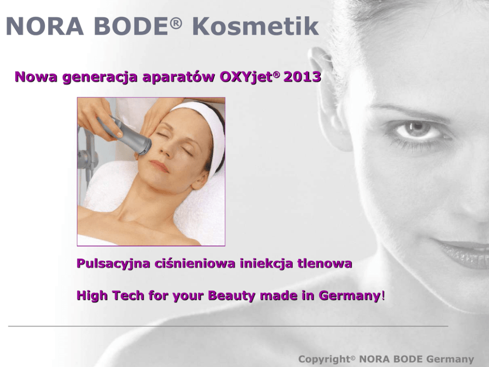 NORA BODE® Kosmetik Nowa generacja aparatów OXYjet® 2013 Pulsacyjna ciśnieniowa iniekcja tlenowa High Tech for your Beauty made in Germany! Copyright© NORA BODE Germany NORA BODE® Kosmetik Iniekcje igłowe i ciśnieniowe w medycznym zastosowaniu iniekcja insuliny Ciśnieniowa iniekcja insuliny Przy użyciu ciśnienia 20 barów Metoda stosowana od ponad 30 lat także przy szczepieniach Copyright© NORA BODE Germany NORA BODE® Kosmetik Igłowa i ciśnieniowa iniekcja w zastosowaniu kosmetycznym Model iniekcji kwasu hialuronowego Ciśnieniowa iniekcja tlenem niskocząsteczkowego kwasu hialuronowego przy użyciu pulsacyjnego cisnienia o wartości 2 barów. Technika znana od 15 lat, stosowana również do iniekcji innych składników kosmetycznych i medycznych. Copyright© NORA BODE Germany NORA BODE® Kosmetik Unikalny BODE OXYjet: Udowodniona skuteczność Fraunfhofer Institute for Biomedical Technology”, ośrodek o międzynarodowym uznaniu, potwierdza, iż przyspieszone stosowaniem aparatu OXYjet gromadzenie depozytów składników przeciwzmarszczkowych w skórze przebiega 60 razy szybciej. • Pulsacyjne ciśnienie tlenu : wartość ciśnienia tlenu stosowana w terapii została ustalona na podstwie badań naukowych przeprowadzonych przez niemiecki ośrodek o międzynarodowej sławie “Fraunhofer Institute for Biomedical Technology”. • Uznany w dermatologii: OXYjet jest wykorzystywany w terapii raka skóry. Kornwalijski Instytut Badań Dermatologicznych, Peninsula Medical School, Truro potwierdza w badaniach klinicznych doskonałe rezultaty iniekcji składników aktywnych pulsacyjnym ciśnieniem tlenu. • Opatentowana technologia: wynalazcą aparatu OXYjet jest Lothar Bode, president of NORA BODE, Germany, ktory uzyskał patent w 1997 Copyright© NORA BODE Germany NORA BODE® Kosmetik Udowodniona skuteczność: Badania naukowe Przygotowane i przeprowadzone przez niemiecki instytut Fraunhofer Institute for Biomedical Technology“ Copyright© NORA BODE Germany NORA BODE® Kosmetik Udowodniona skuteczność Gamma-L-Serum auf Haut 110, T=32°C Silizium Punktursystem Intensität 2.5mm, 2.5bar 2.0mm, 2.5bar 2.0mm, 2.0bar 1.0mm, 2.0bar ohne Permeationshilfe 0 5 10 15 20 25 30 35 40 45 50 55 60 Test PermaSkin: przeprowadzony na ludzkiej skórze wskazujący czas penetracji kosmetyków Zeit (min) Wynik: W zależności od ciśnienia tlenu aplikowane specjalnie opracowane produkty NORA BODY wnikają w naskórek już po kilku minutach. Depozyty składników aktywnych formują się w głębokich warstwach naskórka i skóry właściwej. Copyright© NORA BODE Germany NORA BODE® Kosmetik Udowodniona skuteczność Składnik aktywne preparatów NORA BODE są “wstrzeliwane” w skórę przez naturalne szczeliny pomiędzy komórkami skóry Delikatny, skuteczny i bezpieczny! Copyright© NORA BODE Germany NORA BODE® Kosmetik Wynalazca technologii Niemiecki patetnt przyznany Lothar Bode w 1998 Copyright© NORA BODE Germany NORA BODE® Kosmetik Orginalny BODE OXYjet: Po 10 zabiegach / 4 tygodnie Doskonałe rezultaty bez uzycia igieł Łagodny, efektywny I bezpieczny zabieg Po 3 zabiegach / 2 tygodnie Po 5 tzabiegach / 4 tygodnie Po 5 zabiegach/ 4 tygodnie Copyright© NORA BODE Germany NORA BODE® Kosmetik Dlaczego tlen ? O2 Tlen – eliksir życia Bez tlenu nie jest możliwa produkcja ATP, będącego magazynem energii – • Jest odpowiedzialny za regenerację komórek • Jest odpowiedzialny za zdrowy wygląd skóry Mikrokapilary w starzejącej się skórze są zdegenerowane więc odżywianie naskórka jest gorsze • Wpływa na rozjaśnienie skóry poprzez utlenianie melaniny do bezbarwnej postaci • Ma właściwości dezynfekujące pomagające walczyc z zanieczyszczeniami • Stymuluje system immunologiczny Copyright© NORA BODE Germany NORA BODE® Kosmetik The original BODE OXYjet: Non stop oxygen technology: • 98% skoncentrowany tlen • Wydajność 6 litrów na minutę • Solidny I cichy Check valve Nozzle 0,1 mm Flowreservoir O2Reservoir Flowvalve check valve check valve Purging valve 2x PressureSensors Mainboard Emission of nitrogen check valve Nozzle 0,9 mm O2-sensor A1 A2 E1 LED Board Molecularsieve B Molecularsieve A Bacterial filter E2 towards user Radiat or Compr essor Coarse/dust filter Fine filter/Intake filter Entry of air Copyright© NORA BODE Germany NORA BODE® Kosmetik The new OXYjet models Multifunctional Beauty Tools for your success! OXYjet LEO de luxe OXYjet LEO cool OXYjet LEO Copyright© NORA BODE Germany NORA BODE® Kosmetik The new OXYjet LEO de luxe krok po kroku do doskonałej skóry ! Funkcje aparatu: • OXYclear • OXYdiamond • OXYjet • OXYtone • OXYcool • OXYspray • OXYaroma Copyright© NORA BODE Germany NORA BODE® Kosmetik Speciana formuła kosmetyków do zabiegów OXYjet Produkty firmy NORA BODE spełniaja.... Wymagane do dobrych wyników • Mały rozmiar molekuł • Wysokie powinowactwo skóry -podobieństwo skóry substancji własnych • Składniki aktywne o udowodnionej skuteczności Dostępne producty do zabiegów przeciwstarzeniowych, dla skóry z przebarwieniam, zabiegi oczyszczające, na cellulit i ujędrniajace na ciało! Copyright© NORA BODE Germany NORA BODE® Kosmetik The new powerful OXYjet LEO de luxe treatment: Krok 1: OXYclear Głeboko tlenowe oczyszczające złuszczanie OXYclear: - Na skórę oddziałuje stężony tlen, wywołujący efekt witalizujący i stanowiący, dzięki swoim właściwościom dezynfekcyjnym, skuteczny środek zwalczający podrażnienia i zanieczyszczenia skóry. Dzięki łącznemu oddziaływaniu ze środkiem OXYclear, pory skóry są głęboko oczyszczane. - Niebieskie światło Bio Blue Light 460nm wygładza zanieczyszczoną i podrażnioną skórę, czerwone światło Bio Red Light stymuluje skórę dojrzałą, atroficzną Copyright© NORA BODE Germany NORA BODE® Kosmetik The new powerful OXYjet LEO de luxe treatment: Krok 2: OXYdiamond Tlenowy peeling diamentowy - Stężony tlen i diamentowe głow
