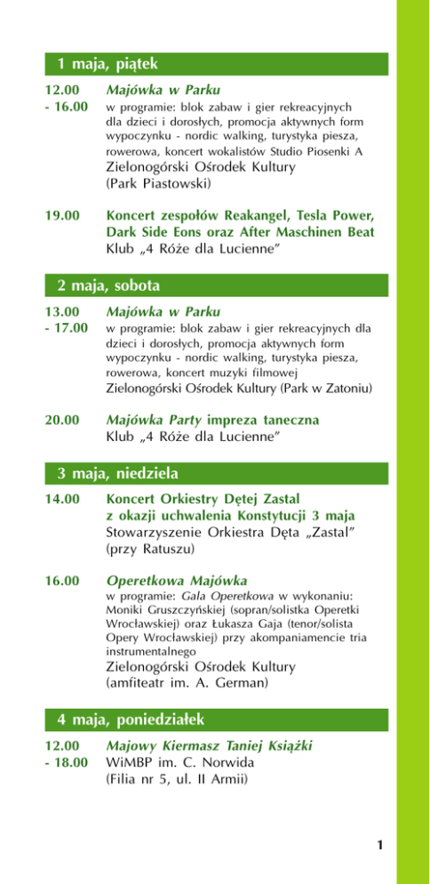 1 maja, pi¹tek 12.00 - 16.00 Majówka w Parku w programie: blok zabaw i gier rekreacyjnych dla dzieci i doros³ych, promocja aktywnych form wypoczynku - nordic walking, turystyka piesza, rowerowa, koncert wokalistów Studio Piosenki A Zielonogórski Oœrodek Kultury (Park Piastowski) 19.00 Koncert zespo³ów Reakangel, Tesla Power, Dark Side Eons oraz After Maschinen Beat Klub „4 Ró¿e dla Lucienne” 2 maja, sobota 13.00 - 17.00 Majówka w Parku w programie: blok zabaw i gier rekreacyjnych dla dzieci i doros³ych, promocja aktywnych form wypoczynku - nordic walking, turystyka piesza, rowerowa, koncert muzyki filmowej Zielonogórski Oœrodek Kultury (Park w Zatoniu) 20.00 Majówka Party impreza taneczna Klub „4 Ró¿e dla Lucienne” 3 maja, niedziela 14.00 16.00 Koncert Orkiestry Dêtej Zastal z okazji uchwalenia Konstytucji 3 maja Stowarzyszenie Orkiestra Dêta „Zastal” (przy Ratuszu) Operetkowa Majówka w programie: Gala Operetkowa w wykonaniu: Moniki Gruszczyñskiej (sopran/solistka Operetki Wroc³awskiej) oraz £ukasza Gaja (tenor/solista Opery Wroc³awskiej) przy akompaniamencie tria instrumentalnego Zielonogórski Oœrodek Kultury (amfiteatr im. A. German) 4 maja, poniedzia³ek 12.00 - 18.00 Majowy Kiermasz Taniej Ksi¹¿ki WiMBP im. C. Norwida (Filia nr 5, ul. II Armii) 1 20.00 Miêdzynarodowy Festiwal Rock Noc¹ eliminacje Klub „4 Ró¿e dla Lucienne” 5 maja, wtorek 9.00 XXII Przegl¹d Dzieciêcej Twórczoœci Teatralnej O Z³ote Pióro Kosza³ka Opa³ka Zielonogórski Oœrodek Kultury (Hydro(za)gadka) 12.00 - 18.00 Majowy Kiermasz Taniej Ksi¹¿ki WiMBP im. C. Norwida (Filia nr 5, ul. II Armii) 6 maja, œroda 9.00 XXII Przegl¹d Dzieciêcej Twórczoœci Teatralnej O Z³ote Pióro Kosza³ka Opa³ka Zielonogórski Oœrodek Kultury (Hydro(za)gadka) 10.00 - 16.00 Majowy Kiermasz Taniej Ksi¹¿ki WiMBP im. C. Norwida (Filia nr 5, ul. II Armii) 16.00 Spotkanie autorskie z Eugeniuszem Kurzaw¹ poet¹, redaktorem ksi¹¿ek i wydawnictw, Prezesem oddzia³u zielonogórskiego Zwi¹zku Literatów Polskich WiMBP im. C. Norwida (Filia nr 1, ul. Ptasia) 20.00 Sztuka Kultury Klub „4 Ró¿e dla Lucienne” 7 maja, czwartek 11.00 Wojewódzki Dzieñ Bibliotekarza i Bibliotek uroczystoœæ po³¹czona z nadaniem sali wyk³adowej WiMBP imienia dr. Grzegorza Chmielewskiego, zmar³ego w 2014 r., wieloletniego dyrektora Biblioteki Norwida WiMBP im. C. Norwida (Sala Dêbowa) 12.00 - 18.00 2 Majowy Kiermasz Taniej Ksi¹¿ki WiMBP im. C. Norwida (Filia nr 5, ul. II Armii) 18.00 Pastelowa Toscania wystawa fotograficzna El¿biety Z³akowskiej - wernisa¿ WiMBP im. C. Norwida (hol) 20.00 Czwartkowe Wieczory z muzyk¹ na ¿ywo wykonanie: Kasia Pusowska (œpiew), Albert Bezdziczek (pianino) Kawiarnia Miêdzywojenka - Lata Dwudzieste Lata Trzydzieste 20.00 Czwartkowa Prywatka u Micha³a impreza taneczna Klub „4 Ró¿e dla Lucienne” 21.00 Czwartkowe spotkania muzyczne Koncert zespo³u Piotr Budniak Essential Group Kajetan Borowski (fortepian), Piotr Budniak (perkusja), Wojciech Lichtañski (saksofon altowy), Szymon Mika (gitara), Pawe³ Po³udniak (tr¹bka), Alan Wykpisz (kontrabas) JazzKino 8 maja, pi¹tek 8.00 - 19.00 Kiermasz Ksi¹¿ka za z³otówkê Pedagogiczna Biblioteka Wojewódzka im. Marii Grzegorzewskiej (Wypo¿yczalnia PBW) 12.00 - 18.00 Majowy Kiermasz Taniej Ksi¹¿ki WiMBP im. C. Norwida (Filia nr 5, ul. II Armii) oraz Filia nr 2, oœ. Pomorskie) 14.00 Wybieram literaturê happening przy regale bookcrossingowym w programie: g³oœne czytanie, animacje dla dzieci, kolorowe bañki, malowanie kred¹, podczas akcji przyjmowane bêd¹ ksi¹¿ki do wymiany WiMBP im. C. Norwida (deptak) 18.30 Kreatywna Mozaika Œwiata z Fundacj¹ Lyada w programie: Skandynawia, kraina fiordów, dni i nocy polarnych rodzinne warsztaty krajoznawcze, prowadzenie Dagmara Janiak WiMBP im. C. Norwida (Mediateka Szklana Pu³apka) 3 20.00 Bluesowy Jam Session Klub „4 Ró¿e dla Lucienne” 21.00 IV Zielonogórska Wiosna Jazzowo-Bluesowa Koncert zespo³u Yes4jazz goœcinnie Jaques Kuba Seguin Robert Chy³a (tenor sax), Jakub Olejnik (kontrabas), Jakub Osypiñski (tr¹bka), Wojciech Pruszyñski (piano), Arek Skolik (perkusja) Klub Piekarnia Cichej Kobiety 21.30 - 22.30 Szukamy nowych obiektów astronomicznych wieczorna obserwacja nieba realizowana wspólnie z Polskim Towarzystwem Mi³oœników Astronomii, Oddzia³ w Zielonej Górze WiMBP im. C. Norwida (przed gmachem) 9 maja, sobota 8.00 - 15.00 10.00 - 16.00 Kiermasz Ksi¹¿ka za z³otówkê Pedagogiczna Biblioteka Wojewódzka im. Marii Grzegorzewskiej (Wypo¿yczalnia PBW) Majowy Kiermasz Taniej Ksi¹¿ki WiMBP im. C. Norwida (Filia nr 5, ul. II Armii oraz Filia nr 2, oœ. Pomorskie) 11.00 Magiczne czytanie na drugie œniadanie WiMBP im. C. Norwida (Oddzia³ dla Dzieci) 15.00 VI Bibliotekarski Festiwal Kulinarny Wybieram kuchniê polsk¹ Pedagogiczna Biblioteka Wojewódzka im. Marii Grzegorzewskiej (sala konferencyjna) 18.00 - 22.30 IX Europejska Noc Muzeów w programie m.in.: otwarcie nowych wystaw czasowych, pokazy walk i obyczajów rycerskich, pokazy grup rekonstrukcji historycznej, spektakl Teatru Ognia Haka Poi Lubuskie Muzeum w Drzonowie 19.00 4 XI Miêdzynarodowy Festiwal Gitarowy koncert zespo³u Erlendis Quartet Muzeum Ziemi Lubuskiej 19.00 Polska Liga Stand-Upu Piwnica Artystyczna KAWON 20.00 Depeche Mode Black Day Party impreza taneczna Klub „4 Ró¿e dla Lucienne” 21.00 Wieczorek taneczny prowadzi DJ ¯aba Piwnica Artystyczna KAWON 11 maja, poniedzia³ek 8.00 - 19.00 Kiermasz Ksi¹¿ka za z³otówkê Pedagogiczna Biblioteka Wojewódzka im. Marii Grzegorzewskiej (Wypo¿yczalnia PBW) 10.00 - 17.00 Majowy Kiermasz Ksi¹¿ki WiMBP im. C. Norwida (przed gmachem) 12.00 - 18.00 16.00 Majowy Kiermasz Taniej Ksi¹¿ki WiMBP im. C. Norwida (Filia nr 5, ul. II Armii oraz Filia nr 2, oœ. Pomorskie) Studio Spoko Family pokaz tañca hip-hop WiMBP im. C. Norwida (Filia nr 1, ul. Ptasia) 17.00 Gala XXII Przegl¹du Dzieciêcej Twórczoœci Teatralnej O Z³ot