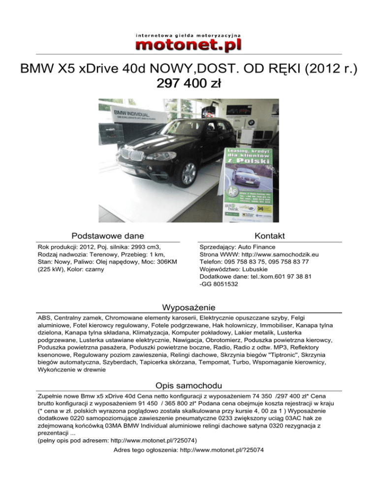 BMW X5 xDrive 40d NOWY,DOST. OD RĘKI (2012 r.) 297 400 zł Podstawowe dane Kontakt Rok produkcji: 2012, Poj. silnika: 2993 cm3, Rodzaj nadwozia: Terenowy, Przebieg: 1 km, Stan: Nowy, Paliwo: Olej napędowy, Moc: 306KM (225 kW), Kolor: czarny Sprzedający: Auto Finance Strona WWW: http://www.samochodzik.eu Telefon: 095 758 83 75, 095 758 83 77 Województwo: Lubuskie Dodatkowe dane: tel.:kom.601 97 38 81 -GG 8051532 Wyposażenie ABS, Centralny zamek, Chromowane elementy karoserii, Elektrycznie opuszczane szyby, Felgi aluminiowe, Fotel kierowcy regulowany, Fotele podgrzewane, Hak holowniczy, Immobiliser, Kanapa tylna dzielona, Kanapa tylna składana, Klimatyzacja, Komputer pokładowy, Lakier metalik, Lusterka podgrzewane, Lusterka ustawiane elektrycznie, Nawigacja, Obrotomierz, Poduszka powietrzna kierowcy, Poduszka powietrzna pasażera, Poduszki powietrzne boczne, Radio, Radio z odtw. MP3, Reflektory ksenonowe, Regulowany poziom zawieszenia, Relingi dachowe, Skrzynia biegów ''Tiptronic'', Skrzynia biegów automatyczna, Szyberdach, Tapicerka skórzana, Tempomat, Turbo, Wspomaganie kierownicy, Wykończenie w drewnie Opis samochodu Zupełnie nowe Bmw x5 xDrive 40d Cena netto konfiguracji z wyposażeniem 74 350 /297 400 zł* Cena brutto konfiguracji z wyposażeniem 91 450 / 365 800 zł* Podana cena obejmuje koszta rejestracji w kraju (* cena w zł. polskich wyrazona poglądowo została skalkulowana przy kursie 4, 00 za 1 ) Wyposażenie dodatkowe 0220 samopoziomujące zawieszenie pneumatyczne 0233 zwiększony uciąg 03AC hak ze zdejmowaną końcówką 03MA BMW Individual aluminiowe relingi dachowe satyna 0320 rezygnacja z prezentacji ... (pełny opis pod adresem: http://www.motonet.pl/?25074) Adres tego ogłoszenia: http://www.motonet.pl/?25074