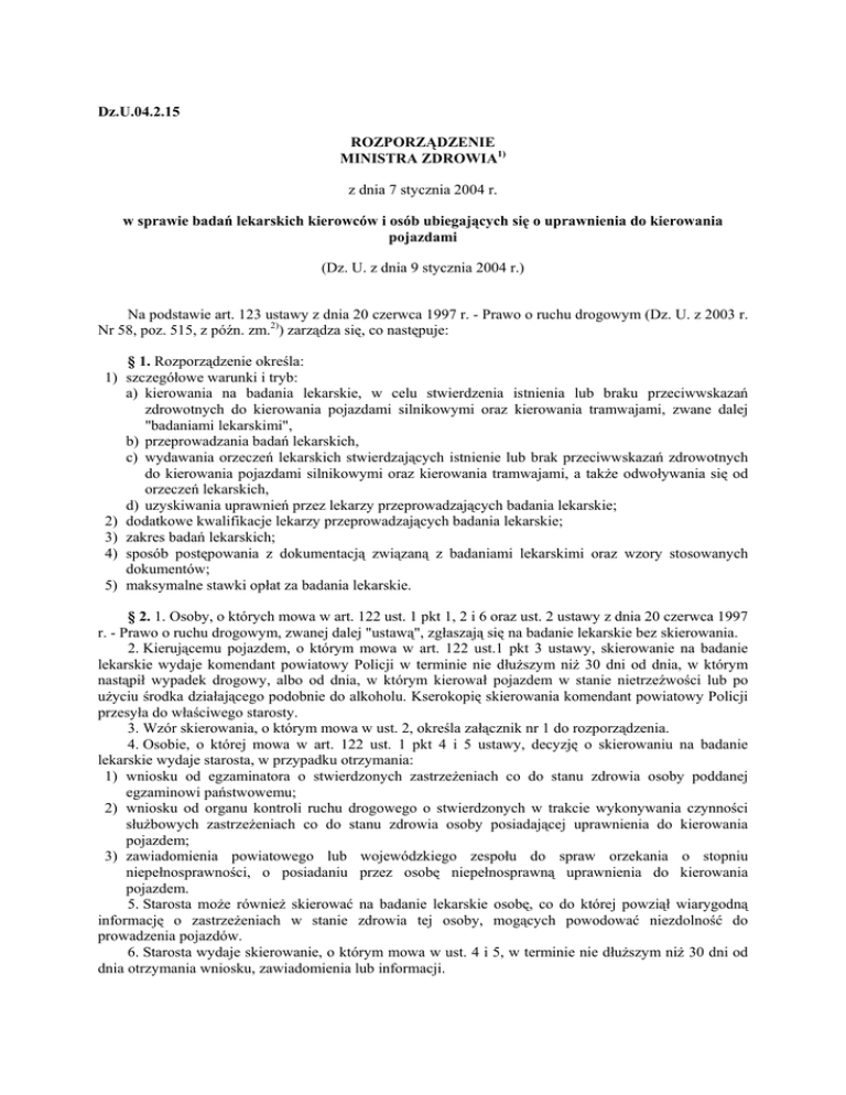 Dz.U.04.2.15 ROZPORZĄDZENIE MINISTRA ZDROWIA1) z dnia 7 stycznia 2004 r. w sprawie badań lekarskich kierowców i osób ubiegających się o uprawnienia do kierowania pojazdami (Dz. U. z dnia 9 stycznia 2004 r.) Na podstawie art. 123 ustawy z dnia 20 czerwca 1997 r. - Prawo o ruchu drogowym (Dz. U. z 2003 r. Nr 58, poz. 515, z późn. zm.2)) zarządza się, co następuje: § 1. Rozporządzenie określa: 1) szczegółowe warunki i tryb: a) kierowania na badania lekarskie, w celu stwierdzenia istnienia lub braku przeciwwskazań zdrowotnych do kierowania pojazdami silnikowymi oraz kierowania tramwajami, zwane dalej "badaniami lekarskimi", b) przeprowadzania badań lekarskich, c) wydawania orzeczeń lekarskich stwierdzających istnienie lub brak przeciwwskazań zdrowotnych do kierowania pojazdami silnikowymi oraz kierowania tramwajami, a także odwoływania się od orzeczeń lekarskich, d) uzyskiwania uprawnień przez lekarzy przeprowadzających badania lekarskie; 2) dodatkowe kwalifikacje lekarzy przeprowadzających badania lekarskie; 3) zakres badań lekarskich; 4) sposób postępowania z dokumentacją związaną z badaniami lekarskimi oraz wzory stosowanych dokumentów; 5) maksymalne stawki opłat za badania lekarskie. § 2. 1. Osoby, o których mowa w art. 122 ust. 1 pkt 1, 2 i 6 oraz ust. 2 ustawy z dnia 20 czerwca 1997 r. - Prawo o ruchu drogowym, zwanej dalej "ustawą", zgłaszają się na badanie lekarskie bez skierowania. 2. Kierującemu pojazdem, o którym mowa w art. 122 ust.1 pkt 3 ustawy, skierowanie na badanie lekarskie wydaje komendant powiatowy Policji w terminie nie dłuższym niż 30 dni od dnia, w którym nastąpił wypadek drogowy, albo od dnia, w którym kierował pojazdem w stanie nietrzeźwości lub po użyciu środka działającego podobnie do alkoholu. Kserokopię skierowania komendant powiatowy Policji przesyła do właściwego starosty. 3. Wzór skierowania, o którym mowa w ust. 2, określa załącznik nr 1 do rozporządzenia. 4. Osobie, o której mowa w art. 122 ust. 1 pkt 4 i 5 ustawy, decyzję o skierowaniu na badanie lekarskie wydaje starosta, w przypadku otrzymania: 1) wniosku od egzaminatora o stwierdzonych zastrzeżeniach co do stanu zdrowia osoby poddanej egzaminowi państwowemu; 2) wniosku od organu kontroli ruchu drogowego o stwierdzonych w trakcie wykonywania czynności służbowych zastrzeżeniach co do stanu zdrowia osoby posiadającej uprawnienia do kierowania pojazdem; 3) zawiadomienia powiatowego lub wojewódzkiego zespołu do spraw orzekania o stopniu niepełnosprawności, o posiadaniu przez osobę niepełnosprawną uprawnienia do kierowania pojazdem. 5. Starosta może również skierować na badanie lekarskie osobę, co do której powziął wiarygodną informację o zastrzeżeniach w stanie zdrowia tej osoby, mogących powodować niezdolność do prowadzenia pojazdów. 6. Starosta wydaje skierowanie, o którym mowa w ust. 4 i 5, w terminie nie dłuższym niż 30 dni od dnia otrzymania wniosku, zawiadomienia lub informacji. 7. Wzór skierowania, o którym mowa w ust. 4 i 5, określa załącznik nr 2 do rozporządzenia. wzory § 3. 1. Badanie lekarskie może być wykonane przez lekarza, spełniającego warunek, o którym mowa w § 14 ust. 1 albo 2, zwanego dalej "uprawnionym lekarzem". 2. Badanie lekarskie przeprowadza się po sprawdzeniu tożsamości osoby badanej. § 4. 1. W ramach badania lekarskiego uprawniony lekarz ocenia u osoby badanej ogólny stan zdrowia, a w szczególności stan układu krążenia, układu oddechowego, układu nerwowego, sprawność narządu ruchu i stan psychiczny. 2. W wyniku badania lekarskiego uprawniony lekarz stwierdza u osoby badanej istnienie lub brak: 1) chorób narządu wzroku; 2) chorób narządu słuchu i równowagi; 3) chorób układu sercowo-naczyniowego; 4) chorób narządu ruchu; 5) chorób układu nerwowego; 6) zaburzeń psychicznych; 7) cukrzycy, przy uwzględnieniu wyników badania poziomu cukru we krwi; 8) niewydolności nerek; 9) objawów wskazujących na uzależnienie od alkoholu lub jego nadużywanie; 10) objawów wskazujących na uzależnienie od środków o działaniu podobnym do alkoholu lub ich nadużywanie; 11) przyjmowania leków, mogących mieć wpływ na zdolność do prowadzenia pojazdu; 12) innych poważnych zaburzeń stanu zdrowia istotnych dla oceny zdolności do prowadzenia pojazdu. 3. Jeżeli uprawniony lekarz stwierdzi istotne odchylenia od prawidłowego stanu zdrowia, zleca osobie badanej odpowiednie badania pomocnicze i konsultacje specjalistyczne. 4. Skierowanie w celu wykonania konsultacji okulistycznej oraz przeprowadzenia badania oceniającego widzenie zmierzchowe i zjawisko olśnienia jest obligatoryjne w odniesieniu do: 1) osób ubiegających się albo posiadających prawo jazdy kategorii C, C1, D, D1, C+E, C1+E, D+E, D1+E lub pozwolenie do kierowania tramwajem; 2) kierowców podlegających kontrolnym badaniom lekarskim, o których mowa w art. 122 ust. 2 ustawy; 3) kandydatów na instruktorów lub egzaminatorów osób ubiegających się o uprawnienia do kierowania pojazdami; 4) kierowców podlegających badaniom lekarskim, o których mowa w art. 39c ustawy z dnia 6 września 2001 r. o transporcie drogowym (Dz. U. Nr 125, poz. 1371, z późn. zm.3)). 5. Przy ustalaniu ograniczeń w kierowaniu pojazdem wynikających ze stanu zdrowia kandydata na kierowcę i kierowcy należy brać pod uwagę stopień zaawansowania objawów chorobowych i ich dynamikę, z uwzględnieniem możliwości postępu choroby, jak i cofania się jej objawów. 6. W przypadku zastrzeżeń co do stanu zdrowia kandydata na kierowcę i kierowcy, uprawniony lekarz wyznacza datę ponownego badania wynikającą z oceny stanu zdrowia osoby badanej. 7. Uprawniony lekarz powinien korzystać ze wskazówek metodycznych dotyczących postępowania w stosunku do kandydatów na kierowców i kierowców, upowszechnianych przez jednostki badawczorozwojowe w dziedzinie medycyny pracy. § 5. Jeżeli kierujący pojazdem lub oso