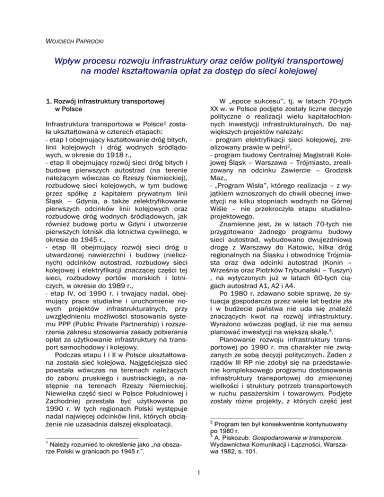 WOJCIECH PAPROCKI Wpływ procesu rozwoju infrastruktury oraz celów polityki transportowej na model kształtowania opłat za dostęp do sieci kolejowej 1. Rozwój infrastruktury transportowej w Polsce W „epoce sukcesu”, tj. w latach 70-tych XX w. w Polsce podjęte zostały liczne decyzje polityczne o realizacji wielu kapitałochłonnych inwestycji infrastrukturalnych. Do największych projektów należały: - program elektryfikacji sieci kolejowej, zrealizowany prawie w pełni2, - program budowy Centralnej Magistrali Kolejowej Śląsk – Warszawa – Trójmiasto, zrealizowany na odcinku Zawiercie – Grodzisk Maz., - „Program Wisła”, którego realizacja – z wyjątkiem wznoszonych do chwili obecnej inwestycji na kilku stopniach wodnych na Górnej Wiśle – nie przekroczyła etapu studialnoprojektowego. Znamienne jest, że w latach 70-tych nie przygotowano żadnego programu budowy sieci autostrad, wybudowano dwujezdniową drogę z Warszawy do Katowic, kilka dróg regionalnych na Śląsku i obwodnicę Trójmiasta oraz dwa odcinki autostrad (Konin – Września oraz Piotrków Trybunalski – Tuszyn) , na wytyczonych już w latach 60-tych ciągach autostrad A1, A2 i A4. Po 1980 r. zdawano sobie sprawę, że sytuacja gospodarcza przez wiele lat będzie zła i w budżecie państwa nie uda się znaleźć znaczących kwot na rozwój infrastruktury. Wyrażono wówczas pogląd, iż nie ma sensu planować inwestycji na większą skalę.3. Planowanie rozwoju infrastruktury transportowej po 1990 r. ma charakter nie związanych ze sobą decyzji politycznych. Żaden z rządów III RP nie zdobył się na przedstawienie kompleksowego programu dostosowania infrastruktury transportowej do zmienionej wielkości i struktury potrzeb transportowych w ruchu pasażerskim i towarowym. Podjęte zostały różne projekty, z których część jest Infrastruktura transportowa w Polsce1 została ukształtowana w czterech etapach: - etap I obejmujący kształtowanie dróg bitych, linii kolejowych i dróg wodnych śródlądowych, w okresie do 1918 r., - etap II obejmujący rozwój sieci dróg bitych i budowę pierwszych autostrad (na terenie należącym wówczas co Rzeszy Niemieckiej), rozbudowę sieci kolejowych, w tym budowę przez spółkę z kapitałem prywatnym linii Śląsk – Gdynia, a także zelektryfikowanie pierwszych odcinków linii kolejowych oraz rozbudowę dróg wodnych śródlądowych, jak również budowę portu w Gdyni i utworzenie pierwszych lotnisk dla lotnictwa cywilnego, w okresie do 1945 r., - etap III obejmujący rozwój sieci dróg o utwardzonej nawierzchni i budowy (nielicznych) odcinków autostrad, rozbudowy sieci kolejowej i elektryfikacji znaczącej części tej sieci, rozbudowy portów morskich i lotniczych, w okresie do 1989 r., - etap IV, od 1990 r. i trwający nadal, obejmujący prace studialne i uruchomienie nowych projektów infrastrukturalnych, przy uwzględnieniu możliwości stosowania systemu PPP (Public Private Partnership) i rozszerzenia zakresu stosowania zasady pobierania opłat za użytkowanie infrastruktury na transport samochodowy i kolejowy. Podczas etapu I i II w Polsce ukształtowana została sieć kolejowa. Najgęściejsza sieć powstała wówczas na terenach należących do zaboru pruskiego i austriackiego, a następnie na terenach Rzeszy Niemieckiej. Niewielka część sieci w Polsce Południowej i Zachodniej przestała być użytkowana po 1990 r. W tych regionach Polski występuje nadal najwięcej odcinków linii, których obciążenie nie uzasadnia dalszej eksploatacji. 2 Program ten był konsekwentnie kontynuowany po 1980 r. 3 A. Piskozub: Gospodarowanie w transporcie. Wydawnictwa Komunikacji i Łączności, Warszawa 1982, s. 101. 1 Należy rozumieć to określenie jako „na obszarze Polski w granicach po 1945 r.”. 1 już w realizacji. Nieliczne projekty zostały zakończone, choćby cząstkowo, np. - budowa odcinka autostrady A2 (Września – Poznań), - budowa odcinka autostrady A4 (Gliwice/Nogowczyce – Wrocław), - modernizacja odcinków autostrady A2 (Konin – Września) i A4 (Kraków – Katowice), - modernizacja odcinka linii kolejowej E20 (Rzepin – Warszawa). W horyzoncie do 2030 r. w Polsce nie przewiduje się budowy ani jednej nowej linii kolejowej. Na kształtowanie programu modernizacji i rozwoju infrastruktury transportowej w Polsce od 1990 r. coraz większy wpływ mają decyzje organów UE, które akceptują przede wszystkim wnioski o dofinansowanie inwestycji realizowanych w paneuropejskich korytarzach transportowych. Ze strony organów UE występuje bardzo ograniczone zainteresowanie kształtowaniem ciągów komunikacyjnych w euroregionach, które położone są „peryferyjnie” w stosunku do biegu paneuropejskich korytarzy. Taką praktykę można obserwować w minionych latach, choć jest ona niezgodna z jednym z głównych celów polityki europejskiej: „inwestycje infrastrukturalne powinny się przyczyniać do rozwoju regionów zacofanych, pozbawionych szans rozwojowych”4. Historycznie ukształtowany proces tworzenia infrastruktury transportowej, w tym sieci linii kolejowych wraz z budynkami dworców kolejowych i torami stacyjnymi, determinuje zakres i charakter współczesnych, a także przyszłych decyzji o dostosowaniu tej infrastruktury do obecnych i prognozowanych potrzeb występujących w całym kraju oraz w poszczególnych regionach. W świadomości społecznej w Polsce dominuje przekonanie, iż decyzje o rozwoju infrastruktury transportowej zawsze zapadały na szczeblu centralnym i realizacja inwestycji była finansowana wyłącznie z funduszy centralnych. Ma to ogromne znaczenie dla kształtowania się zainteresowania samorządowych władz regionalnych problemem pomiaru potrzeb i poszukiwania źródeł sfinansowania projektów inwestycyjnych o znaczeniu regionalnym. Jedną z form świadomości społecznej ukształtowanej w poprzednim etapie rozwoju infrastruktury jest zgłaszanie na szczeblu regionalnym roszczeń 