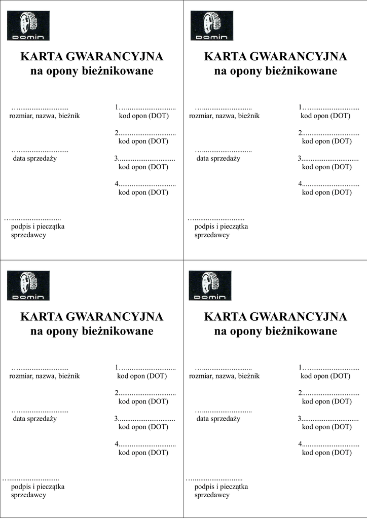 KARTA GWARANCYJNA na opony bieżnikowane …........................... rozmiar, nazwa, bieżnik 1…........................... kod opon (DOT) KARTA GWARANCYJNA na opony bieżnikowane …........................... rozmiar, nazwa, bieżnik 2............................... kod opon (DOT) …........................... data sprzedaży 3............................... kod opon (DOT) 2............................... kod opon (DOT) …........................... data sprzedaży 4............................... kod opon (DOT) …........................... podpis i pieczątka sprzedawcy 4............................... kod opon (DOT) 1…........................... kod opon (DOT) KARTA GWARANCYJNA na opony bieżnikowane …........................... rozmiar, nazwa, bieżnik 2............................... kod opon (DOT) …........................... data sprzedaży 3............................... kod opon (DOT) 1…........................... kod opon (DOT) 2............................... kod opon (DOT) …........................... data sprzedaży 4............................... kod opon (DOT) …........................... podpis i pieczątka sprzedawcy 3............................... kod opon (DOT) …........................... podpis i pieczątka sprzedawcy KARTA GWARANCYJNA na opony bieżnikowane …........................... rozmiar, nazwa, bieżnik 1…........................... kod opon (DOT) 3............................... kod opon (DOT) 4............................... kod opon (DOT) …........................... podpis i pieczątka sprzedawcy Okres gwarancji wynosi 24 miesiące od daty zakupu, nie dłużej niż 36 miesięcy od daty produkcji. WARUNKI GWARANCJI 1. Zgłoszenia reklamacji należy dokonać w punkcie zakupu opon lub bezpośrednio w firmie. 2. Warunkiem rozpatrzenia reklamacji jest: a) dostarczenie reklamowanej opony do punktu przyjmującego reklamację b) przedłożenie karty gwarancyjnej wraz z dokumentem zakupu c) zgłoszenie reklamacji na zakłócenia jazdy (bicie, ściąganie, wibracje) oraz nierówności na boku niezwłocznie po rozpoczęciu eksploatacji tj. przy zużyciu opony nie więcej niż 10% d) na żądanie przyjmującego reklamację lub Gwaranta - udostępnienie pojazdu do oceny stanu technicznego 3. Od decyzji Gwaranta rozstrzygającej o uznaniu bądź nie uznaniu reklamacji, nie służy odwołanie do Gwaranta. 4. W przypadku nie uznania reklamacji ewentualny zwrot opon odbywa się na koszt Klienta. 5. Gwarancja nie dotyczy przypadków, gdy opona była eksploatowana w nieodpowiednich warunkach : - eksploatacja opony na pojedzie nie sprawnym technicznie np. złej zbieżności, niewyważenia kół, uszkodzonych lub zużytych amortyzatorów, poduszek, tulei metalowo-gumowych, sprężyn, resorów, drążków reakcyjnych i innych elementów zawieszenia - uszkodzeń mechanicznych opony spowodowanych np. niewłaściwym montażem, najechaniem na ostre krawędzie, -zniszczeń spowodowanych przez substancje żrące i ropopochodne np. oleje, benzyna, nafta, płyn hamulcowy..... - zużyciem rzeźby bieżnika poniżej 1,6mm(TWI) 6.Gwarancja na oponę nie obejmuje rekompensaty za utratę czasu, za czasową niesprawność pojazdu, niewygodę oraz związane ze złożeniem reklamacji niedogodności lub koszty. 7. Reklamującemu w razie uznania reklamacji przysługuje wymiana na nową bądź zwrot kwoty poniesionej przy zakupie. Okres gwarancji wynosi 24 miesiące od daty zakupu, nie dłużej niż 36 miesięcy od daty produkcji. WARUNKI GWARANCJI 1. Zgłoszenia reklamacji należy dokonać w punkcie zakupu opon lub bezpośrednio w firmie. 2. Warunkiem rozpatrzenia reklamacji jest: a) dostarczenie reklamowanej opony do punktu przyjmującego reklamację b) przedłożenie karty gwarancyjnej wraz z dokumentem zakupu c) zgłoszenie reklamacji na zakłócenia jazdy (bicie, ściąganie, wibracje) oraz nierówności na boku niezwłocznie po rozpoczęciu eksploatacji tj. przy zużyciu opony nie więcej niż 10% d) na żądanie przyjmującego reklamację lub Gwaranta - udostępnienie pojazdu do oceny stanu technicznego 3. Od decyzji Gwaranta rozstrzygającej o uznaniu bądź nie uznaniu reklamacji, nie służy odwołanie do Gwaranta. 4. W przypadku nie uznania reklamacji ewentualny zwrot opon odbywa się na koszt Klienta. 5. Gwarancja nie dotyczy przypadków, gdy opona była eksploatowana w nieodpowiednich warunkach : - eksploatacja opony na pojedzie nie sprawnym technicznie np. złej zbieżności, niewyważenia kół, uszkodzonych lub zużytych amortyzatorów, poduszek, tulei metalowo-gumowych, sprężyn, resorów, drążków reakcyjnych i innych elementów zawieszenia - uszkodzeń mechanicznych opony spowodowanych np. niewłaściwym montażem, najechaniem na ostre krawędzie, -zniszczeń spowodowanych przez substancje żrące i ropopochodne np. oleje, benzyna, nafta, płyn hamulcowy..... - zużyciem rzeźby bieżnika poniżej 1,6mm(TWI) 6.Gwarancja na oponę nie obejmuje rekompensaty za utratę czasu, za czasową niesprawność pojazdu, niewygodę oraz związane ze złożeniem reklamacji niedogodności lub koszty. 7. Reklamującemu w razie uznania reklamacji przysługuje wymiana na nową bądź zwrot kwoty poniesionej przy zakupie. Okres gwarancji wynosi 24 miesiące od daty zakupu, nie dłużej niż 36 miesięcy od daty produkcji. WARUNKI GWARANCJI 1. Zgłoszenia reklamacji należy dokonać w punkcie zakupu opon lub bezpośrednio w firmie. 2. Warunkiem rozpatrzenia reklamacji jest: a) dostarczenie reklamowanej opony do punktu przyjmującego reklamację b) przedłożenie karty gwarancyjnej wraz z dokumentem zakupu c) zgłoszenie reklamacji na zakłócenia jazdy (bicie, ściąganie, wibracje) oraz nierówności na boku niezwłocznie po rozpoczęciu eksploatacji tj. przy zużyciu opony nie więcej niż 10% d) na żądanie przyjmującego reklamację lub Gwaranta - udostępnienie pojazdu do oceny stanu technicznego 3. Od decyzji Gwaranta rozstrzygającej o uznaniu bądź ni