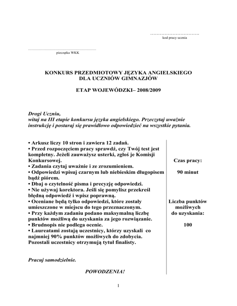 …………………………. kod pracy ucznia ………………………………………………… pieczątka WKK KONKURS PRZEDMIOTOWY JĘZYKA ANGIELSKIEGO DLA UCZNIÓW GIMNAZJÓW ETAP WOJEWÓDZKI– 2008/2009 Drogi Uczniu, witaj na III etapie konkursu języka angielskiego. Przeczytaj uważnie instrukcję i postaraj się prawidłowo odpowiedzieć na wszystkie pytania. • Arkusz liczy 10 stron i zawiera 12 zadań. • Przed rozpoczęciem pracy sprawdź, czy Twój test jest kompletny. Jeżeli zauważysz usterki, zgłoś je Komisji Konkursowej. Czas pracy: • Zadania czytaj uważnie i ze zrozumieniem. • Odpowiedzi wpisuj czarnym lub niebieskim długopisem 90 minut bądź piórem. • Dbaj o czytelność pisma i precyzję odpowiedzi. • Nie używaj korektora. Jeśli się pomylisz przekreśl błędną odpowiedź i wpisz poprawną. • Oceniane będą tylko odpowiedzi, które zostały Liczba punktów umieszczone w miejscu do tego przeznaczonym. możliwych • Przy każdym zadaniu podano maksymalną liczbę do uzyskania: punktów możliwą do uzyskania za jego rozwiązanie. • Brudnopis nie podlega ocenie. 100 • Laureatami zostają uczestnicy, którzy uzyskali co najmniej 90% punktów możliwych do zdobycia. Pozostali uczestnicy otrzymują tytuł finalisty. Pracuj samodzielnie. POWODZENIA! 1 Zadanie 1 Które miasto należy odwiedzić jeśli chce się zobaczyć następujące miejsca? Wpisz odpowiednie litery obok cyfr w tabeli. Za każdą poprawną odpowiedź otrzymasz 1 punkt. 1. The White House 2. Sunset Boulevard 3. The Sears Tower 4. Holyrood Palace 5. The British Museum 6. CN Tower 1. 2. a) Chicago b) Los Angeles c) London d) Washington DC e) Toronto f) Edinburgh 3. 4. 5. 6. ……p / 6 p Zadanie 2 Uzupełnij brakujące informacje. Za każdą poprawną odpowiedź otrzymasz 1 punkt. 1. The present president of the USA is called ………………… …………………….. . 2. The maple leaf is the national symbol of ……………………….. . 3. Aborigines live in ………………………….. . 4. Another name for Northern Ireland is ……………………..… . 5. The national symbol of New Zealand is the ………………….. bird. 6. The highest mountain in Great Britain is …………………. ……………………. . 7. Two main political parties in the USA are the …………………….. and the Republicans. 8. IRA stands for ……………..…… ……………………… …………………….. . 9. ………………………. is an island situated about 150 kilometres south of Australia. ……p / 9 p Zadanie 3 Przyporządkuj idiomy do ich definicji. Wpisz odpowiedzi do tabeli. Za każdą poprawną odpowiedź otrzymasz 1 punkt. 1. to relax 2. extremely pleased 3. in debt 4. to live on a smaller budget, spend less than before 5. very rarely 6. to get conversation started 7. to die 8. modern, new 9. using few words 10. realistic, practical 1. 2. 3. 4. 5. 6. a) once in a blue moon b) in the red c) break the ice d) in a nutshell e) take things easy f) kick the bucket g) tighten one’s belt h) down-to-earth i) over the moon j) up-to-date 7. 8. 9. 10. ……p / 10 p 2 Zadanie 4 Przeczytaj poniższe zdania i wybierz odpowiednie słowo. Podkreśl właściwą odpowiedź. Za każdą poprawną odpowiedź otrzymasz 1 punkt. 1. Can you remember/remind me of your telephone number? 2. Some lawyers earn/ gain about $ 200 000 a year. 3. The best way to relieve /settle stress is to understand what causes it. 4. He is thinking of dying/colouring his hair green. 5. How much was your electricity bill/account last month? 6. The antique desk he inherited from his father is priceless/valuable to him. 7. There was a big flock/herd of birds flying over the school yesterday. 8. Taxi fares/prices are very high in New York. 9. You’ve probably dialed/rang the wrong number. 10. Does this jacket match/fit this skirt? ……p / 10 p Zadanie 5 Przeczytaj poniższe zdania i zastąp podkreślone w nich słowa ich synonimami podanymi w ramce. Za każdą poprawną odpowiedź otrzymasz 1 punkt. peculiar precious remarks annoy secret fear inquiries scent shake contestants 1. Everybody likes the smell of roses. 2. They entered the room full of valuable stones and gold. 3. We are getting a lot of questions about our new Cardiff – Toronto service. 4. ‘This is confidential commercial information’, she said. 5. There has been much anxiety about the role of local government in the last twenty years. 6. She has had enough of his sarcastic comments. 7. There was a strange, inhuman sound, then I heard a door shut upstairs on the top floor. 8. ‘Doesn't it bother you that people are staring?’ 9. What she saw made her mouth go dry and her legs tremble. 10. Over 250 competitors will take part in the race. 1. ___________________________ 6. _______________________________ 2. ___________________________ 7. _______________________________ 3. __________________________ 8. _______________________________ 4. __________________________ 9. _______________________________ 5. ___________________________ 10. _______________________________ ……p / 10 p 3 Zadanie 6 Dokończ każde z rozpoczętych zdań w taki sposób , aby znaczyło to samo, co poprzedzające je zdanie. Za każdą poprawną odpowiedź otrzymasz 1 punkt. 1. The film was so boring that she fell asleep. It was _________________________________________ that she fell asleep. 2. The last time I fed the dog was four hours ago. I haven’t _______________________________________________________ 3. This car belongs to my father. This is ________________________________________________________ 4. It isn’t necessary for Peter to water the flowers every day. Peter _________________________________________ the flowers every day. 5. I’m sure she had studied a lot before the exam. She _______________________________________________ before the exam. 6. Pam can run faster than Jane. Jane can’t _________________________________