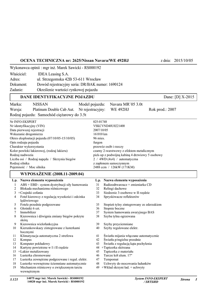 OCENA TECHNICZNA nr: 2625/Nissan Navara/WE 492HJ