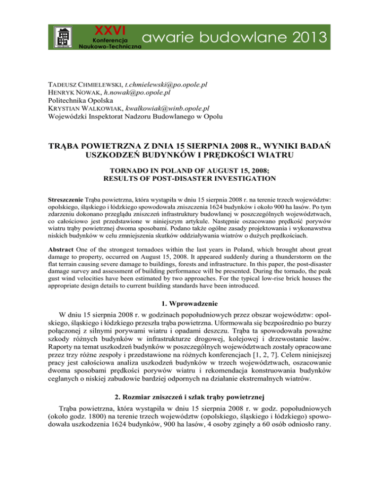 XXVI Konferencja Naukowo-Techniczna awarie budowlane 2013 TADEUSZ CHMIELEWSKI, [email protected] HENRYK NOWAK, [email protected] Politechnika Opolska KRYSTIAN WALKOWIAK, [email protected] Wojewódzki Inspektorat Nadzoru Budowlanego w Opolu TRĄBA POWIETRZNA Z DNIA 15 SIERPNIA 2008 R., WYNIKI BADAŃ USZKODZEŃ BUDYNKÓW I PRĘDKOŚCI WIATRU TORNADO IN POLAND OF AUGUST 15, 2008; RESULTS OF POST-DISASTER INVESTIGATION Streszczenie Trąba powietrzna, która wystąpiła w dniu 15 sierpnia 2008 r. na terenie trzech województw: opolskiego, śląskiego i łódzkiego spowodowała zniszczenia 1624 budynków i około 900 ha lasów. Po tym zdarzeniu dokonano przeglądu zniszczeń infrastruktury budowlanej w poszczególnych województwach, co całościowo jest przedstawione w niniejszym artykule. Następnie oszacowano prędkość porywów wiatru trąby powietrznej dwoma sposobami. Podano także ogólne zasady projektowania i wykonawstwa niskich budynków w celu zmniejszenia skutków oddziaływania wiatrów o dużych prędkościach. Abstract One of the strongest tornadoes within the last years in Poland, which brought about great damage to property, occurred on August 15, 2008. It appeared suddenly during a thunderstorm on the flat terrain causing severe damage to buildings, forests and infrastructure. In this paper, the post-disaster damage survey and assessment of building performance will be presented. During the tornado, the peak gust wind velocities have been estimated by two approaches. For the typical low-rise brick houses the appropriate design details to current building standards have been introduced. 1. Wprowadzenie W dniu 15 sierpnia 2008 r. w godzinach popołudniowych przez obszar województw: opolskiego, śląskiego i łódzkiego przeszła trąba powietrzna. Uformowała się bezpośrednio po burzy połączonej z silnymi porywami wiatru i opadami deszczu. Trąba ta spowodowała poważne szkody różnych budynków w infrastrukturze drogowej, kolejowej i drzewostanie lasów. Raporty na temat uszkodzeń budynków w poszczególnych województwach zostały opracowane przez trzy różne zespoły i przedstawione na różnych konferencjach [1, 2, 7]. Celem niniejszej pracy jest całościowa analiza uszkodzeń budynków w trzech województwach, oszacowanie dwoma sposobami prędkości porywów wiatru i rekomendacja konstruowania budynków ceglanych o niskiej zabudowie bardziej odpornych na działanie ekstremalnych wiatrów. 2. Rozmiar zniszczeń i szlak trąby powietrznej Trąba powietrzna, która wystąpiła w dniu 15 sierpnia 2008 r. w godz. popołudniowych (około godz. 1800) na terenie trzech województw (opolskiego, śląskiego i łódzkiego) spowodowała uszkodzenia 1624 budynków, 900 ha lasów, 4 osoby zginęły a 60 osób odniosło rany. 236 Chmielewski T. i in.: Trąba powietrzna z dnia 15 sierpnia 2008 r., wyniki badań uszkodzeń… Na rys. 1 przedstawiono szlak trąby, który w przybliżeniu tworzy linię prostą z zachodu w kierunku północno – wschodnim. a) b) Rys. 1. Szlak trąby powietrznej 15.08.2008 r. pokazany na dwóch mapach: a) w małej skali, b) w dużej skali Długość szlaku oszacowano na około 105 km, jego szerokość od 300 do 700 m. Przesuwając się od województwa opolskiego niszczyła wszystko co napotkała na swoim szlaku. Oprócz powyżej wymienionych zniszczeń stwierdzono także zniszczenia infrastruktury kolejowej, drogowej, energetycznej i telefonicznej. Linia kolejowa między Gliwicami i Strzelcami Opolskimi została zamknięta z powodu zniszczeń słupów trakcji kolejowej i sieci trakcyjnej w Błotnicy Strzeleckiej. Słupy podtrzymujące przewody wysokiego napięcia i semafory spadły na tory kolejowe i perony. Wiele dróg lokalnych w wymienionych województwach znajdujących się na szlaku trąby było nieprzejezdnych, ponieważ złamane drzewa zatarasowały drogi. Mieszkańcy w okolicach szlaku trąby zostali pozbawieni łączności telefonów stacjonarnych, ale także i komórkowych, ponieważ trąba uszkodziła nadajniki. 3. Ocena trąby powietrznej z dnia 15 sierpnia 2008 r. 3.1. Oszacowanie prędkości chwilowych trąby powietrznej Pośredniego oszacowania chwilowych prędkości wiatru trąby dokonano dwoma sposobami. Pierwszy sposób polegał na porównaniu szkód, dokonanych przez trąbę ze skalami klasyfikacyjnymi prędkości wiatru tornad. Takie skale intensywności tornad opracowano w latach 70 ubiegłego wieku, pierwszą w USA – skala Fujity-Pearsona, drugą w Wielkiej Brytanii – skala TORRO (Tornado and Storm Research Organization) [4,6]. Autorzy niniejszej pracy podzielają uwagi zawarte w pracy [3], że przeniesienie skali Fujity do Europy jest nieuzasadnione, ponieważ europejskie budownictwo w zakresie wielkości domów i technologii wykonania różni się znacznie od rozwiązań stosowanych w Ameryce (gdzie domy są większe i lżejsze – głównie drewniane, poza centrum dużych miast). Należy podkreślić, że skala TORRO została oparta na pomiarach prędkości wiatru, jak i badaniach naukowych, w tym na analizie nośności zniszczonych obiektów, a także bierze pod uwagę warunki klimatyczne dla Europy. Skala TORRO jest podzielona na 11 skal intensywności, tj. od skali intensywności T0÷T10. Każdy stopień skali jest scharakteryzowany krótkim opisem, przedziałem prędkości wiatru i opisem uszkodzeń. Na przykład opis uszkodzeń budynków wywołanych trąbami powietrznymi o intensywności T4 i T5 przedstawiono w tablicy 1. Diagnostyka w ocenie bezpieczeństwa konstrukcji 237 Tablica 1. Opis skutków zniszczeń wywołanych trąbami powietrznymi T4 i T5 wg skali TORRO Intensywność Opis trąby powietrznej trąby i prędkości wiatru w m/s T4 T5 Opis zniszczeń budynków Całe dachy wyrwane z niektórych budynków. Więźby dachowe większych ceglanych (kamiennych) budynków całkowicie odkryte. Ściany szczytowe zniszczone. Ściany, całe dachy i kilka rzędów cegieł powyżej górnych Bardzo silna (intensywna) strop