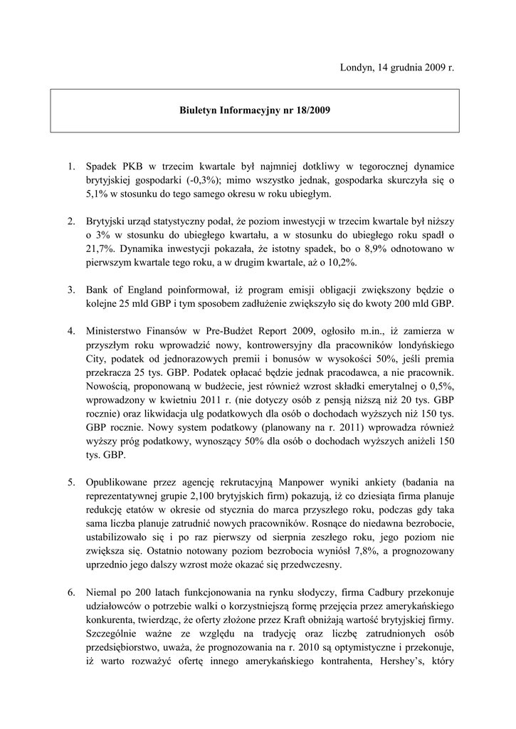 Londyn, 14 grudnia 2009 r. Biuletyn Informacyjny nr 18/2009 1. Spadek PKB w trzecim kwartale był najmniej dotkliwy w tegorocznej dynamice brytyjskiej gospodarki (-0,3%); mimo wszystko jednak, gospodarka skurczyła się o 5,1% w stosunku do tego samego okresu w roku ubiegłym. 2. Brytyjski urząd statystyczny podał, że poziom inwestycji w trzecim kwartale był niższy o 3% w stosunku do ubiegłego kwartału, a w stosunku do ubiegłego roku spadł o 21,7%. Dynamika inwestycji pokazała, że istotny spadek, bo o 8,9% odnotowano w pierwszym kwartale tego roku, a w drugim kwartale, aż o 10,2%. 3. Bank of England poinformował, iż program emisji obligacji zwiększony będzie o kolejne 25 mld GBP i tym sposobem zadłużenie zwiększyło się do kwoty 200 mld GBP. 4. Ministerstwo Finansów w Pre-Budżet Report 2009, ogłosiło m.in., iż zamierza w przyszłym roku wprowadzić nowy, kontrowersyjny dla pracowników londyńskiego City, podatek od jednorazowych premii i bonusów w wysokości 50%, jeśli premia przekracza 25 tys. GBP. Podatek opłacać będzie jednak pracodawca, a nie pracownik. Nowością, proponowaną w budżecie, jest również wzrost składki emerytalnej o 0,5%, wprowadzony w kwietniu 2011 r. (nie dotyczy osób z pensją niższą niż 20 tys. GBP rocznie) oraz likwidacja ulg podatkowych dla osób o dochodach wyższych niż 150 tys. GBP rocznie. Nowy system podatkowy (planowany na r. 2011) wprowadza również wyższy próg podatkowy, wynoszący 50% dla osób o dochodach wyższych aniżeli 150 tys. GBP. 5. Opublikowane przez agencję rekrutacyjną Manpower wyniki ankiety (badania na reprezentatywnej grupie 2,100 brytyjskich firm) pokazują, iż co dziesiąta firma planuje redukcję etatów w okresie od stycznia do marca przyszłego roku, podczas gdy taka sama liczba planuje zatrudnić nowych pracowników. Rosnące do niedawna bezrobocie, ustabilizowało się i po raz pierwszy od sierpnia zeszłego roku, jego poziom nie zwiększa się. Ostatnio notowany poziom bezrobocia wyniósł 7,8%, a prognozowany uprzednio jego dalszy wzrost może okazać się przedwczesny. 6. Niemal po 200 latach funkcjonowania na rynku słodyczy, firma Cadbury przekonuje udziałowców o potrzebie walki o korzystniejszą formę przejęcia przez amerykańskiego konkurenta, twierdząc, że oferty złożone przez Kraft obniżają wartość brytyjskiej firmy. Szczególnie ważne ze względu na tradycję oraz liczbę zatrudnionych osób przedsiębiorstwo, uważa, że prognozowania na r. 2010 są optymistyczne i przekonuje, iż warto rozważyć ofertę innego amerykańskiego kontrahenta, Hershey’s, który dysponuje podobnie wielkim kapitałem; prezentuje jednak stanowisko dużo bardziej neutralne w trakcie rozmów o przejęciu firmy. 7. Koncern petrochemiczny Shell, wraz z partnerującym mu Petronas, poinformowali o uzyskanej koncesji na eksploatację złóż ropy naftowej w Majnoon na południu Iraku; zawartość wymienianego surowca szacowana jest na 12,6 mld baryłek. To trzykrotnie więcej aniżeli zawartość złóż ropy naftowej w Morzu Północnym. 8. Nowatorskie metody wydobycia węgla spod poziomu Morza Północnego zaaprobował urząd regulacji do spraw węgla (UK Coal Authority), przyznając brytyjskoamerykańskiej firmie Clean Coal licencję na stosowanie metody podziemnej gazyfikacji węgla. Pięć nowych zakładów produkcyjnych, wykorzystując zaawansowane rozwiązania, dotrze do złóż surowca uprzednio nieużytkowanych. Metoda, stosowana z dużym powodzeniem w Australii, pozwoli Wielkiej Brytanii uzyskać do 5% zapotrzebowania na energię. 9. Rząd brytyjski w porozumieniu z najwyższym organem skarbowym, Exchequer, próbuje uregulować warunki, na których pracownicy sektora budowlanego rejestrują swój status zatrudnionego. Według rządu, 300 tys. pracowników rocznie unika płacenia należytego podatku, rejestrując się jako samo-zatrudniony, powodując tym samym straty w ściąganiu podatków rzędu 350 mln GBP rocznie. Organ twierdzi, iż samozatrudniony pracownik budowlany będzie musiał legitymować się własnym sprzętem budowlanym oraz materiałami i surowcami budowlanymi. W przeciwnym razie uznany będzie jako pracownik etatowy, a jego pensja podlegać będzie stosownemu opodatkowaniu. 10. Dojeżdżający codziennie do pracy mieszkańcy Londynu i okolic mogą korzystać z nowego, super-szybkiego połączenia, które w istocie połączyło północ i południe szybkobieżną komunikacją. Linia z Ashord w hrabstwie Kent do międzynarodowej stacji London St Pancras pokonuje trasę 58 mil w 37 minut. Pozostałe połączenia szybkobieżne, np. to z Edynburga do Londynu, pokonują trasę kilkuset mil w niecałe 3 godziny. 11. Ceny rachunków za wodę mogą wzrosnąć nawet o 29%, gdyż regulator sektora wodnego, Ofwat, nie doszedł po raz kolejny do porozumienia z firmami, dostarczającymi wodę do gospodarstw domowych. Problemem są wodomierze, których mimo wszystko zdecydowana liczba gospodarstw domowych jeszcze nie zainstalowała. Średni roczny rachunek za wodę, płacony do tej pory wynosił 723 GBP, według zakładanych przez Ofwat podwyżek, wzrośnie do 935 GBP przed końcem 2015 r. Podwyżki uderzyć mają najbardziej w domostwa bez zainstalowanych wodomierzy; spodziewany wzrost rachunków za wodę w mieszkaniach i domach z wodomierzem, wyniesie 1%. 12. Związki zawodowe linii lotniczych British Airways ogłosiły, iż od dnia 22 grudnia do 2 stycznia przeprowadzą strajk, protestując przeciwko warunkom pracy i decyzjom zarządu o masowych zwolnieniach i zamrożeniu płac. Pracownicy BA wyrażają także niezadowolenie z zaproponowanych ostatnio zasad zwolnienia pracowników i przyjęcia ich na nowych, mniej korzystnych warunkach. W głosowaniu nt. przyjęcia strajku, 9 na 10 pracowników zadecydowało, iż chce poprzeć związek zawodowy i odejść od stanowiska pracy w wyżej wymienionym terminie.