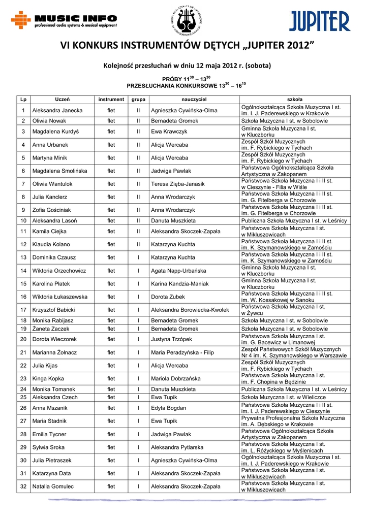VI KONKURS INSTRUMENTÓW DĘTYCH „JUPITER 2012” Kolejność przesłuchań w dniu 12 maja 2012 r. (sobota) 30 30 PRÓBY 11 – 13 30 15 PRZESŁUCHANIA KONKURSOWE 13 – 16 Lp Uczeń instrument grupa nauczyciel 1 Aleksandra Janecka flet II Agnieszka Cywińska-Olma 2 Oliwia Nowak flet II Bernadeta Gromek 3 Magdalena Kurdyś flet II Ewa Krawczyk 4 Anna Urbanek flet II Alicja Wercaba 5 Martyna Minik flet II Alicja Wercaba 6 Magdalena Smolińska flet II Jadwiga Pawlak 7 Oliwia Wantulok flet II Teresa Zięba-Janasik 8 Julia Kanclerz flet II Anna Wrodarczyk 9 Zofia Gościniak flet II Anna Wrodarczyk 10 Aleksandra Lasoń flet II Danuta Muszkieta 11 Kamila Ciejka flet II Aleksandra Skoczek-Zapała 12 Klaudia Kolano flet II Katarzyna Kuchta 13 Dominika Czausz flet I Katarzyna Kuchta 14 Wiktoria Orzechowicz flet I Agata Napp-Urbańska 15 Karolina Płatek flet I Karina Kandzia-Maniak 16 Wiktoria Łukaszewska flet I Dorota Zubek 17 Krzysztof Babicki flet I Aleksandra Borowiecka-Kwolek 18 19 Monika Rabijasz Żaneta Zaczek flet flet I I Bernadeta Gromek Bernadeta Gromek 20 Dorota Wieczorek flet I Justyna Trzópek 21 Marianna Żołnacz flet I Maria Peradzyńska - Filip 22 Julia Kijas flet I Alicja Wercaba 23 Kinga Kopka flet I Mariola Dobrzańska 24 25 Monika Tomanek Aleksandra Czech flet flet I I Danuta Muszkieta Ewa Tupik 26 Anna Mszanik flet I Edyta Bogdan 27 Maria Stadnik flet I Ewa Tupik 28 Emilia Tycner flet I Jadwiga Pawlak 29 Sylwia Sroka flet I Aleksandra Pytlarska 30 Julia Pietraszek flet I Agnieszka Cywińska-Olma 31 Katarzyna Data flet I Aleksandra Skoczek-Zapała 32 Natalia Gomulec flet I Aleksandra Skoczek-Zapała szkoła Ogólnokształcąca Szkoła Muzyczna I st. im. I. J. Paderewskiego w Krakowie Szkoła Muzyczna I st. w Sobolowie Gminna Szkoła Muzyczna I st. w Kluczborku Zespół Szkół Muzycznych im. F. Rybickiego w Tychach Zespół Szkół Muzycznych im. F. Rybickiego w Tychach Państwowa Ogólnokształcąca Szkoła Artystyczna w Zakopanem Państwowa Szkoła Muzyczna I i II st. w Cieszynie - Filia w Wiśle Państwowa Szkoła Muzyczna I i II st. im. G. Fitelberga w Chorzowie Państwowa Szkoła Muzyczna I i II st. im. G. Fitelberga w Chorzowie Publiczna Szkoła Muzyczna I st. w Leśnicy Państwowa Szkoła Muzyczna I st. w Mikluszowicach Państwowa Szkoła Muzyczna I i II st. im. K. Szymanowskiego w Zamościu Państwowa Szkoła Muzyczna I i II st. im. K. Szymanowskiego w Zamościu Gminna Szkoła Muzyczna I st. w Kluczborku Gminna Szkoła Muzyczna I st. w Kluczborku Państwowa Szkoła Muzyczna I i II st. im. W. Kossakowej w Sanoku Państwowa Szkoła Muzyczna I st. w Żywcu Szkoła Muzyczna I st. w Sobolowie Szkoła Muzyczna I st. w Sobolowie Państwowa Szkoła Muzyczna I st. im. G. Bacewicz w Limanowej Zespół Państwowych Szkół Muzycznych Nr 4 im. K. Szymanowskiego w Warszawie Zespół Szkół Muzycznych im. F. Rybickiego w Tychach Państwowa Szkoła Muzyczna I st. im. F. Chopina w Będzinie Publiczna Szkoła Muzyczna I st. w Leśnicy Szkoła Muzyczna I st. w Wieliczce Państwowa Szkoła Muzyczna I i II st. im. I. J. Paderewskiego w Cieszynie Prywatna Profesjonalna Szkoła Muzyczna im. A. Dębskiego w Krakowie Państwowa Ogólnokształcąca Szkoła Artystyczna w Zakopanem Państwowa Szkoła Muzyczna I st. im. L. Różyckiego w Myślenicach Ogólnokształcąca Szkoła Muzyczna I st. im. I. J. Paderewskiego w Krakowie Państwowa Szkoła Muzyczna I st. w Mikluszowicach Państwowa Szkoła Muzyczna I st. w Mikluszowicach Kolejność przesłuchań w dniu 13 maja 2012 r. (niedziela) 00 00 PRÓBY 8 – 9 00 30 PRZESŁUCHANIA KONKURSOWE 9 – 10 Lp Uczeń instrument grupa nauczyciel 33 Jan Ślusarczyk trąbka II Czesław Dołęga 34 Bartosz Ilnicki trąbka II Michał Bylica 35 Patryk Gacek trąbka II Tomislav Suśić 36 Bartosz Jałowiecki trąbka II Krzysztof Laksa 37 Łukasz Targowski trąbka II Jan Jarosz 38 Adrian Marzec trąbka II Jan Jarosz 39 Szymon Walasik trąbka II Jan Jarosz 40 Maciej Mulak trąbka II Jan Jarosz 41 Mateusz Kraus trąbka I Krzysztof Laksa 42 Michał Adamin trąbka I Krzysztof Laksa 43 Magda Świętek trąbka I Grzegorz Szczyrba 44 Filip Żółtowski trąbka I Grzegorz Szczyrba 45 46 Kamil Kozyra Krystian Kolasa trąbka trąbka I I Piotr Biel Piotr Biel 47 Jakub Cynar trąbka I Janusz Szczęch 48 Radosław Szewczyk trąbka I Jakub Puch 49 Wacław Serwa trąbka I Tomasz Maciaszczyk 50 Jan Dziewoński trąbka I Czesław Dołęga 30 szkoła Ogólnokształcąca Szkoła Muzyczna I st. Im. I. J. Paderewskiego w Krakowie Zespół Państwowych Szkół Muzycznych im. M. Karłowicza w Krakowie Szkoła Muzyczna I i II st. im. I. J. Paderewskiego w Tarnowie Państwowa Szkoła Muzyczna I st. im. G. Bacewicz w Jaworznie Państwowa Szkoła Muzyczna I st. im. G. Bacewicz w Jaworznie Państwowa Szkoła Muzyczna I st. im. G. Bacewicz w Jaworznie Państwowa Szkoła Muzyczna I st. im. G. Bacewicz w Jaworznie Państwowa Szkoła Muzyczna I st. im. G. Bacewicz w Jaworznie Państwowa Szkoła Muzyczna I st. im. G. Bacewicz w Jaworznie Państwowa Szkoła Muzyczna I st. im. G. Bacewicz w Jaworznie Państwowa Szkoła Muzyczna I st. im. F. Chopina w Będzinie Państwowa Szkoła Muzyczna I st. im. F. Chopina w Będzinie Szkoła Muzyczna I st. w Łącku Szkoła Muzyczna I st. w Łącku Zespół Szkół Muzycznych nr 1 w Rzeszowie Szkoła Muzyczna I st. w Żegocinie Zespół Szkół Muzycznych im. St. Moniuszki w Łodzi Ogólnokształcąca Szkoła Muzyczna I st. im. I. J. Paderewskiego w Krakowie 20 PRÓBY 10 – 11 20 35 PRZESŁUCHANIA KONKURSOWE 11 – 12 Lp Uczeń instrument grupa nauczyciel 51 Szczepan Holeksa puzon II Andrzej Piekorz 52 Daniel Warsiński puzon II Andrzej Piekorz 53 Tomasz Korzeniowski puzon I Tomasz Gajewski 54 Kacper Świątek puzon I Tomasz Gajewski 55 Daniel Żebrok puzon I Andrzej Piekorz 56 Patryk Student puzon I Andrzej Piekorz 57 Eryk Mencer puzon I Andrzej Piekorz 58 Jakub Langrzyk puzon I Sebastian Wieczorek 59 Marcin Szweda puzon I Sebastian Wieczorek 60 Tomasz W